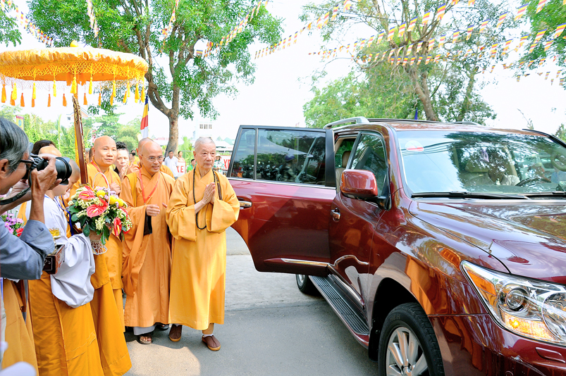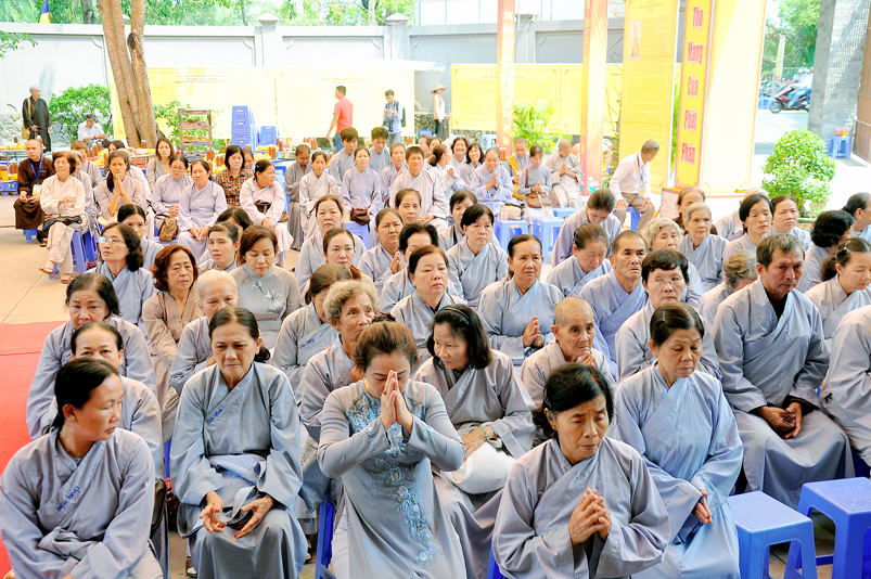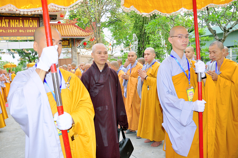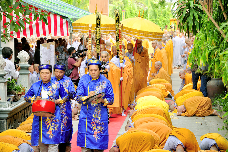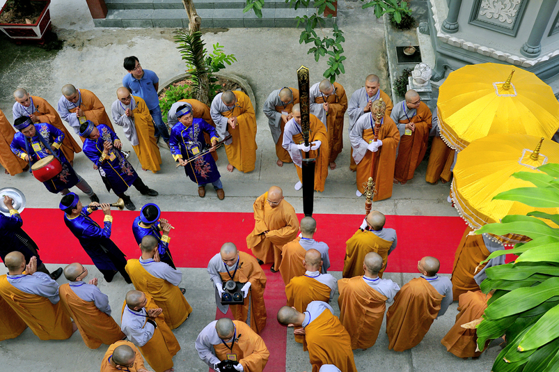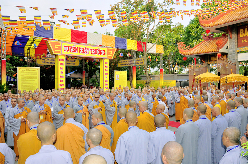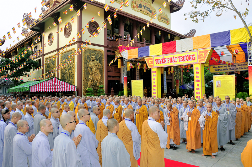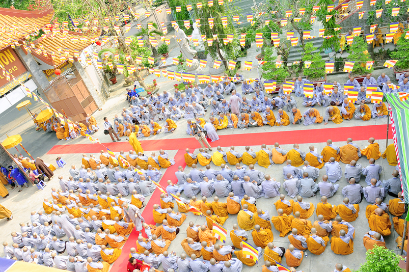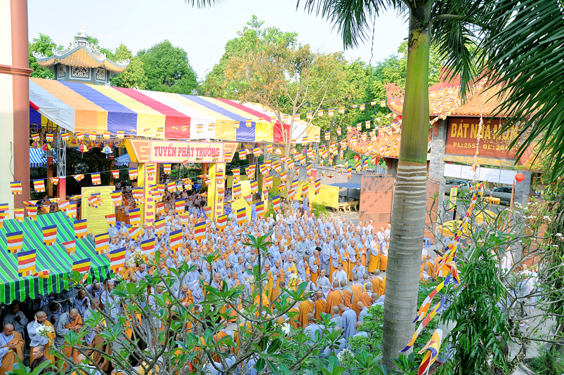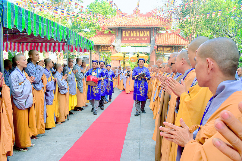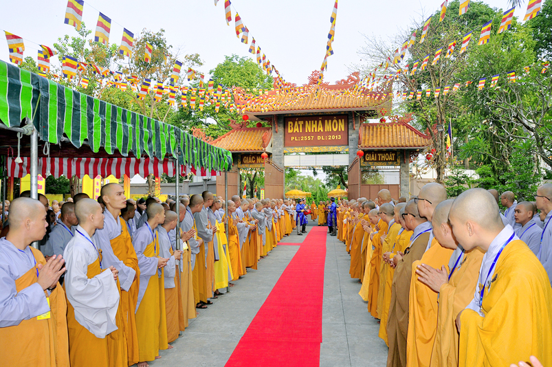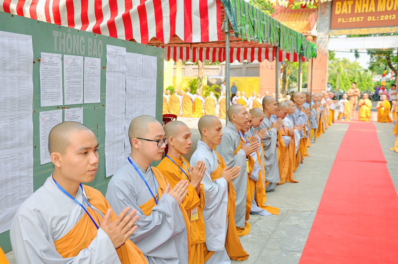 Vào lúc 7g, Ban Tổ chức đã trang nghiêm đàn tràng với hơn 800 giới tử nhất tâm cung đón chư Tôn đức Giáo phẩm TW, thành phố Hồ Chí Minh, chư Tôn đức Giáo phẩm tỉnh Long An, chư Tôn đức tỉnh thành bạn, chư Tôn đức Trưởng ban Trị sự liên huyện, chư Tôn đức trụ trì các tự viện trong và ngoài tỉnh, quý vị khách quý lãnh đạo các cấp chính quyền tỉnh quang lâm chứng dự Đại Giới Đàn.