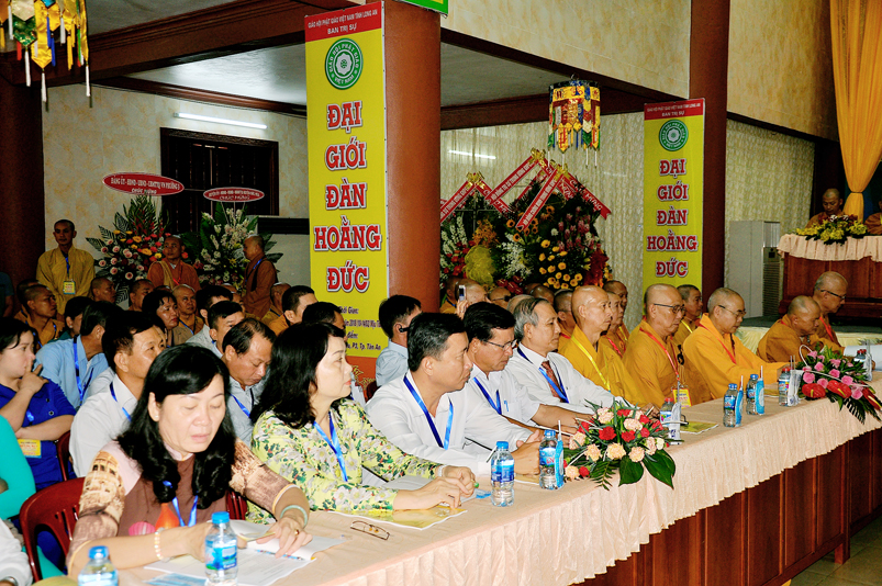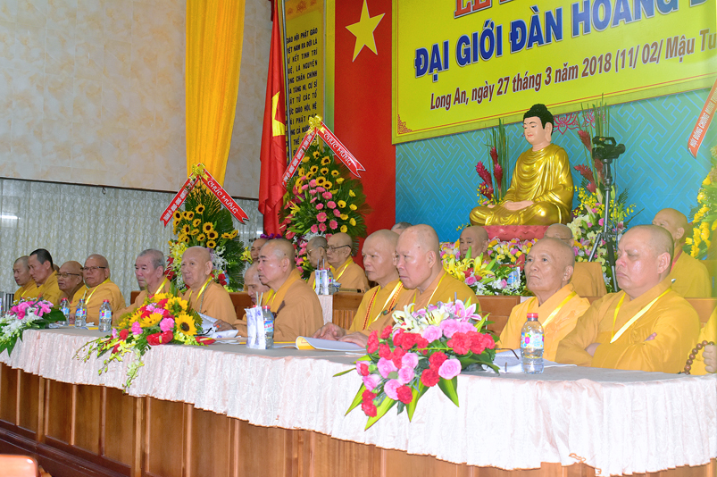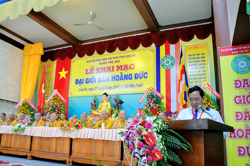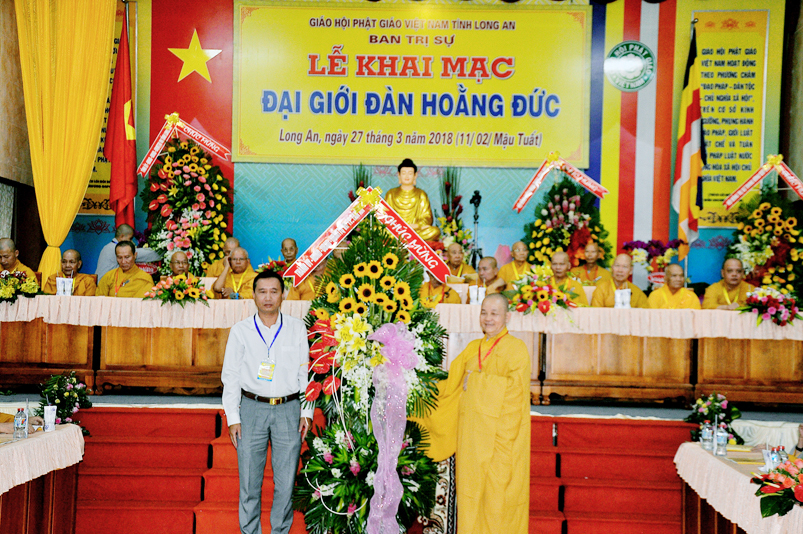 Tham dự lễ khai mạc, Lãnh đạo chính quyền Tp. Tân An, tỉnh Long An, Ông Huỳnh Văn Thừng- Phó Giám đốc Sở Nội Vụ- Trưởng Ban Tôn giáo tỉnh Long An phát biểu, trân trọng ghi nhận, ca ngợi Phật sự lớn lao của tỉnh Long An trong năm 2018. Để đào tạo thế hệ Phật giáo kế thừa, Ban Trị sự GHPGVN Long An đã tổ chức Đại Giới Đàn Hoằng Đức. Đây là việc làm có ý nghĩa truyền thừa quý báu, Lãnh đạo các cấp chính quyền, Ban Tôn giáo tỉnh Long An vô cùng phấn khởi trước những thành tựu tốt đẹp mà Phật giáo tỉnh nhà đã góp phần trang nghiêm Giáo hội, thực hiện đúng theo tinh thần hòa hợp Đạo pháp – Dân tộc đồng hành phát triển.