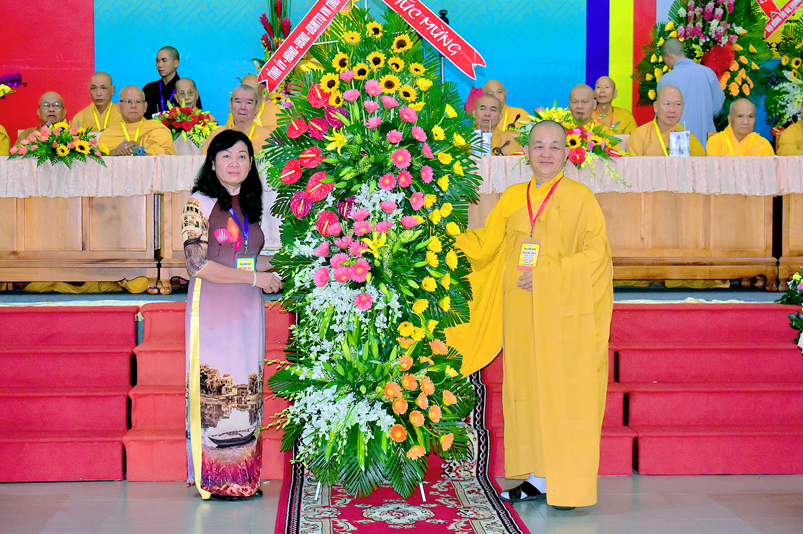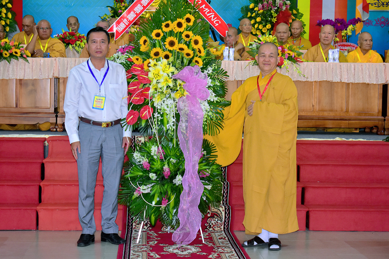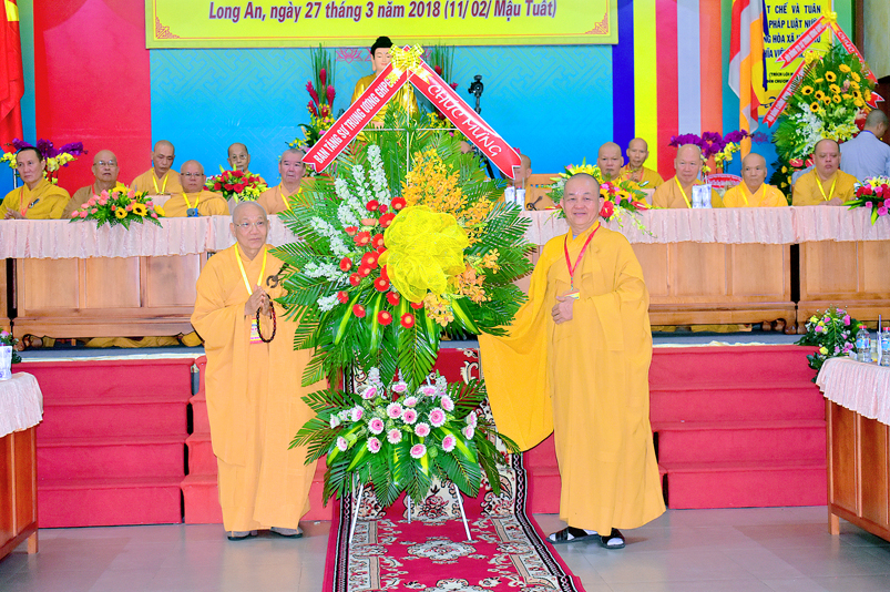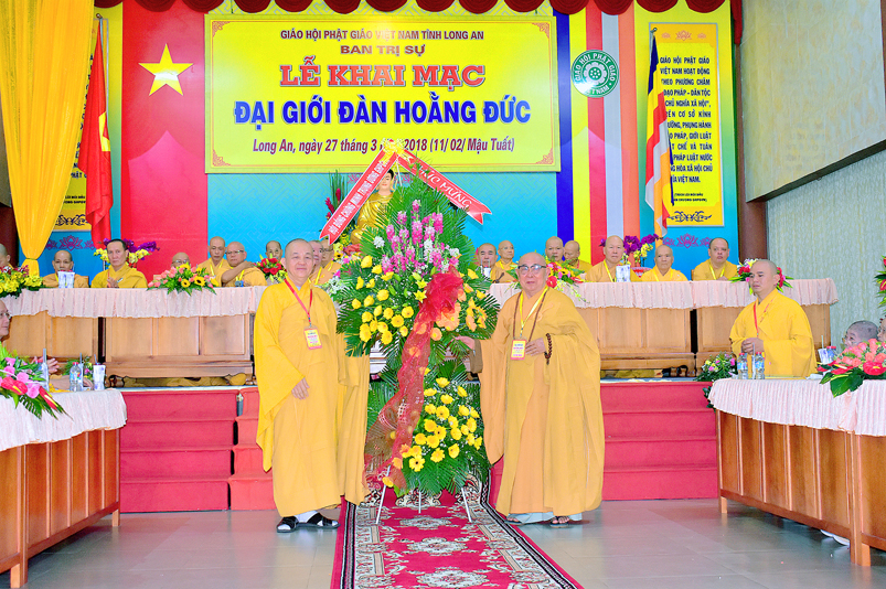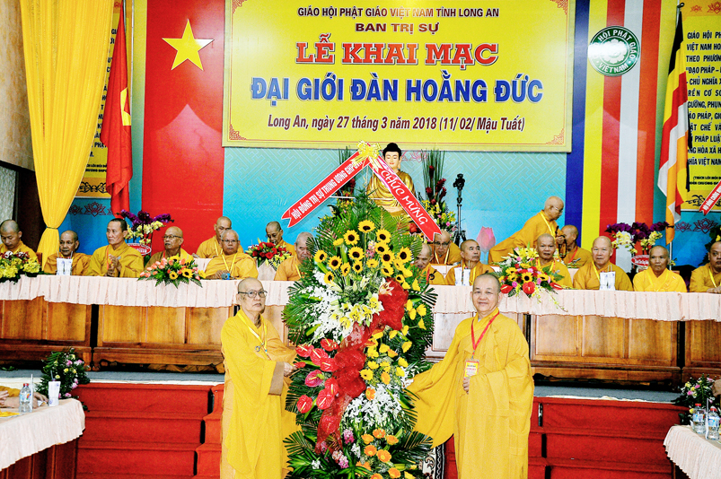 Tiếp theo, Ban tổ chức hoan hỷ tiếp nhận những lẵng hoa tươi thắm của quý chư Tôn đức Hội đồng chứng minh GHPGVN; chư Tôn đức HĐ Trị sự GHPGVN; chư Tôn đức Ban Tăng Sự TW; Quý quan khách lãnh đạoTỉnh ủy HĐND-UBND tỉnh Long An; Thành ủy HĐND, UBND Tp. Tân An …với hơn 70 lẵng hoa trao tặng chúc mừng ngày khai mạc.