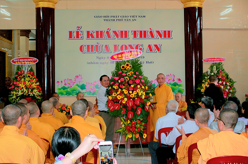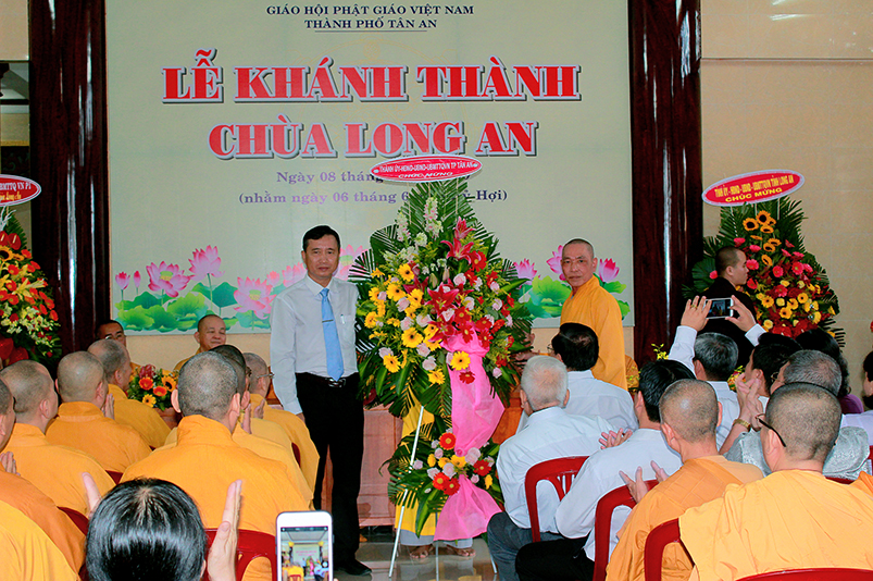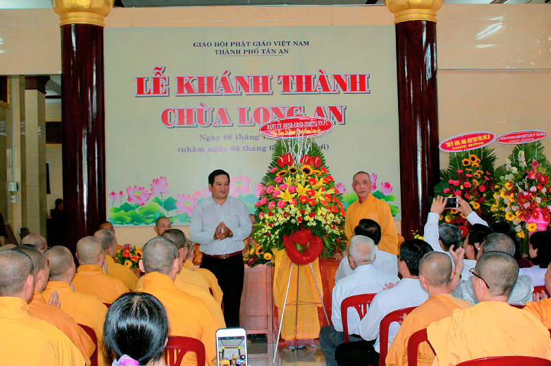 Ông gởi lời chúc mừng nồng nhiệt nhất đến Đại Lễ . Việc xây dựng lại ngôi Tam Bảo chùa Long An là việc làm rất cần thiết, để giải quyết việc chùa bị xuống cấp quá nhiều, đáp ứng sự tu học của tín đồ Phật tử. Ông ghi nhận và đánh giá cao những việc làm của Phật giáo đóng góp cho tỉnh nhà rất nhiều chương trình lợi đạo ích đời, Phật giáo luôn đồng hành cùng Dân tộc. Ông rất vui mừng cho sự thành tựu tốt đẹp của ngôi tam bảo Long An này.