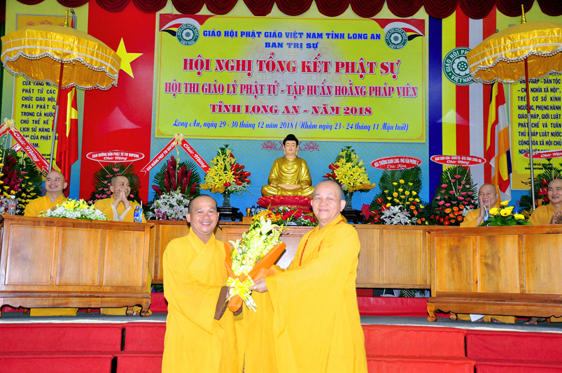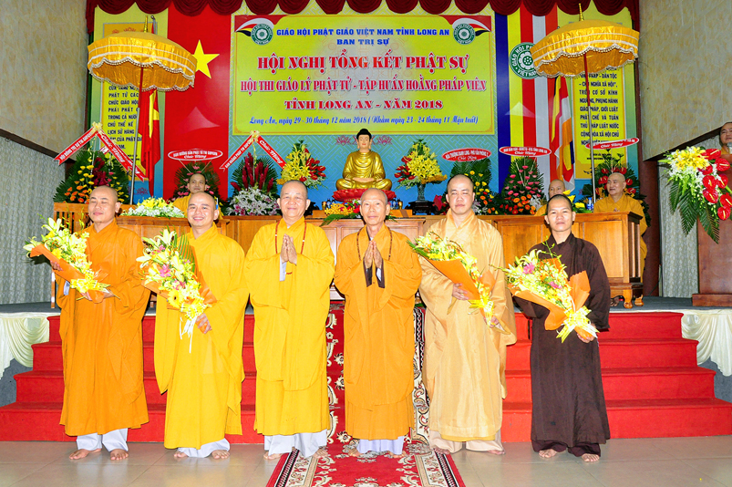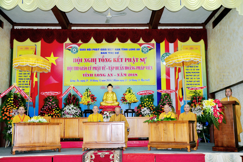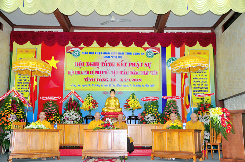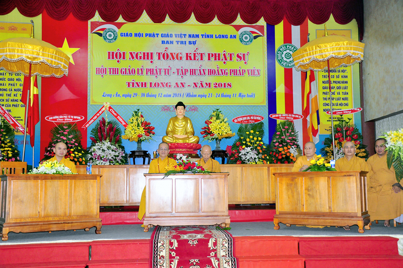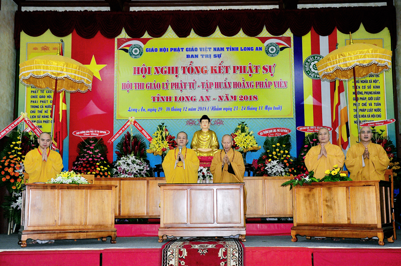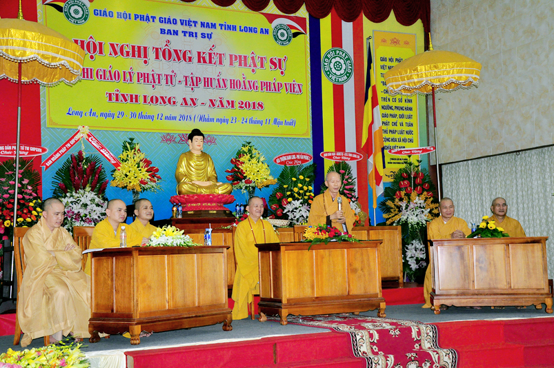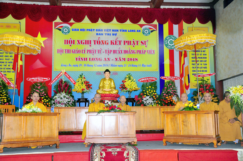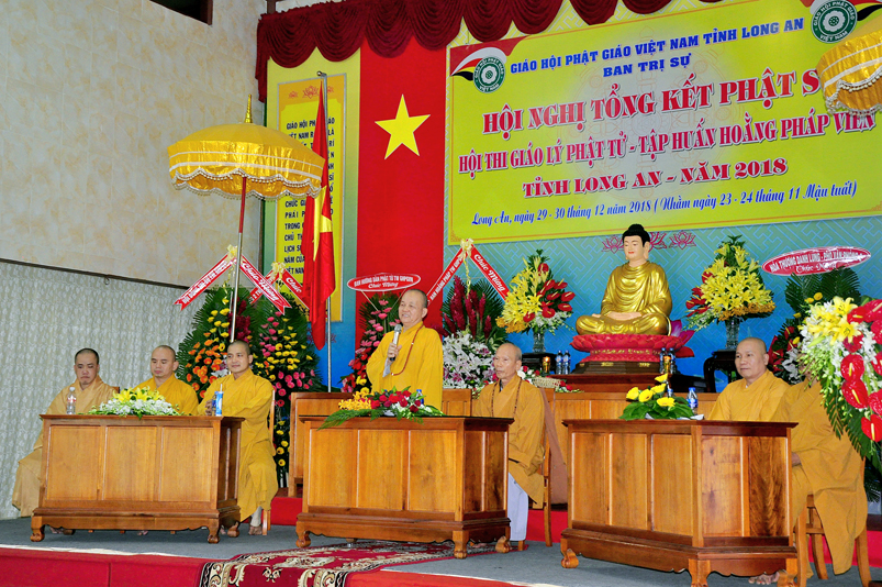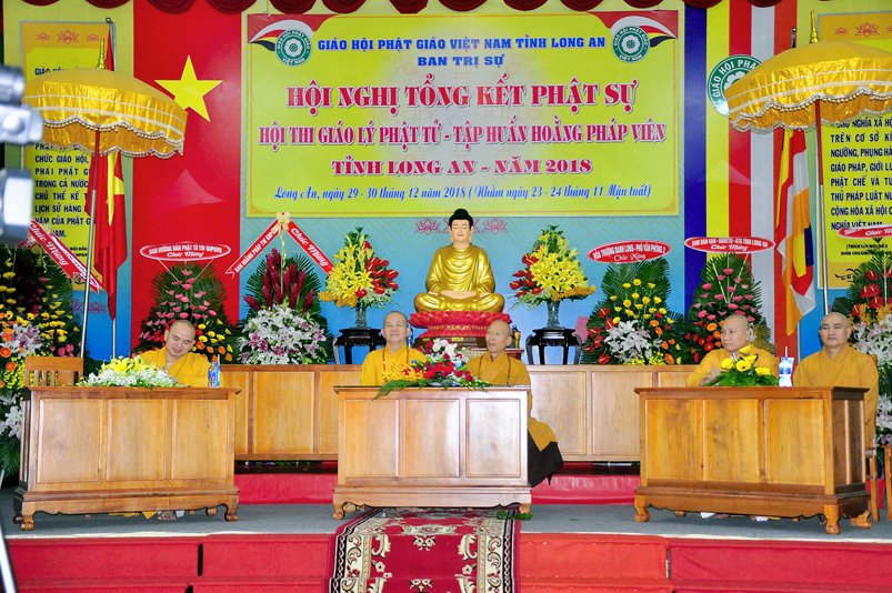 Tiếp nối phần báo cáo tổng kết hội thi của ban tổ chức, là lời đạo từ của HT. Thích Minh Thiện. Lời đầu tiên, Hòa Thượng xin phép được thông qua mạng truyền thông, toàn thể Tăng Ni cùng Phật tử tỉnh Long An, xin hướng tâm về đức Hoà thượng chủ tịch HĐTS GHPGVN, đức Hòa thượng phó chủ tịch thường trực HĐTS GHPGVN, cùng chư tôn Hòa thượng phó chủ tịch HĐTS trong ban thường trực TƯ GHPGVN, kính gởi lời tri ân sâu sắc nhất, đến chư tôn đức hằng quan tâm động viên khích lệ để BTS GHPGVN tỉnh Long An hoàn thành tốt công tác Phật sự năm 2018, trong đó có chương trình tổng kết Phật sự, hội thi giáo lý và khóa tập huấn hoằng pháp viên. Hòa thượng cũng gởi lời trân trọng tri ân chư tôn đức trong ban CM BTS GHPGVN tỉnh Long An, ban thường trực BTS GHPGVN tỉnh Long An, thường trực các đơn vị huyện, thị, thành phố trực thuộc BTS GHPGVN tỉnh Long An. Hòa thượng cũng gởi lời tán thán công đức Tăng Ni trụ trì các tự viện đã nhiệt tình hưởng ứng các Phật sự tại tỉnh nhà, đặc biệt đã nhiệt tình tham gia tổ chức các đạo tràng tu học, các lớp giáo lý, đã hướng dẫn niềm tin chánh tín cho các Phật tử tại 299 đạo tràng, trên 315 ngôi tự viện, hơn 1600 Tăng Ni, hơn 200.000 Phật tử có chánh tín trong tỉnh Long An. Hòa thượng khen ngợi tinh thần ham tu ham học, chịu khó nghiên cứu học hỏi giáo lý của các Phật tử, và sự chia sẽ những thành quả mà mình đạt được đến gia đình, người thân và bạn bè thân thuộc. Qua đây, Hòa thượng mong rằng tất cả người Việt Nam đều được thấm nhuần đạo đức Phật giáo, hầu giảm bớt những nổi khổ niềm đau trong cuộc sống.