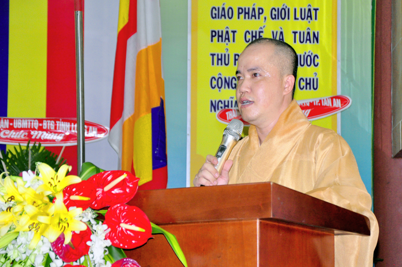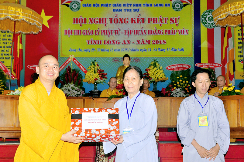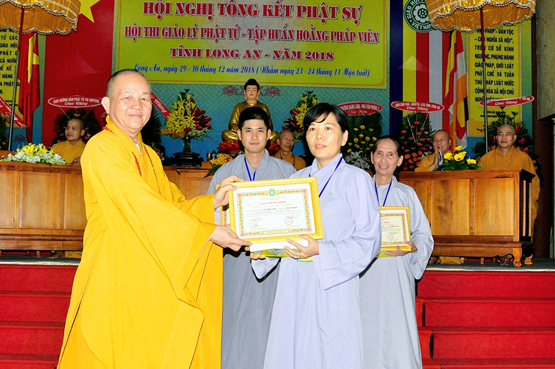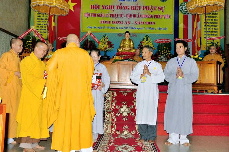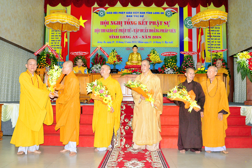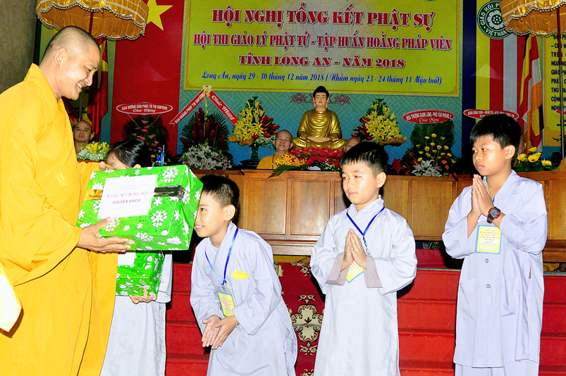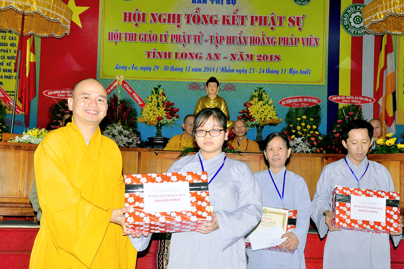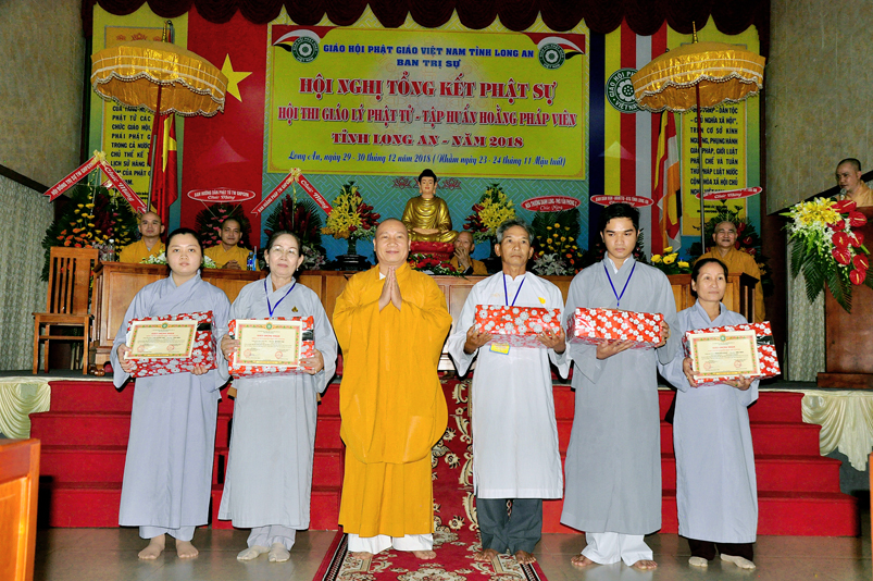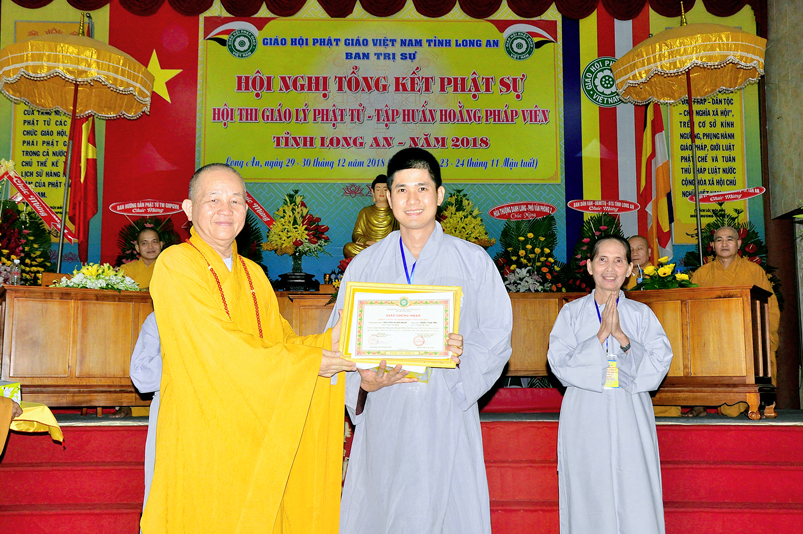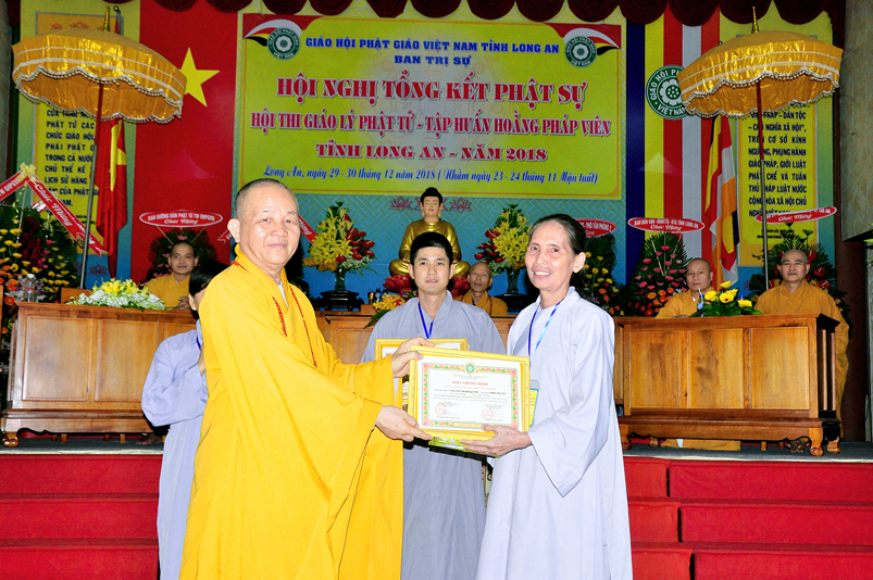 Tiếp nối phần báo cáo tổng kết hội thi của ban tổ chức, là lời đạo từ của HT. Thích Minh Thiện. Lời đầu tiên, Hòa Thượng xin phép được thông qua mạng truyền thông, toàn thể Tăng Ni cùng Phật tử tỉnh Long An, xin hướng tâm về đức Hoà thượng chủ tịch HĐTS GHPGVN, đức Hòa thượng phó chủ tịch thường trực HĐTS GHPGVN, cùng chư tôn Hòa thượng phó chủ tịch HĐTS trong ban thường trực TƯ GHPGVN, kính gởi lời tri ân sâu sắc nhất, đến chư tôn đức hằng quan tâm động viên khích lệ để BTS GHPGVN tỉnh Long An hoàn thành tốt công tác Phật sự năm 2018, trong đó có chương trình tổng kết Phật sự, hội thi giáo lý và khóa tập huấn hoằng pháp viên. Hòa thượng cũng gởi lời trân trọng tri ân chư tôn đức trong ban CM BTS GHPGVN tỉnh Long An, ban thường trực BTS GHPGVN tỉnh Long An, thường trực các đơn vị huyện, thị, thành phố trực thuộc BTS GHPGVN tỉnh Long An. Hòa thượng cũng gởi lời tán thán công đức Tăng Ni trụ trì các tự viện đã nhiệt tình hưởng ứng các Phật sự tại tỉnh nhà, đặc biệt đã nhiệt tình tham gia tổ chức các đạo tràng tu học, các lớp giáo lý, đã hướng dẫn niềm tin chánh tín cho các Phật tử tại 299 đạo tràng, trên 315 ngôi tự viện, hơn 1600 Tăng Ni, hơn 200.000 Phật tử có chánh tín trong tỉnh Long An. Hòa thượng khen ngợi tinh thần ham tu ham học, chịu khó nghiên cứu học hỏi giáo lý của các Phật tử, và sự chia sẽ những thành quả mà mình đạt được đến gia đình, người thân và bạn bè thân thuộc. Qua đây, Hòa thượng mong rằng tất cả người Việt Nam đều được thấm nhuần đạo đức Phật giáo, hầu giảm bớt những nổi khổ niềm đau trong cuộc sống.