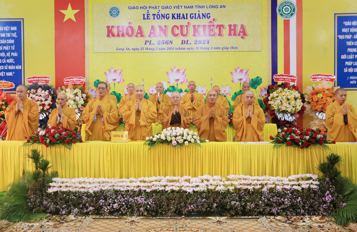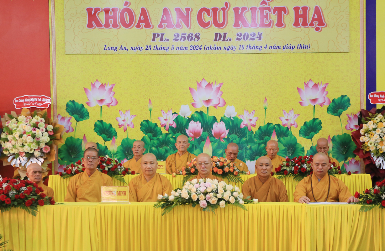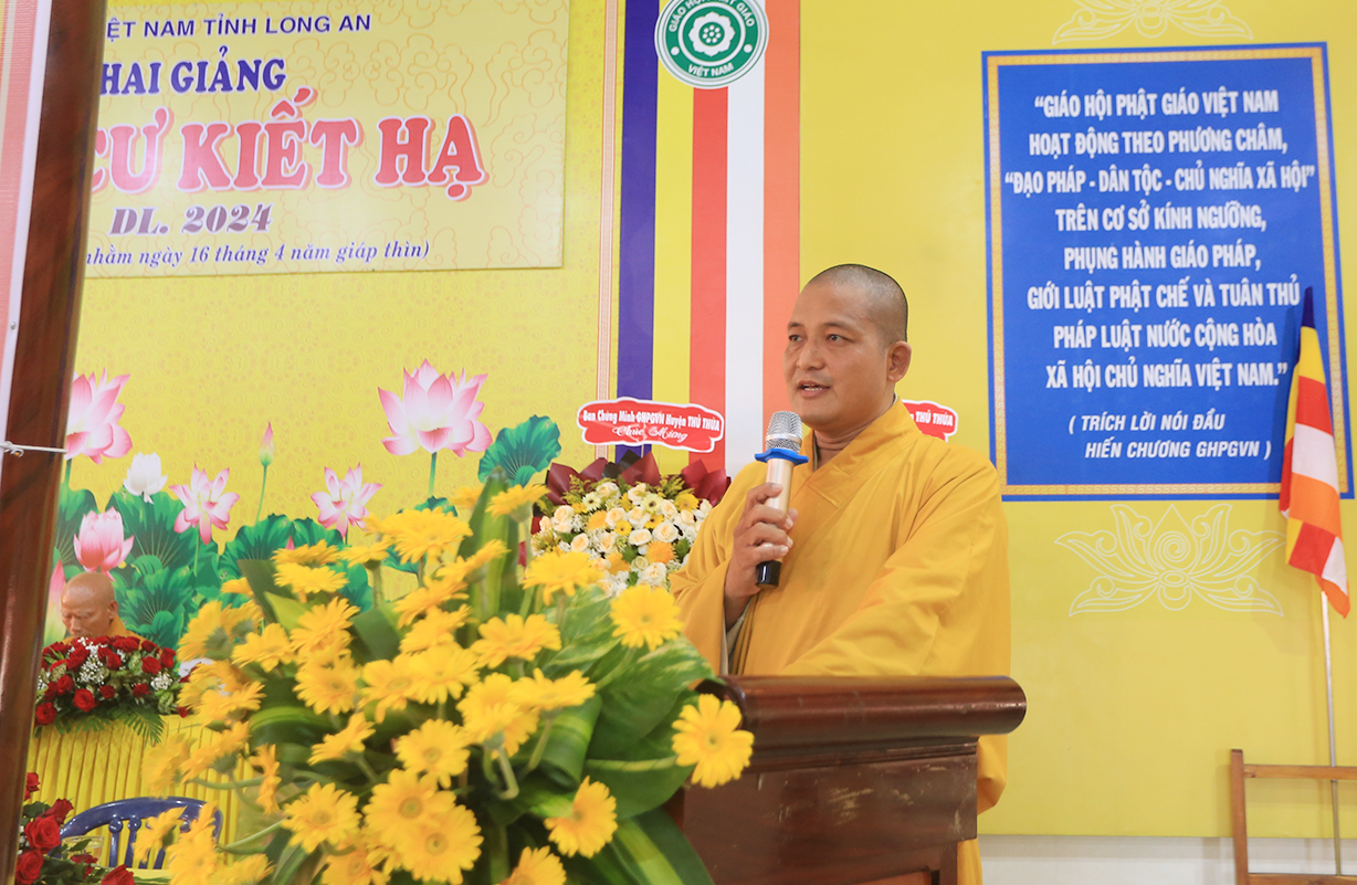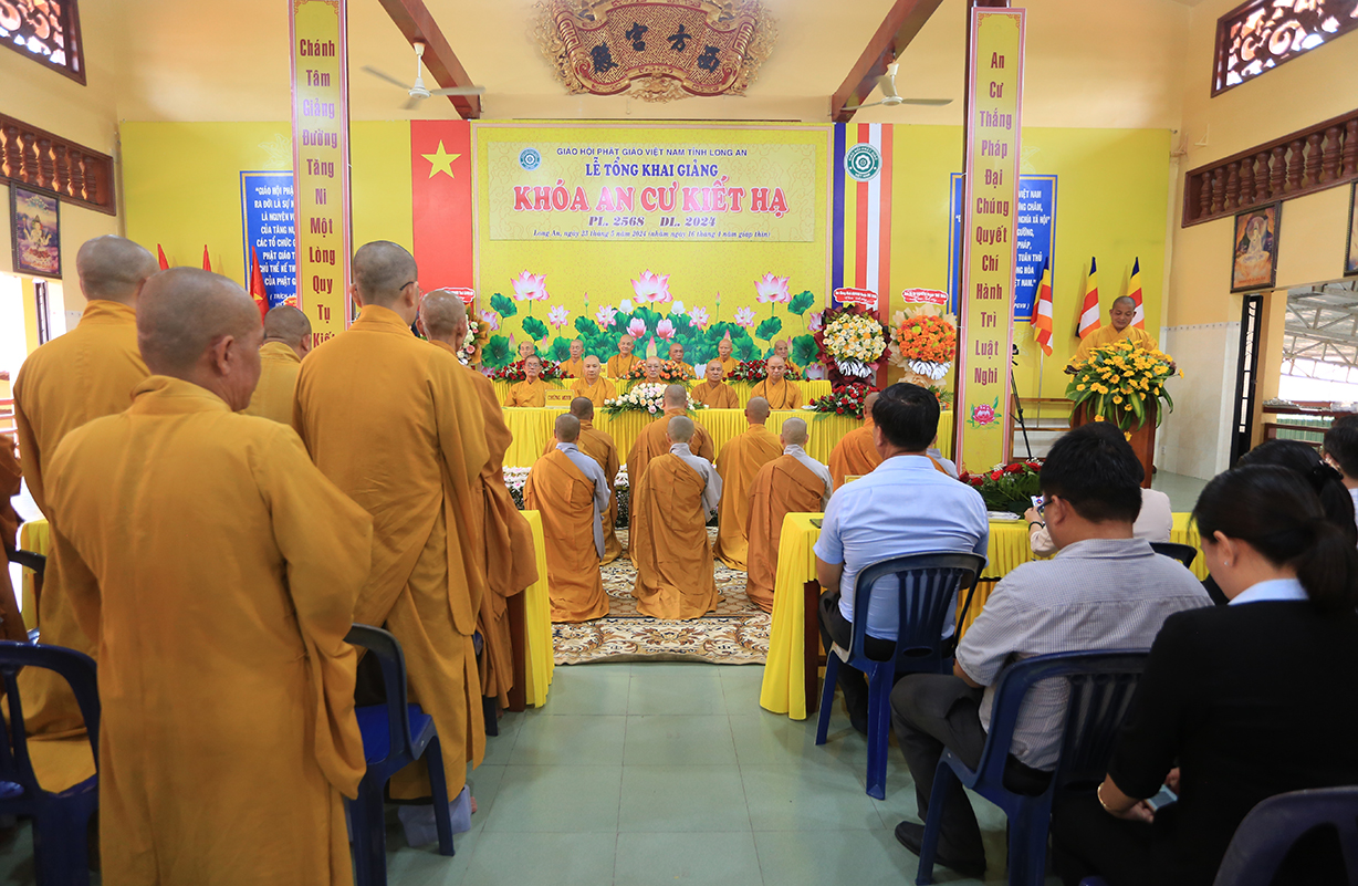Tại buổi lễ, Đại đức Thích Thiện Danh – Phó Thư ký kiêm Chánh Văn Phòng Ban Trị sự GHPGVN tỉnh Long An báo cáo công tác tổ chức Khoá An cư Kiết hạ Phật lịch 2568 – DL 2024. Đại đức Cung An chức sự Chư tôn đức Ban tổ chức Khóa An Cư Kiết Hạ năm 2024 của Ban Thường trực BTS GHPGVN tỉnh Long An. Theo báo cáo: Các trường hạ sẽ học các chuyên đề về Kinh – Luật – Luận, thực hiện Bố tát đầy đủ mỗi tháng 2 lần, Hành chánh Giáo hội, Bồi dưỡng Kiến thức Trụ trì, Luật Tín ngưỡng Tôn giáo …Được biết, mùa An cư kiết hạ năm nay, Phật giáo Long An tổ chức 13 điểm An cư Kiết hạ cho hơn 500 vị Tăng Ni trong tỉnh tu học