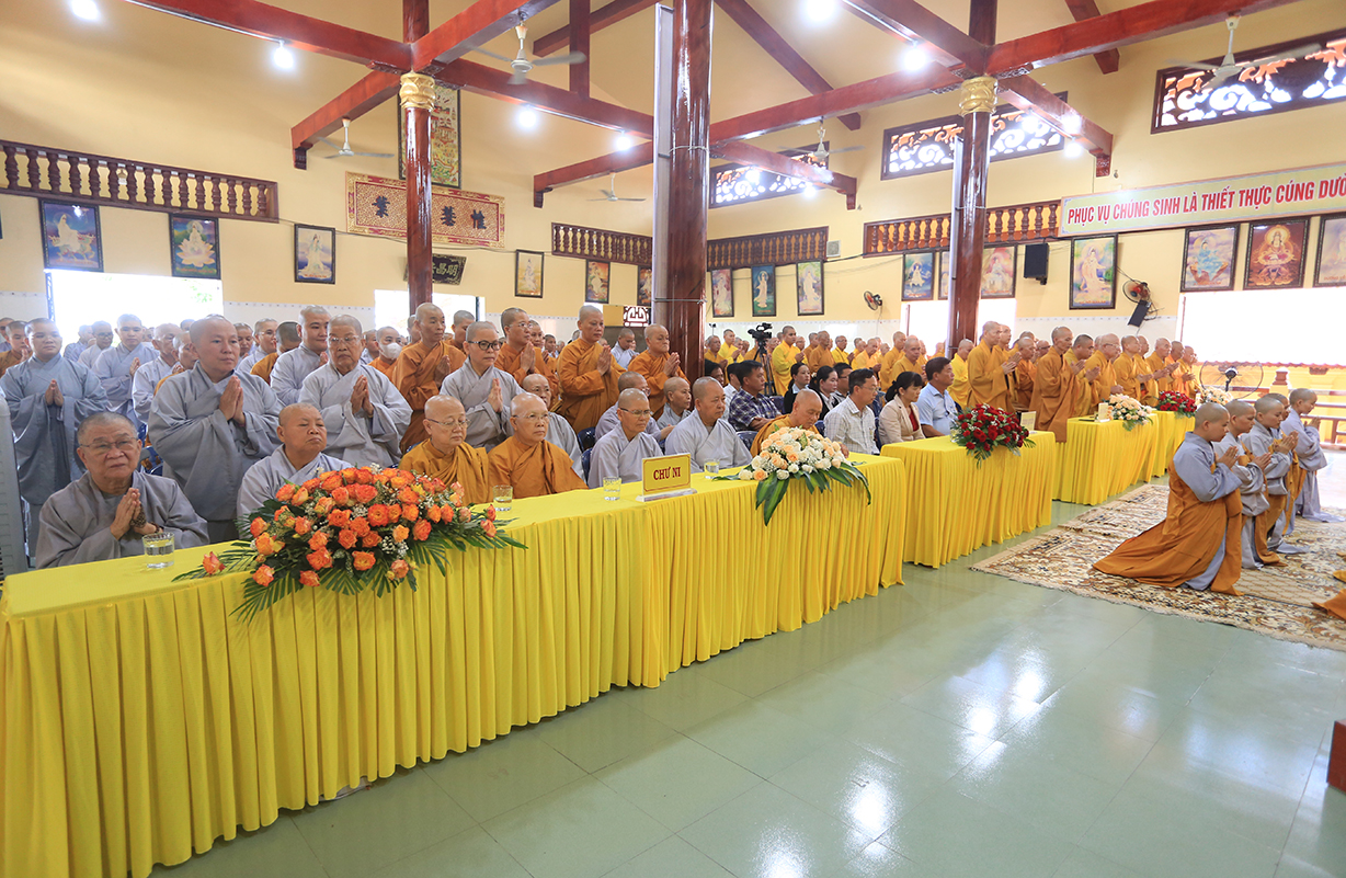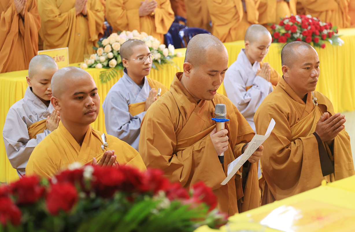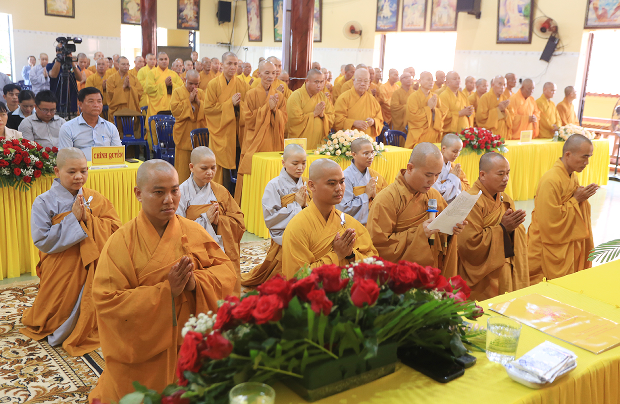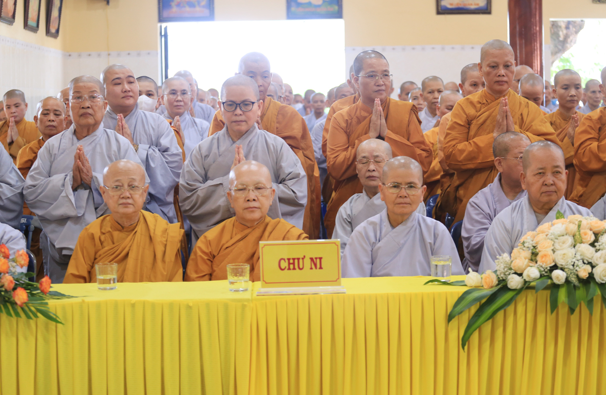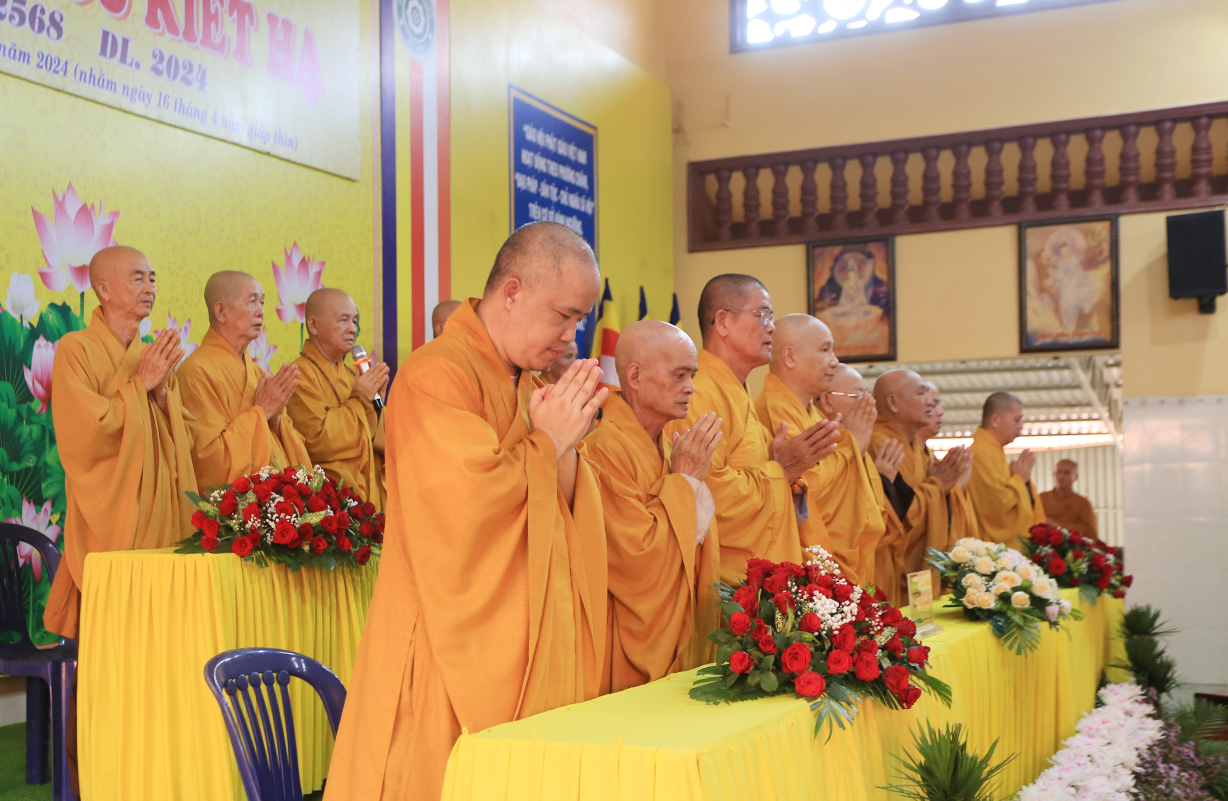 Lắng nghe qua đại diện BTC báo cáo tình hình ACKH trong tỉnh, lời phát nguyện tu học của hành giả tại trú xứ ACKH. Thay mặt Thường Trực Ban Trị sự tỉnh, Ban tổ chức Khóa An cư kiết hạ PL 2568, HT. Thích Minh Thiện chỉ đạo.