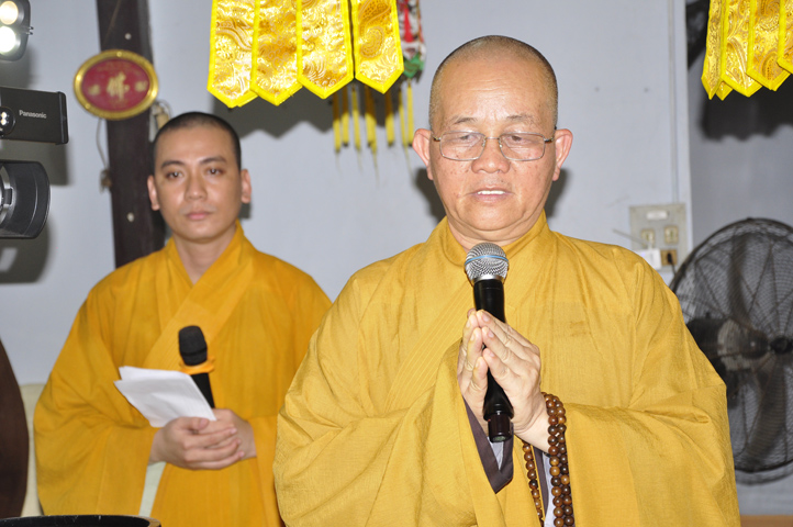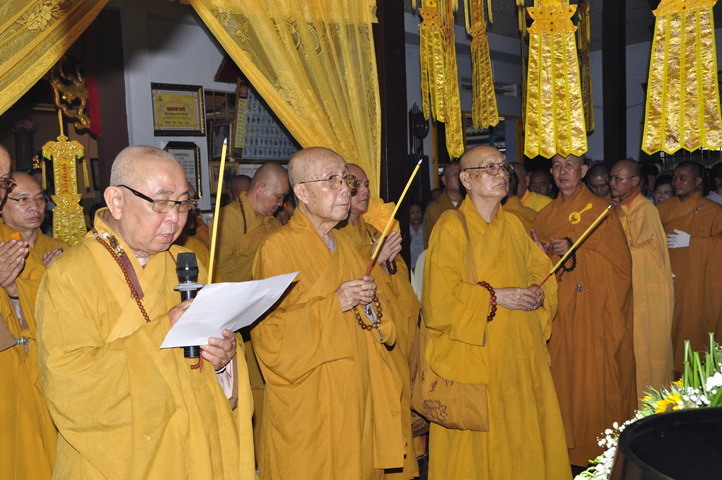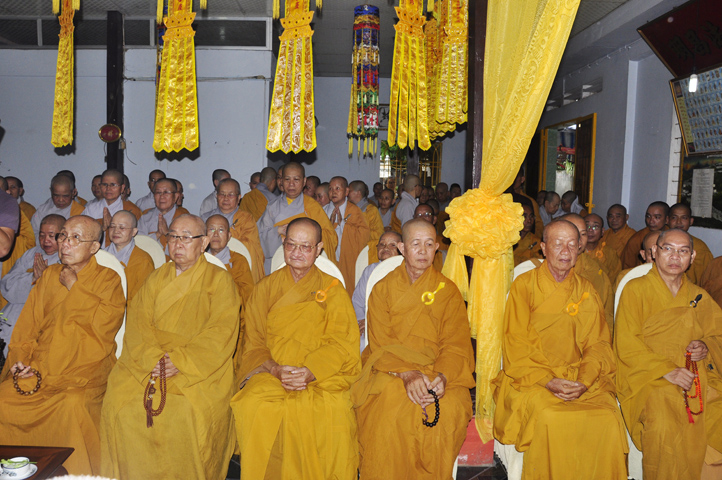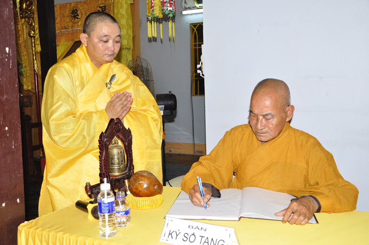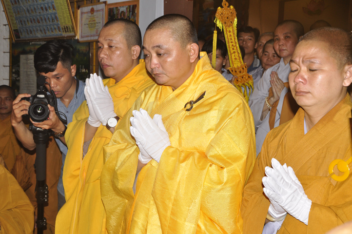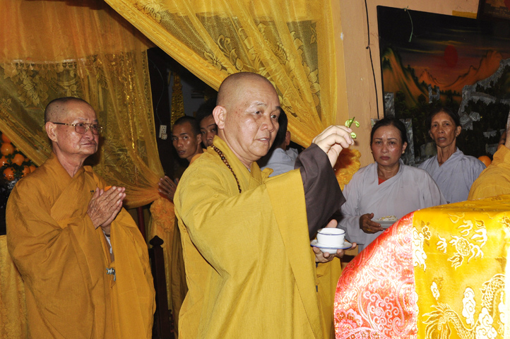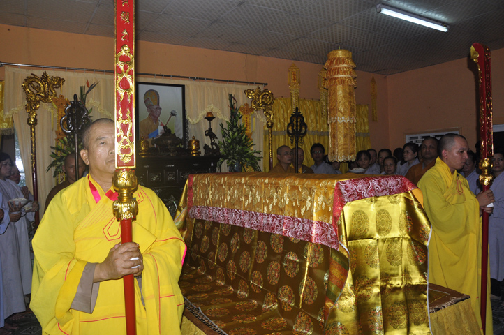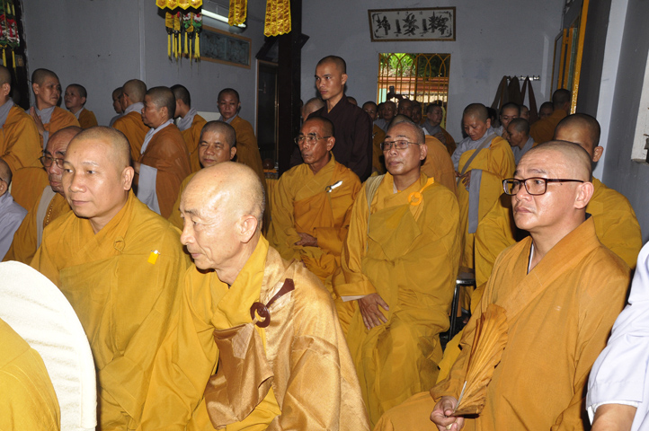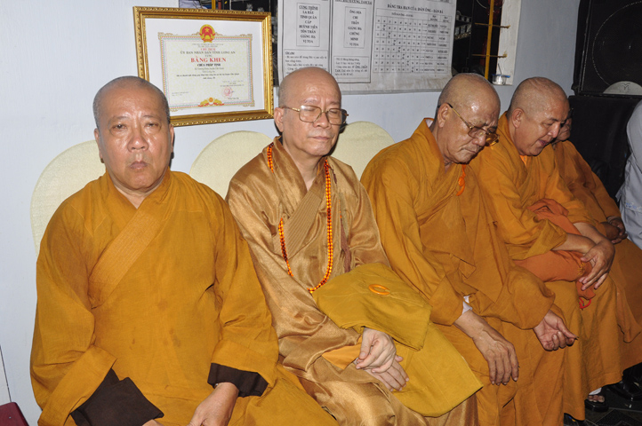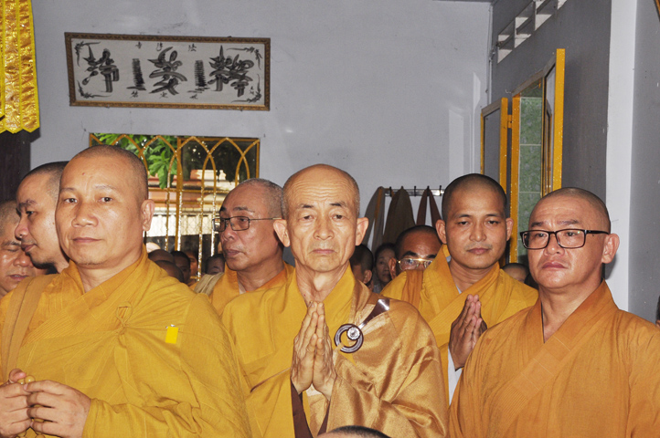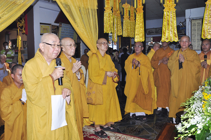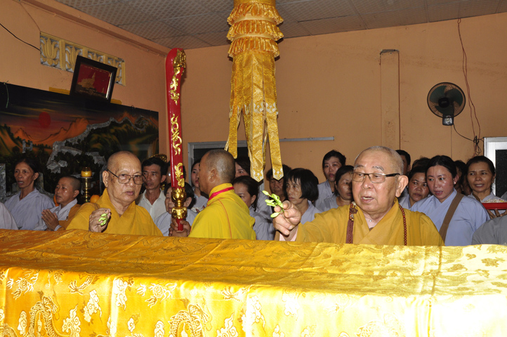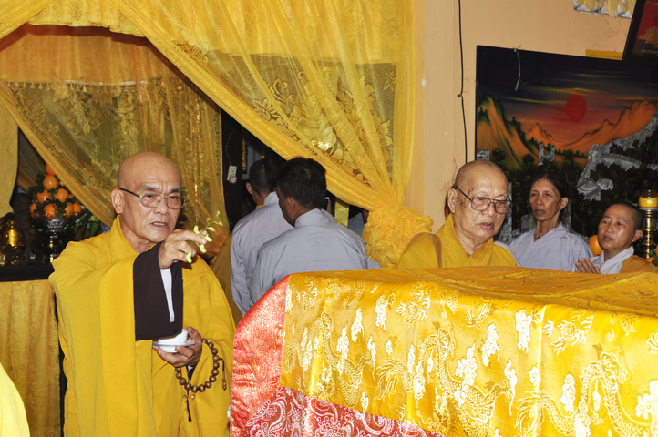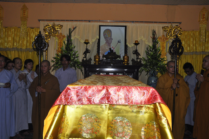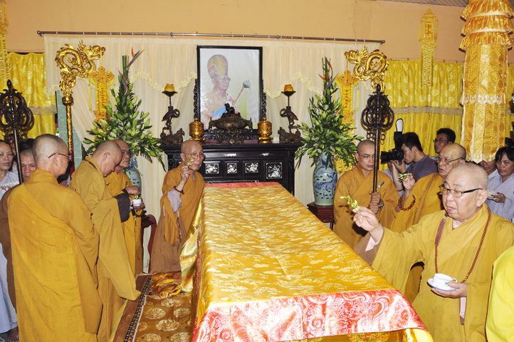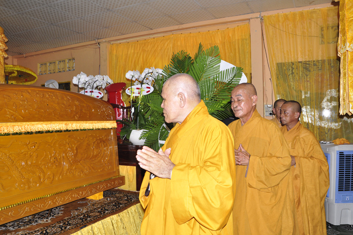 Tại Giác linh đài, trước sự chứng minh của chư Tôn đức, ĐĐ. Thích Lệ Trí – Chánh Thư ký Ban Trị sự GHPGVN tỉnh Long An kính tuyên công đức của cố Hòa thượng đã đồng hành góp phần trang nghiêm Giáo hội tỉnh nhà trong những thập niên qua. Tiếp theo, Đại đức cung thỉnh chư Tôn đức Giáo phẩm niêm hương, sái tịnh đàn tràng. Trong tiếng trống trầm hùng vang dội, môn nhân pháp quyến phụng thỉnh Nhục thân cố Hòa thượng nhập kim quan.