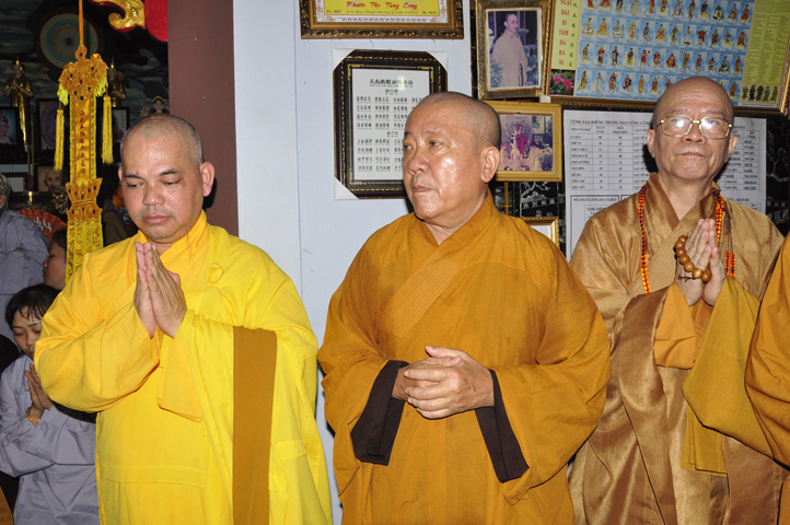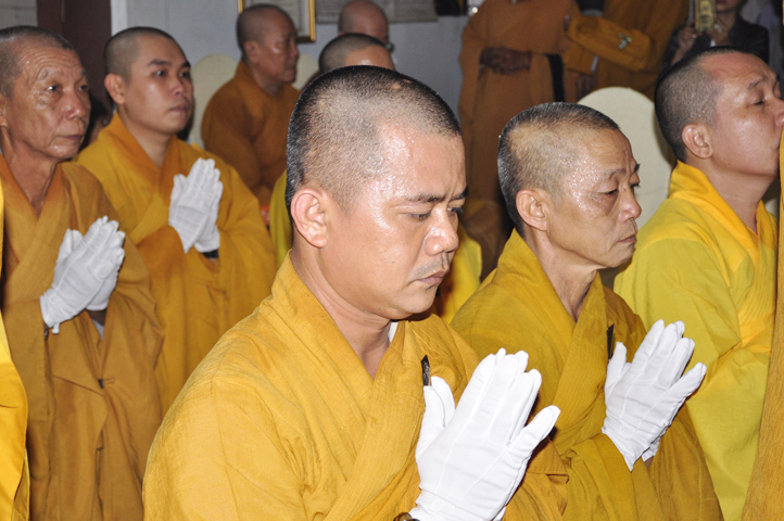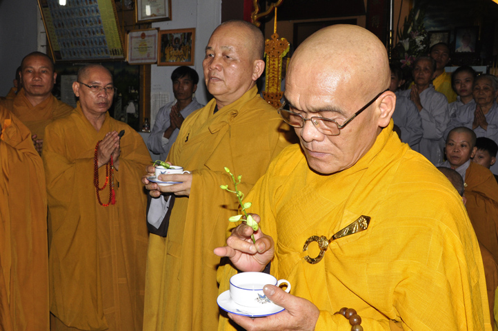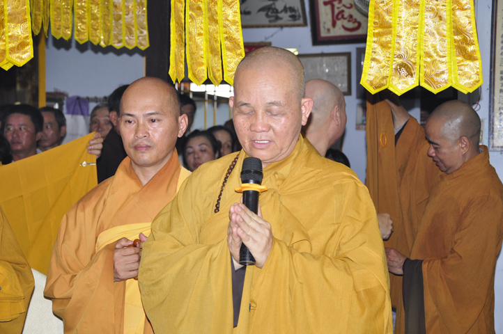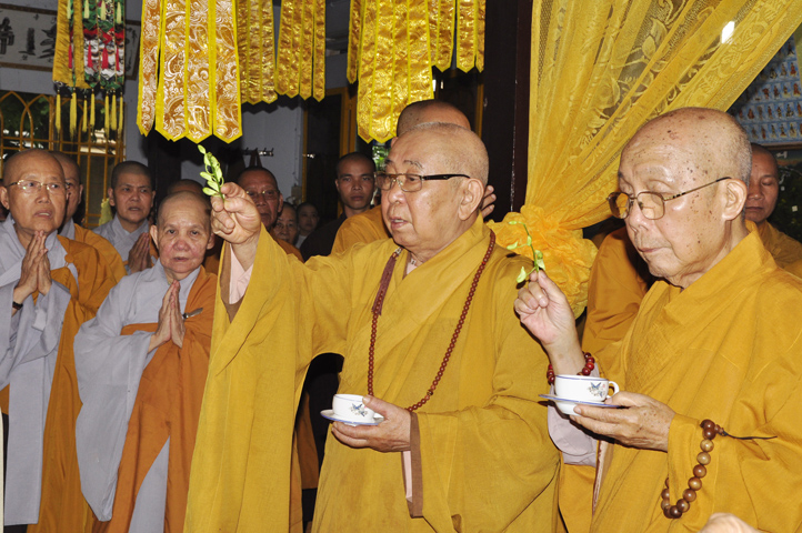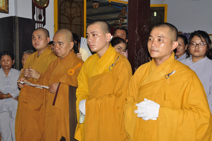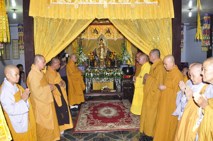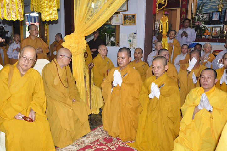 Đúng 13g, Ban nghi lễ cùng môn nhân pháp quyến vân tập tại phương trượng bạch thỉnh chư Tôn đức Giáo phẩm Ban Trị sự Phật giáo Thành hội: HT. Thích Thiện Tánh – Phó Chủ tịch HĐTS kiêm trưởng Ban pháp Kiểm soát GHPGVN; HT. Thích Tấn Đạt- Ủy viên thường trực HĐTSTƯ,Phó văn phòng 2 trung ương, Phó thường trực ban Hoằng pháp GHPGVN; HT.Thích Giác Liêm, Phó Chánh Văn phòng 2 T.Ư GHPGVN; HT.Thích Tịnh Hạnh – Phó ban Trị sự GHPGVN Tp. HCM ; HT. Thích Như Tín-Phó Ban trị sự kim Trưởng trưởng ban Kiểm soát GHPGVN thành phố HCM chư Tôn đức Giáo phẩm tỉnh Long An: HT. Thích Minh Thiện – Ủy viên HĐTS, Phó trưởng Ban Hoằng pháp TW, Trưởng Ban Trị sự GHPGVN tỉnh Long An; HT. Thích Huệ Bạch – Trưởng Ban Trị sự GHPGVN huyện Cần Giuộc; chư Tôn đức Tông phong Thiên Thai: HT. Thích Tắc Lãnh; HT. Thích Tắc Phi; HT. Thích Tắc Nhàn cùng chư Tôn đức Tăng Ni trụ trì các tự viện huyện thị trực thuộc tỉnh Long An quang lâm Giác linh đài chứng minh nghi thức nhập kim quan Cố Hòa thượng Thích Tắc Trụ.