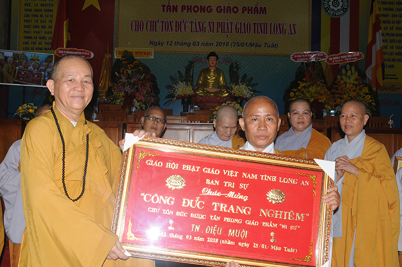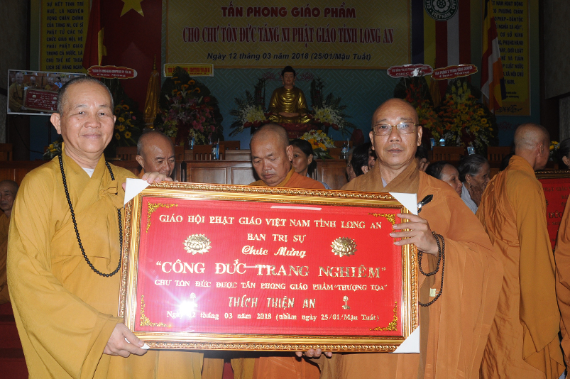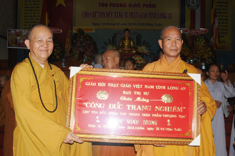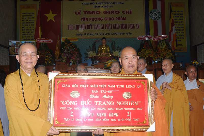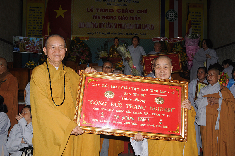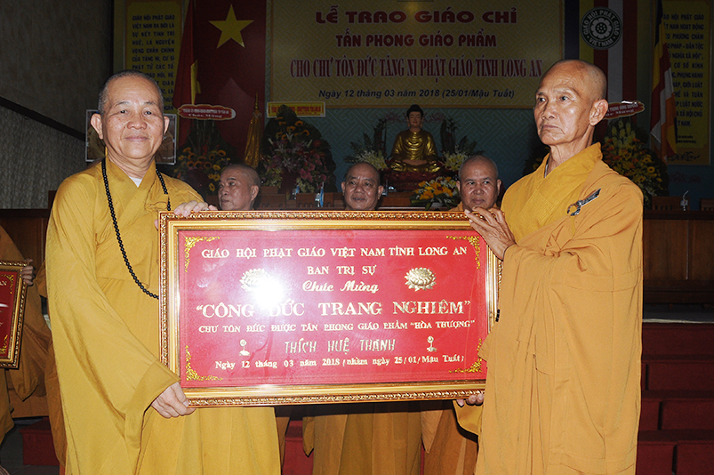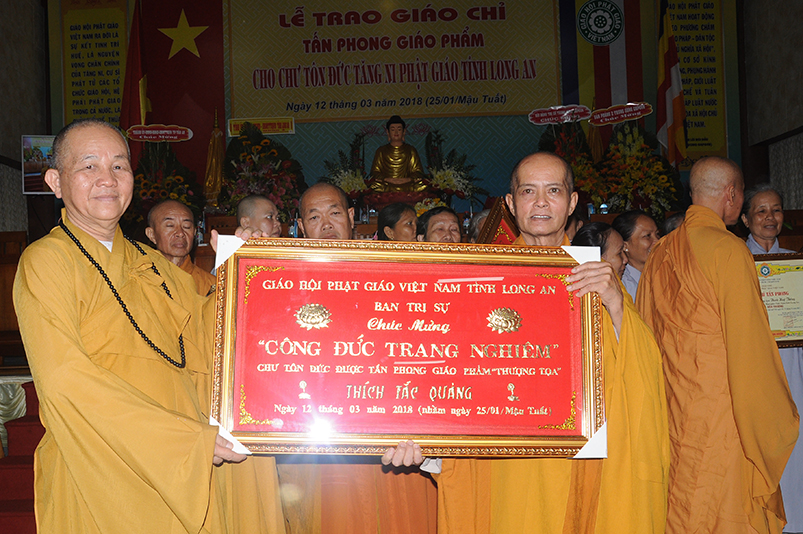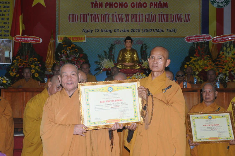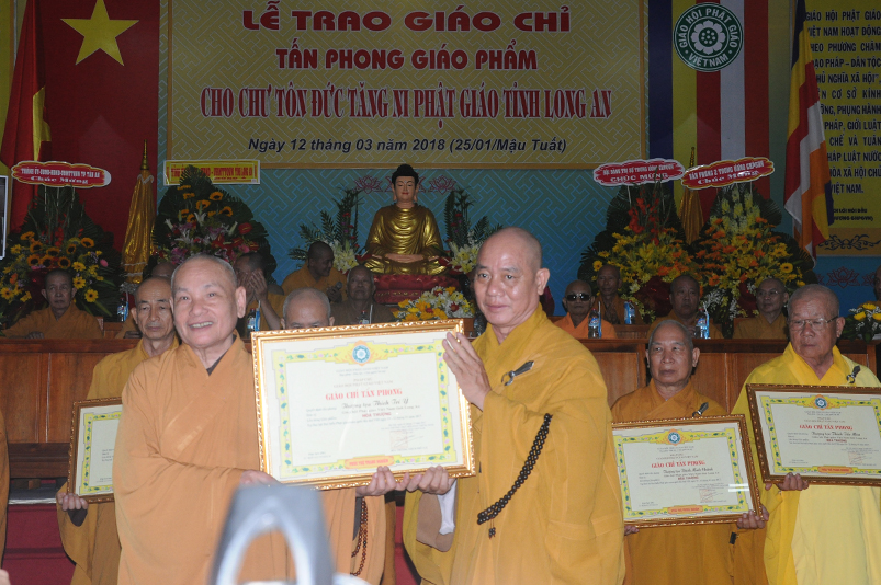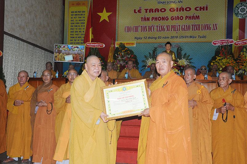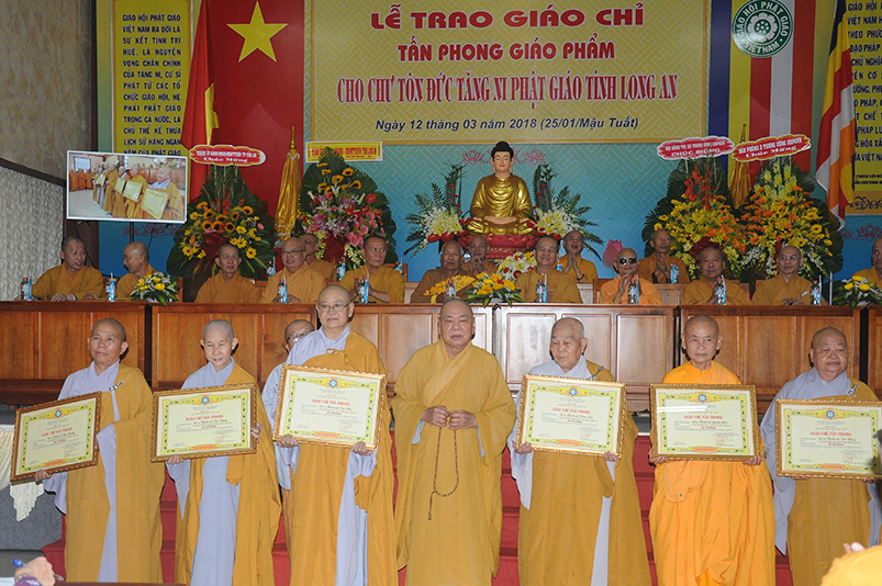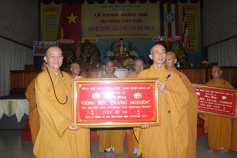 Tiếp theo, Ban Tổ chức cung thỉnh chư Tôn đức Giáo phẩm TW thân lâm trao bằng Giáo chỉ Tấn phong đến chư Tôn đức Tăng Ni tỉnh Long An: Trưởng lão HT. Thích Thiện Nhơn trao Giáo chỉ tấn phong hàng Giáo phẩm Hòa thượng; HT. Thích Thiện Pháp trao Giáo chỉ tấn phong hàng Giáo phẩm Thượng tọa và NT; HT. Thích Tấn Đạt trao Giáo chỉ tấn phong hàng Giáo phẩm NS.