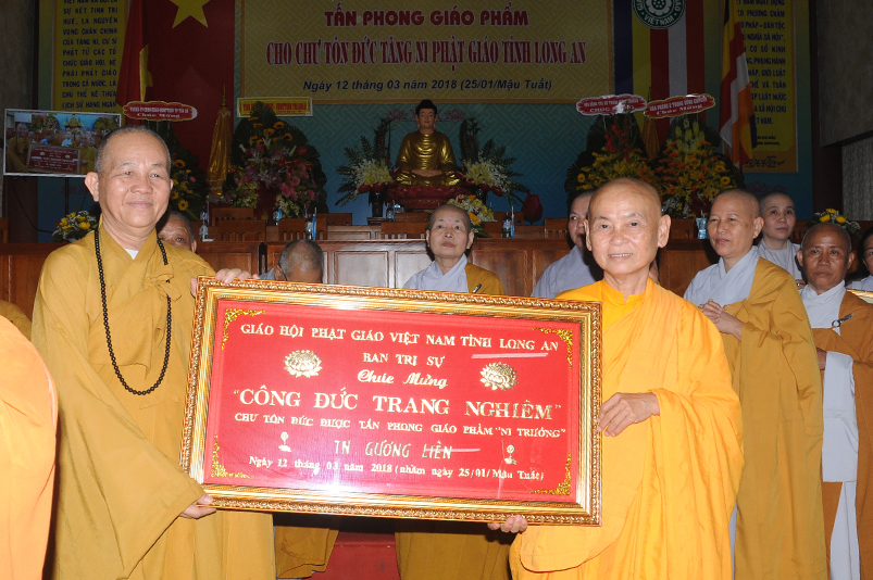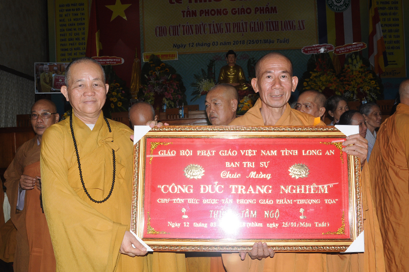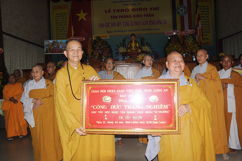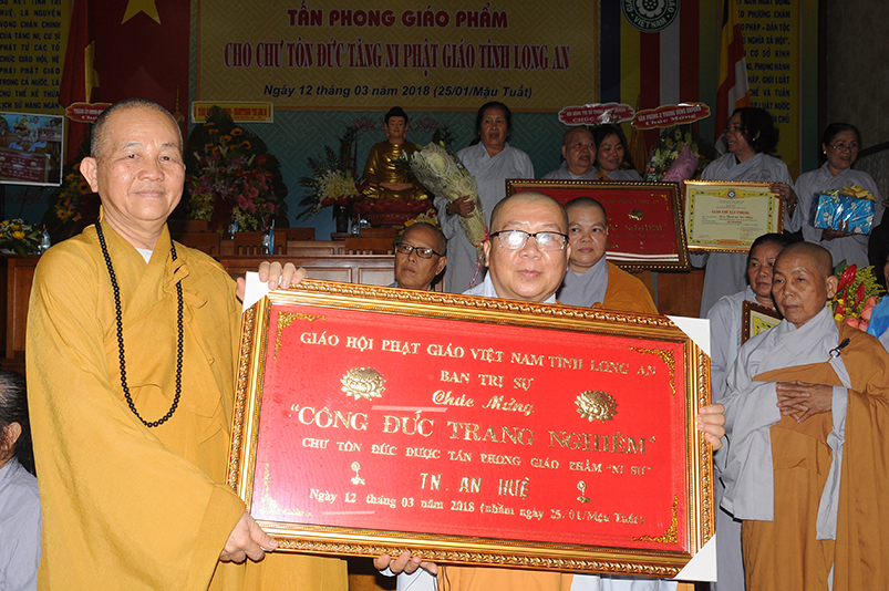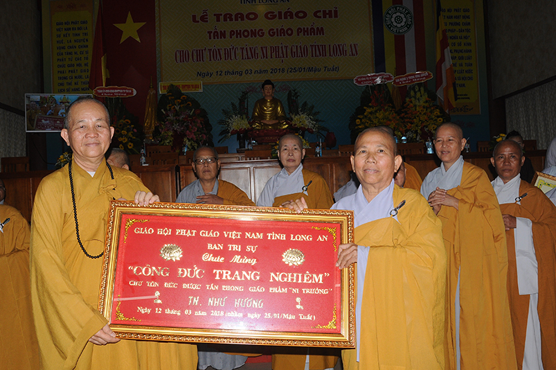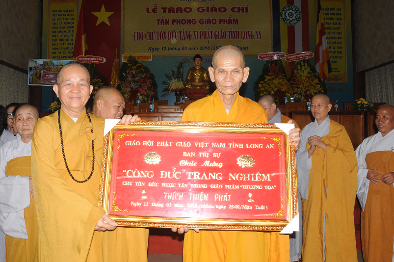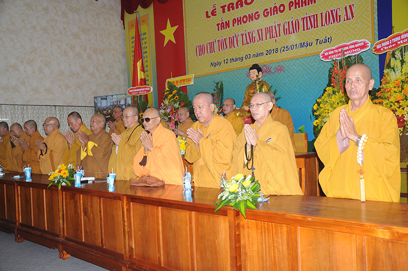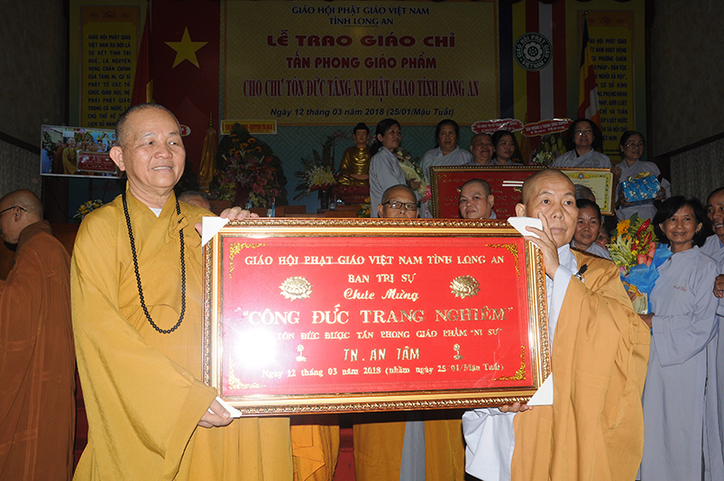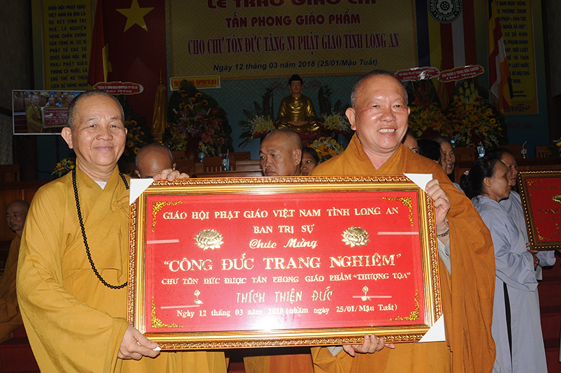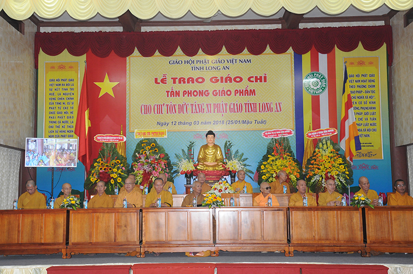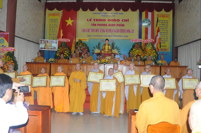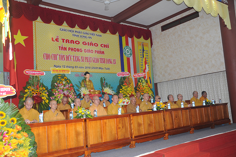 Tiếp theo, Ban Tổ chức cung thỉnh chư Tôn đức Giáo phẩm TW thân lâm trao bằng Giáo chỉ Tấn phong đến chư Tôn đức Tăng Ni tỉnh Long An: Trưởng lão HT. Thích Thiện Nhơn trao Giáo chỉ tấn phong hàng Giáo phẩm Hòa thượng; HT. Thích Thiện Pháp trao Giáo chỉ tấn phong hàng Giáo phẩm Thượng tọa và NT; HT. Thích Tấn Đạt trao Giáo chỉ tấn phong hàng Giáo phẩm NS.