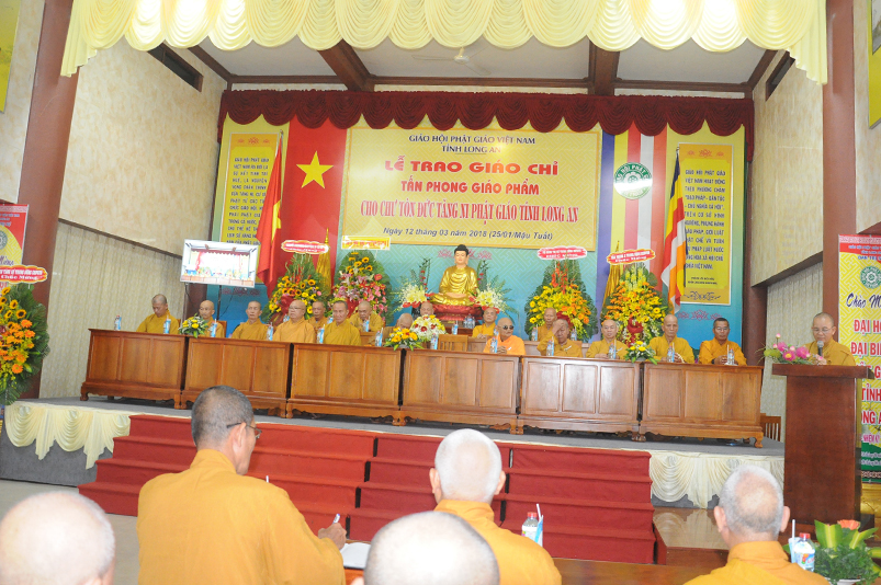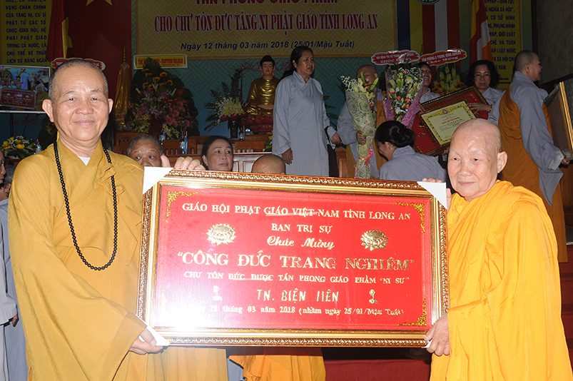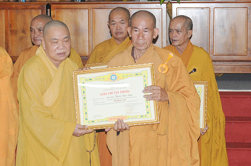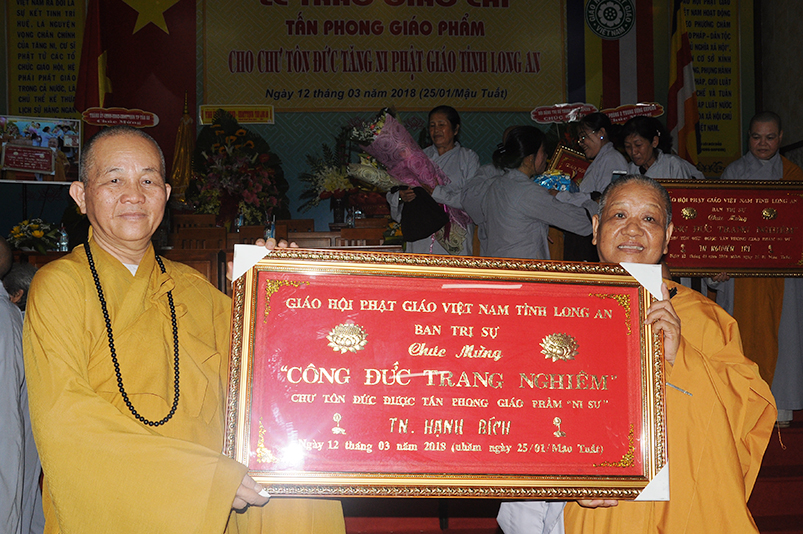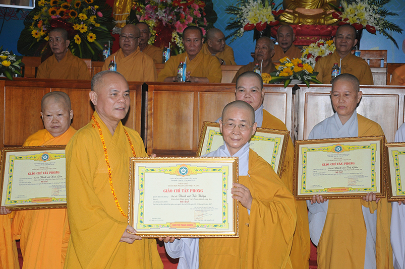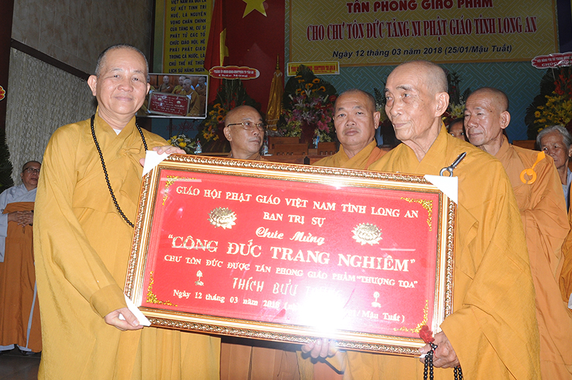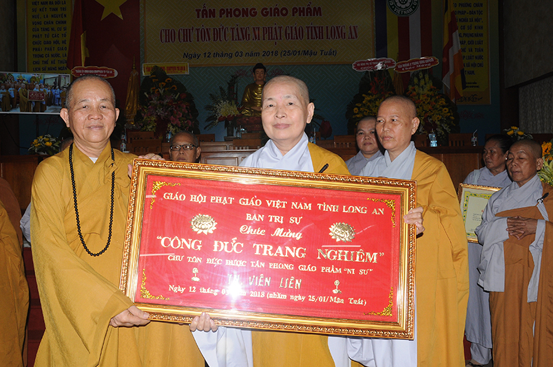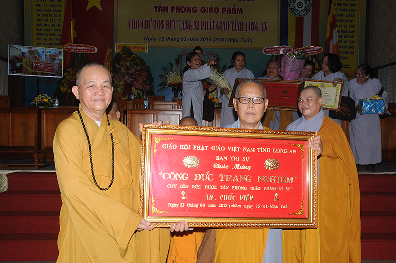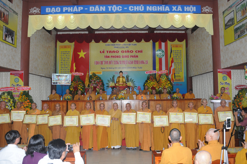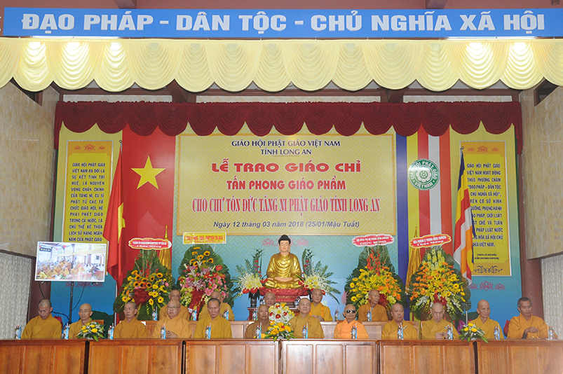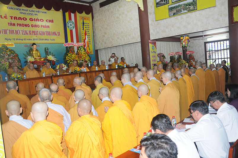 Tiếp theo, Ban Tổ chức cung thỉnh chư Tôn đức Giáo phẩm TW thân lâm trao bằng Giáo chỉ Tấn phong đến chư Tôn đức Tăng Ni tỉnh Long An: Trưởng lão HT. Thích Thiện Nhơn trao Giáo chỉ tấn phong hàng Giáo phẩm Hòa thượng; HT. Thích Thiện Pháp trao Giáo chỉ tấn phong hàng Giáo phẩm Thượng tọa và NT; HT. Thích Tấn Đạt trao Giáo chỉ tấn phong hàng Giáo phẩm NS.