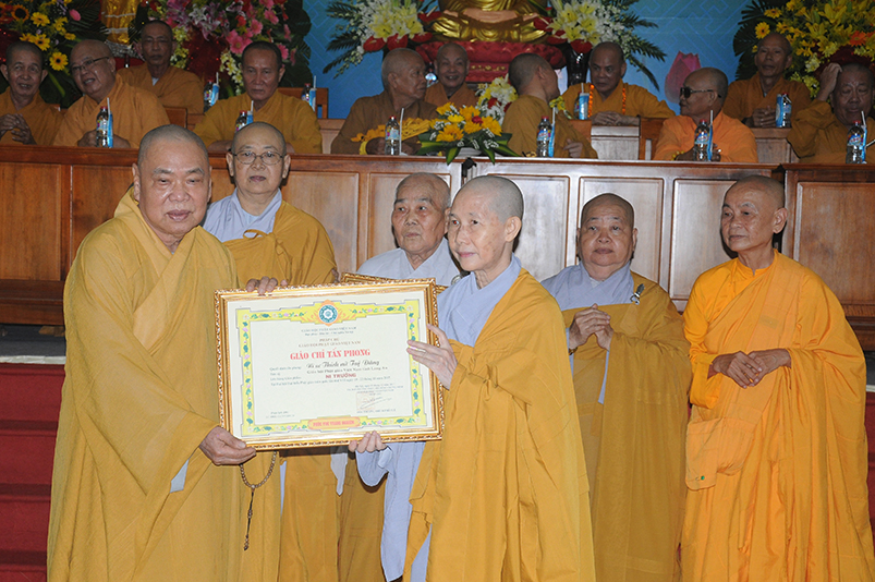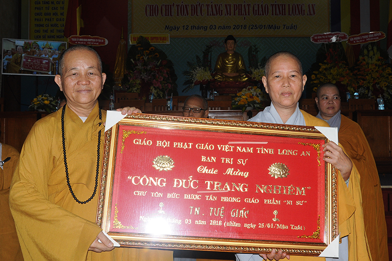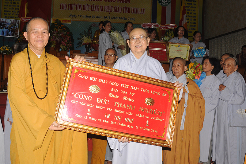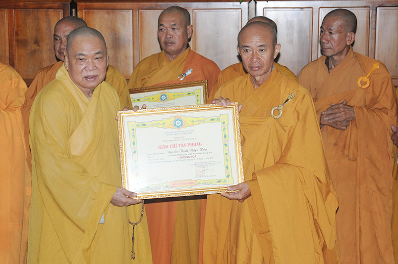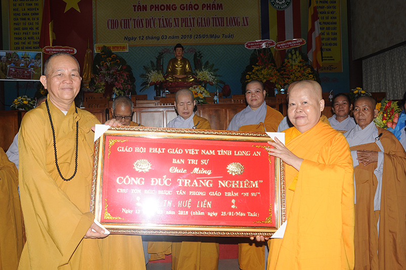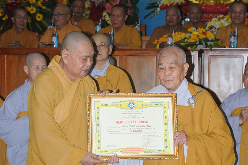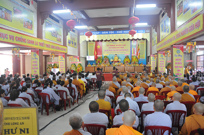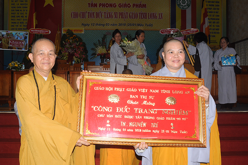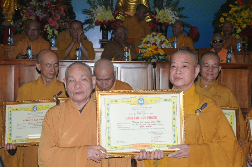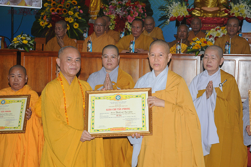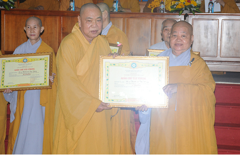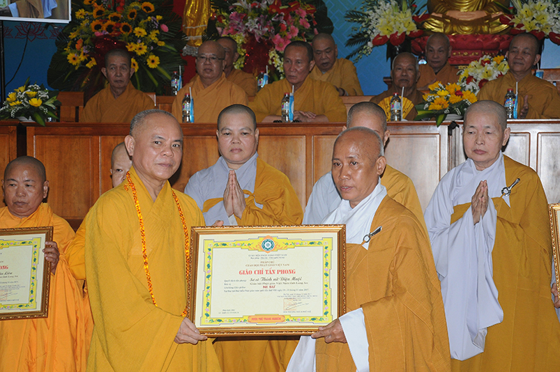 Tiếp theo, Ban Tổ chức cung thỉnh chư Tôn đức Giáo phẩm TW thân lâm trao bằng Giáo chỉ Tấn phong đến chư Tôn đức Tăng Ni tỉnh Long An: Trưởng lão HT. Thích Thiện Nhơn trao Giáo chỉ tấn phong hàng Giáo phẩm Hòa thượng; HT. Thích Thiện Pháp trao Giáo chỉ tấn phong hàng Giáo phẩm Thượng tọa và NT; HT. Thích Tấn Đạt trao Giáo chỉ tấn phong hàng Giáo phẩm NS.
