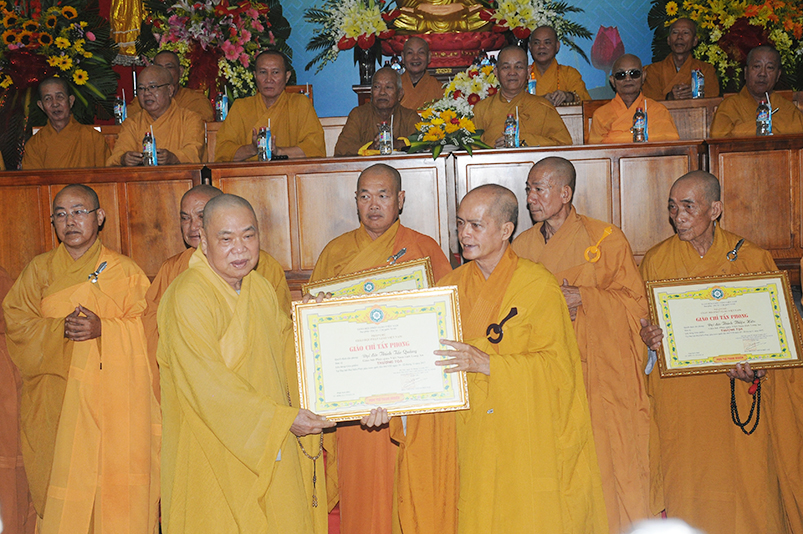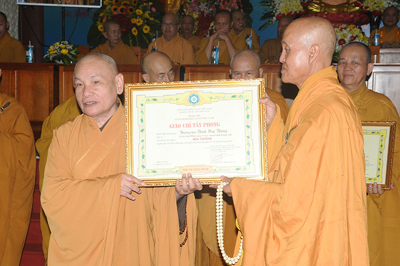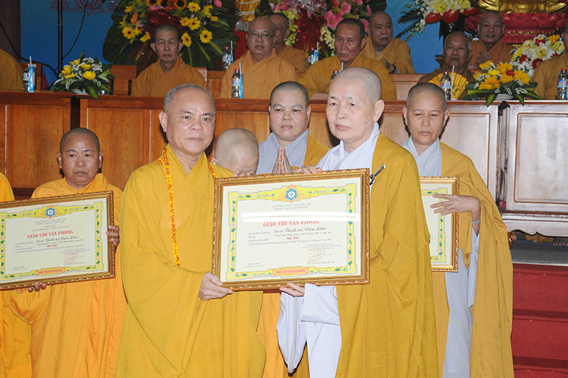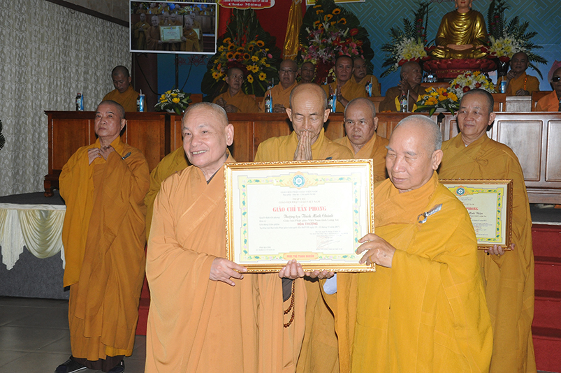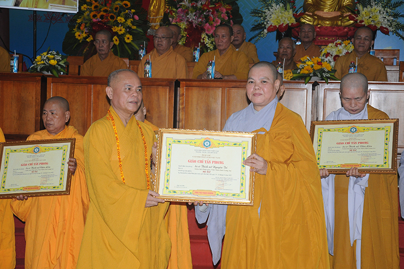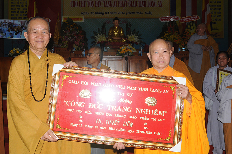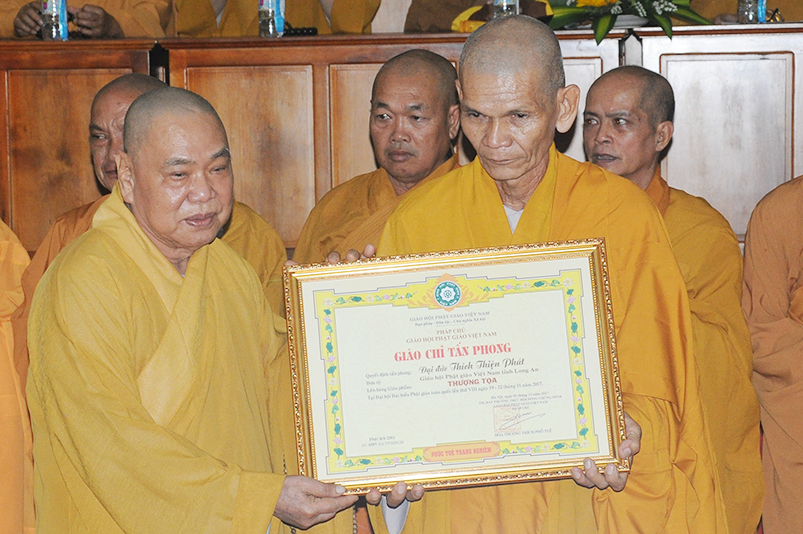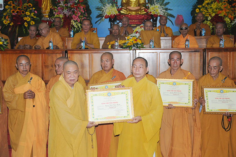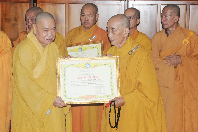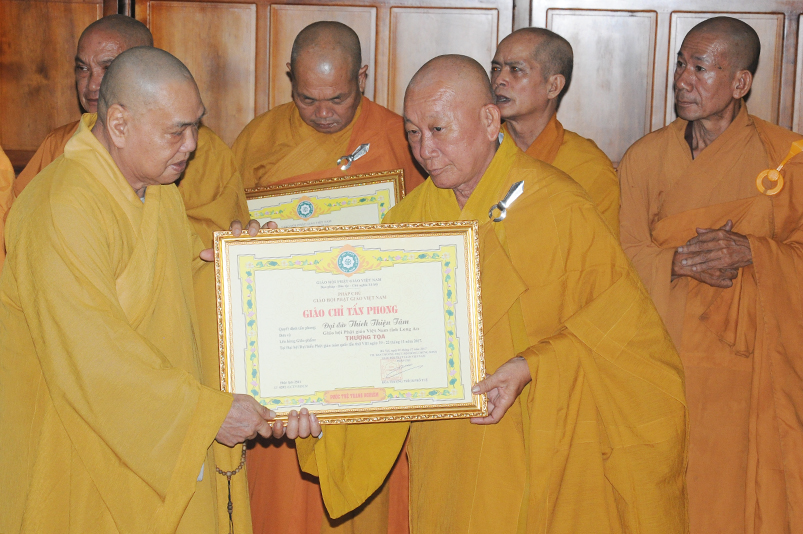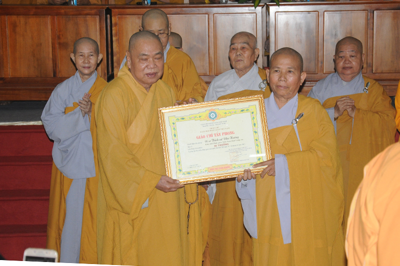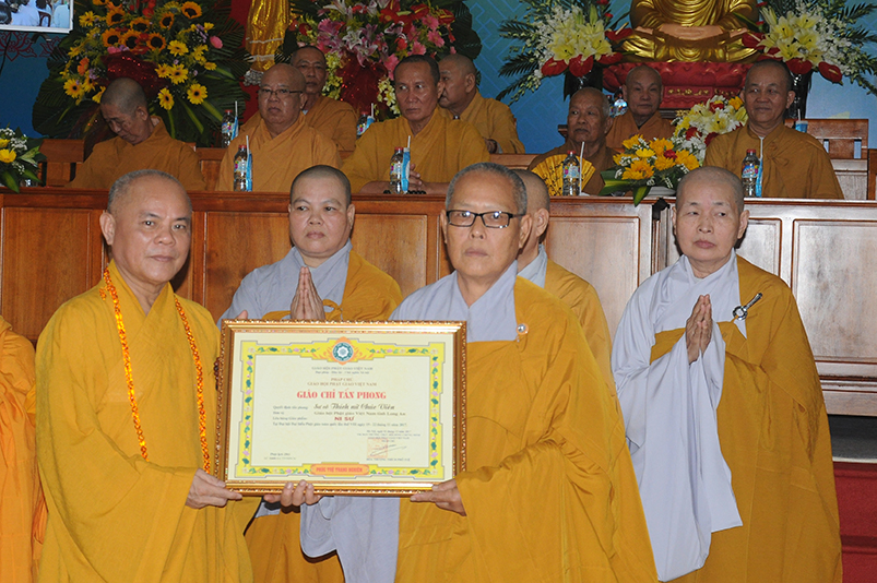 Tiếp theo, Ban Tổ chức cung thỉnh chư Tôn đức Giáo phẩm TW thân lâm trao bằng Giáo chỉ Tấn phong đến chư Tôn đức Tăng Ni tỉnh Long An: Trưởng lão HT. Thích Thiện Nhơn trao Giáo chỉ tấn phong hàng Giáo phẩm Hòa thượng; HT. Thích Thiện Pháp trao Giáo chỉ tấn phong hàng Giáo phẩm Thượng tọa và NT; HT. Thích Tấn Đạt trao Giáo chỉ tấn phong hàng Giáo phẩm NS.
