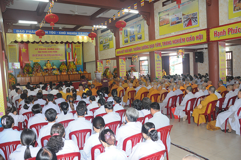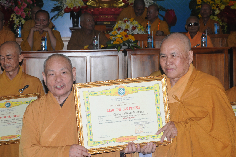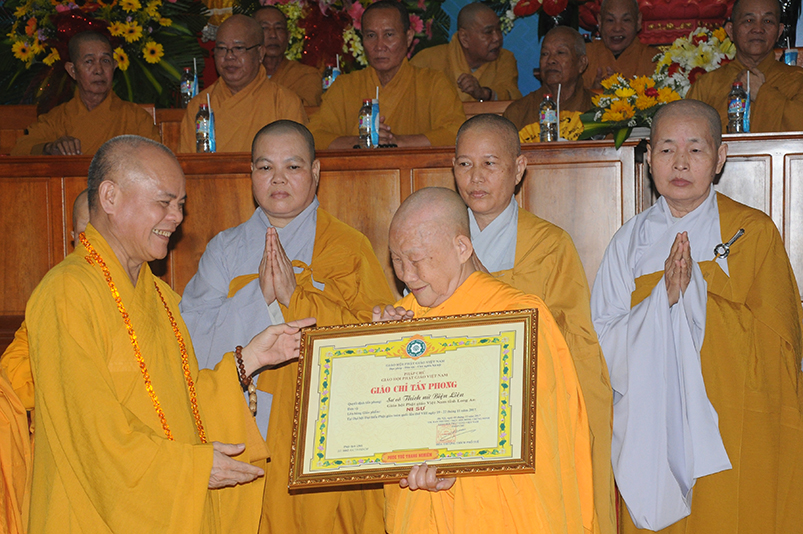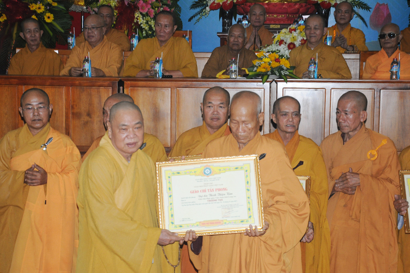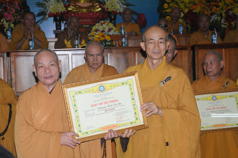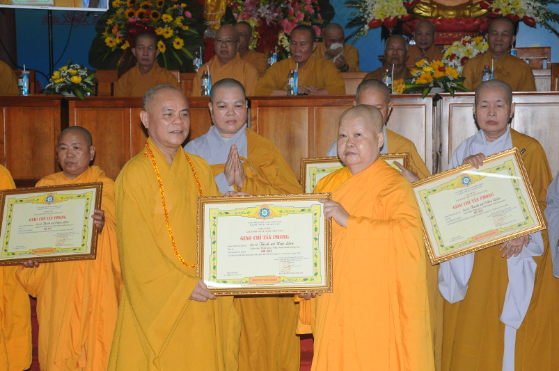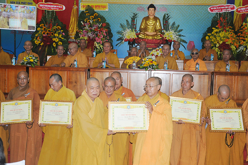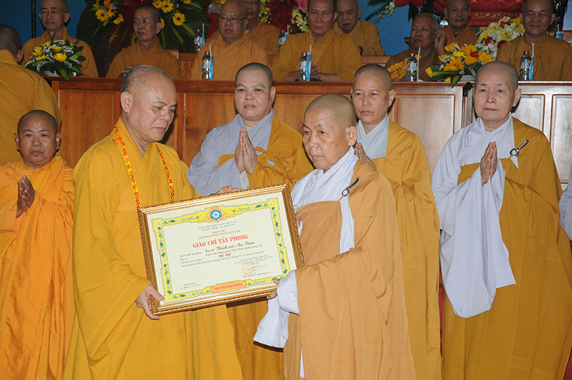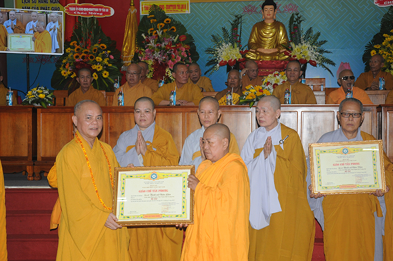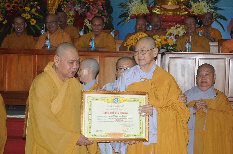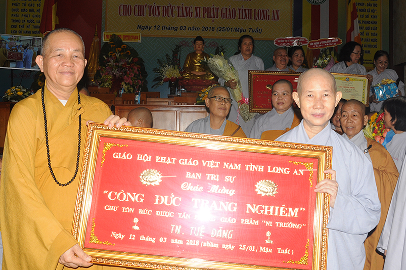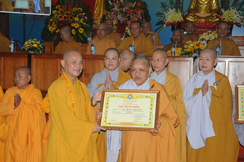 Tiếp theo, Ban Tổ chức cung thỉnh chư Tôn đức Giáo phẩm TW thân lâm trao bằng Giáo chỉ Tấn phong đến chư Tôn đức Tăng Ni tỉnh Long An: Trưởng lão HT. Thích Thiện Nhơn trao Giáo chỉ tấn phong hàng Giáo phẩm Hòa thượng; HT. Thích Thiện Pháp trao Giáo chỉ tấn phong hàng Giáo phẩm Thượng tọa và NT; HT. Thích Tấn Đạt trao Giáo chỉ tấn phong hàng Giáo phẩm NS.