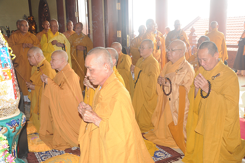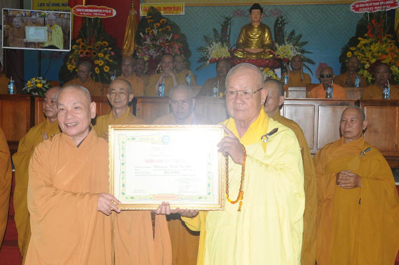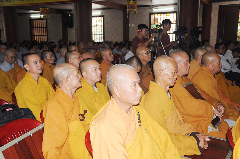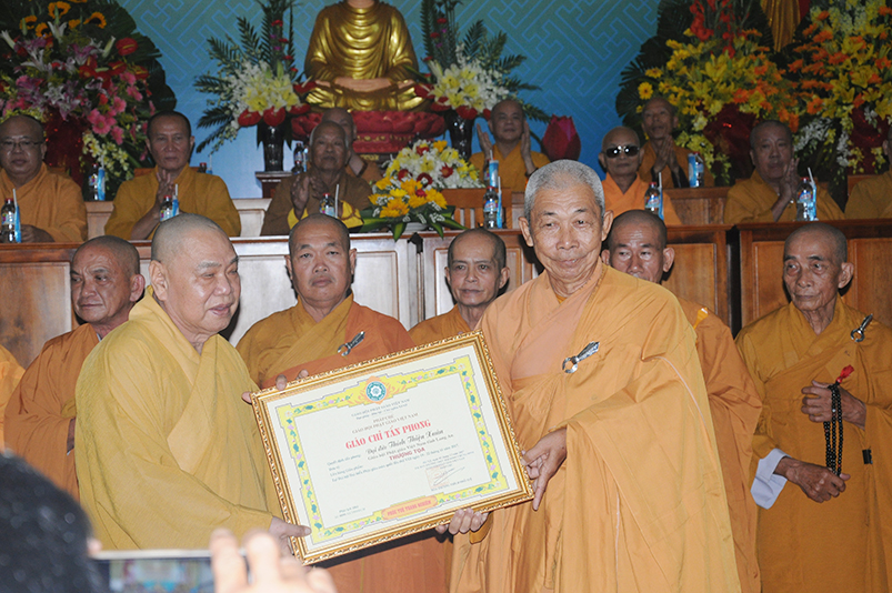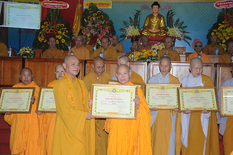 Trong giờ phút thiêng liêng trang trọng, HT. Thích Tấn Đạt – Phó Ban Thường trực Văn phòng 2, tuyên đọc các điều lệ theo Quyết định Tấn phong Giáo phẩm của Giáo hội Phật giáo Việt Nam do Đức Trưởng lão Pháp chủ Thích Phổ Tuệ đã ký, gồm có 51 vị trong các bậc: Giáo phẩm Hòa thượng (13 vị); NT (7 vị); TT ( vị ); NS (vị).