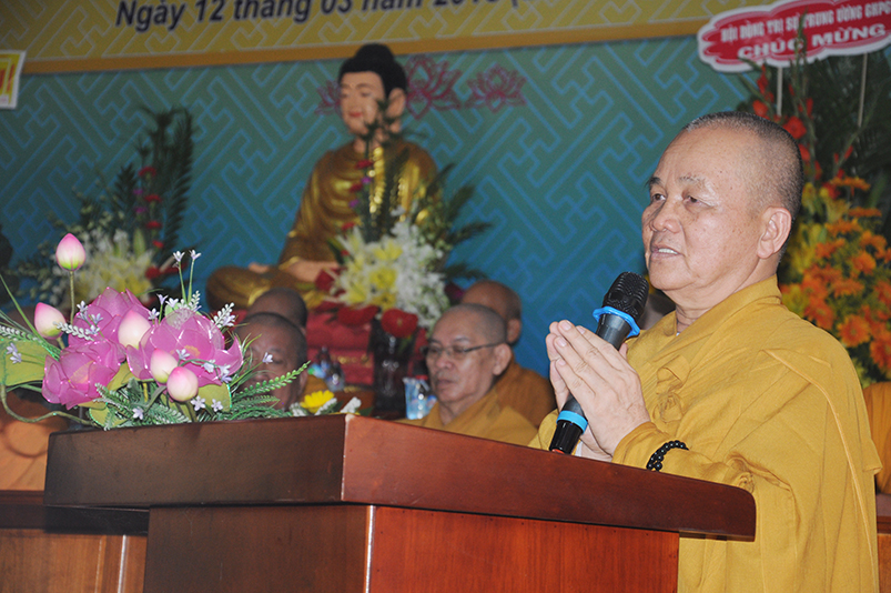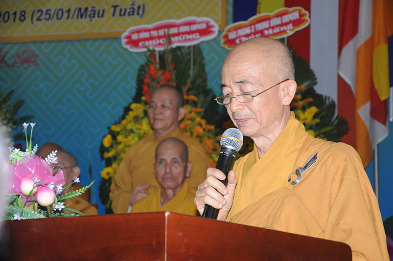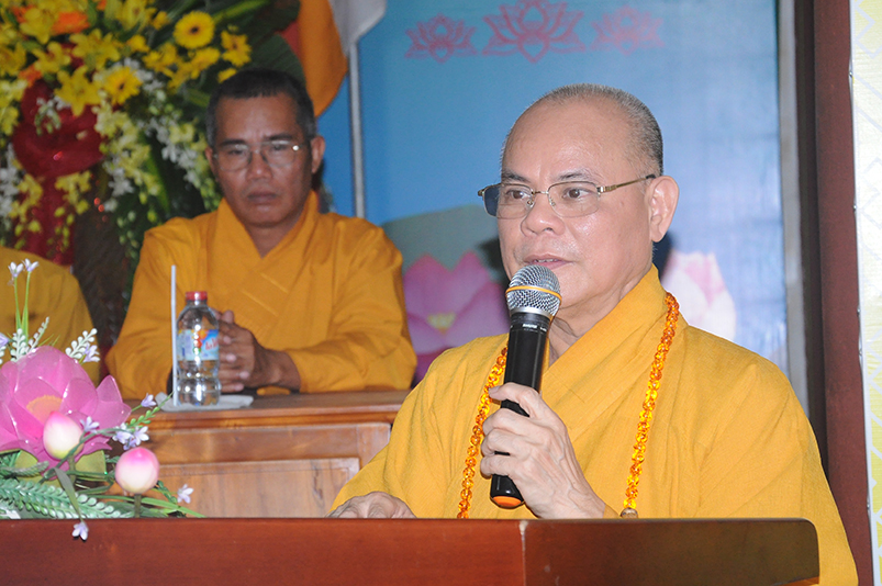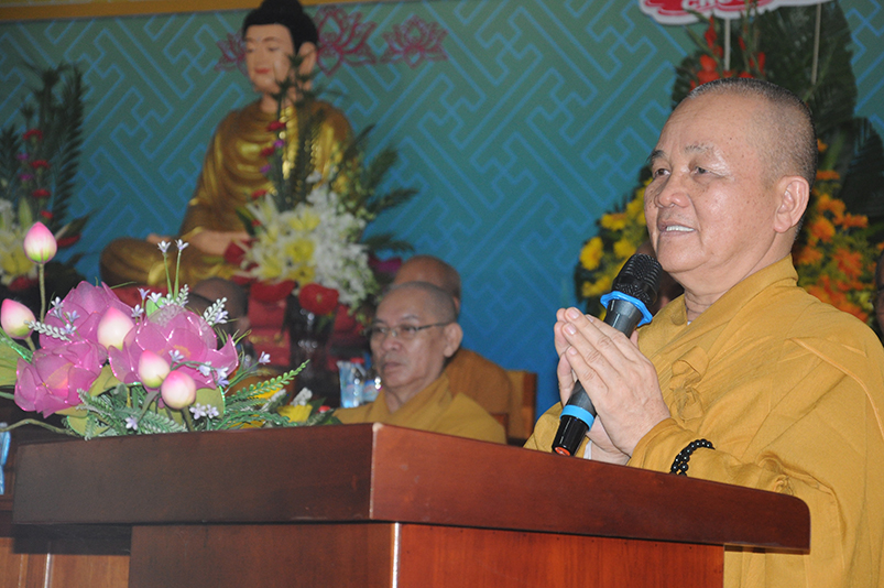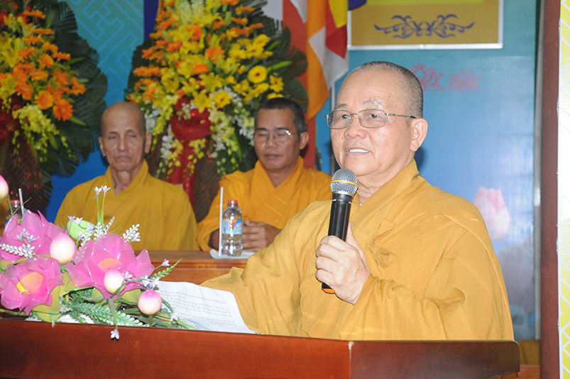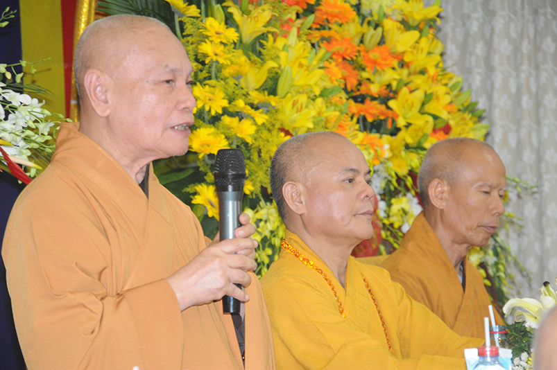 Trong niềm hoan hỷ của buổi lễ Tấn phong, trước những thành tựu Phật sự của Phật giáo tỉnh Long An, Đức Trưởng lão Hòa thượng thượng Thiện hạ Nhơn, Bậc lãnh đạo tối cao của GHPGVN ân cần ban đạo từ chứng minh. Ngài chúc mừng chư Tôn đức Tăng Ni vừa được nhận bằng Giáo chỉ cao quý, và đã được Giáo hội tín nhiệm suy cử vào các chức vụ trong nhiệm kỳ 2017 – 2022.
