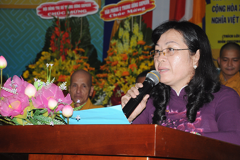 Bày tỏ niềm vui trong Lễ Tấn phong, Bà Phạm Ngọc Tiệp chân tình phát biểu, chúc mừng Ban Trị sự GHPGVN tỉnh Long An cùng chư Tôn đức Giáo phẩm được tấn phong. Lãnh đạo cấp tỉnh ca ngợi tinh thần hòa hợp Đạo – Đời của Phật giáo tỉnh Long An trong nhiều thập kỷ qua, và hy vọng truyền thống này luôn được tiếp tục phát huy, kết hợp tốt đẹp, góp phần an sinh xã hội tại tỉnh nhà.
