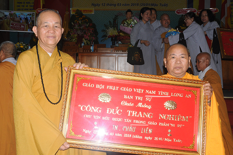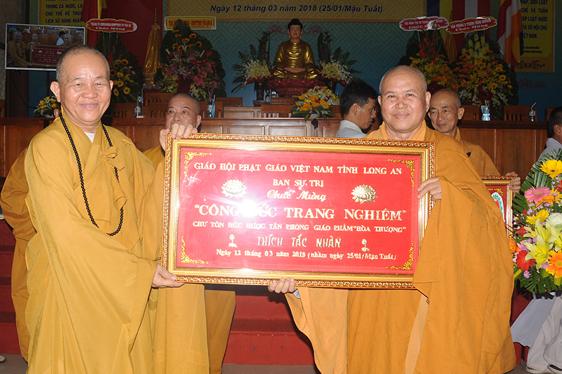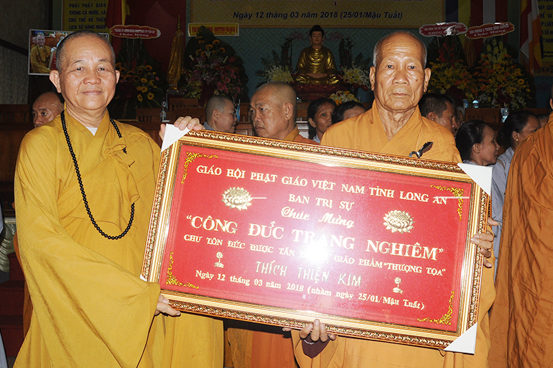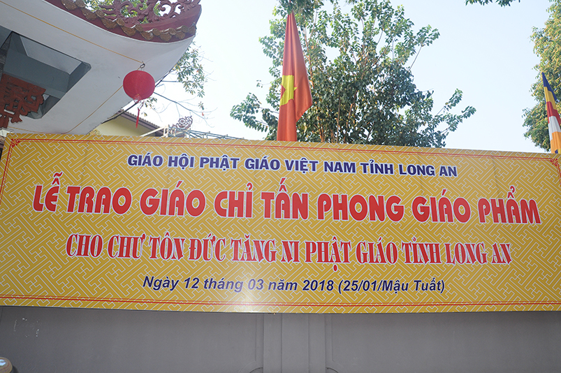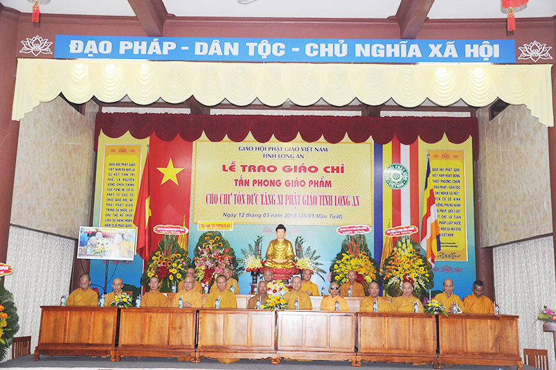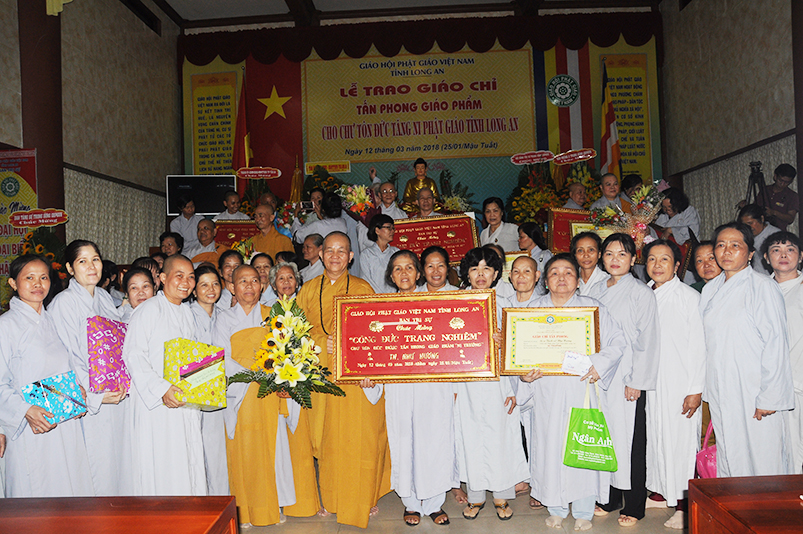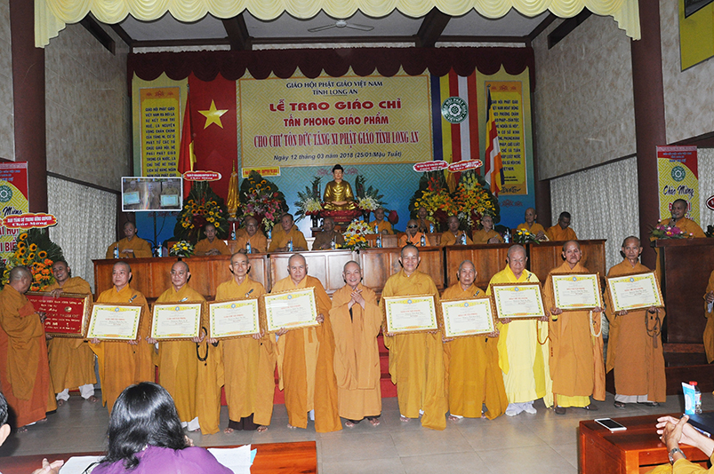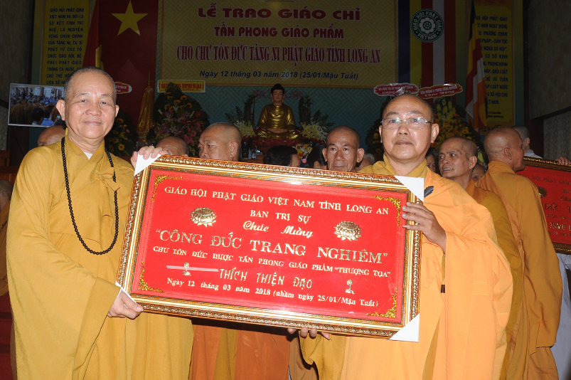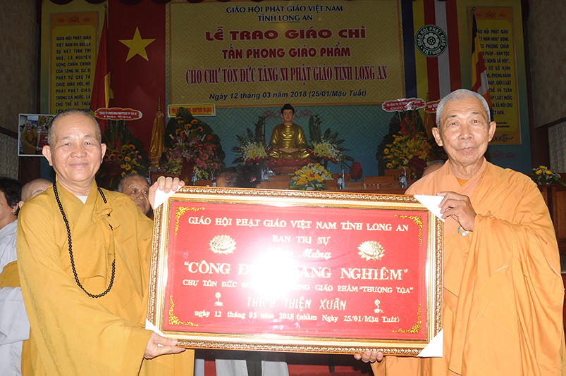 Sáng ngày 12 tháng 3 năm 2018 (ngày 25 tháng Giêng năm Mậu Tuất), Ban Trị sự GHPGVN long trọng cung nghinh chư Tôn đức Giáo phẩm HĐTS TW quang lâm trú xứ Thiên Châu, VP. BTS, đường Huỳnh Văn Nhứt, F.3 thành phố Tân An, tỉnh Long An để chứng minh Lễ Trao bằng Giáo chỉ Tấn phong cho 51 vị theo các cấp bậc Giáo phẩm: HT, NT, TT, NS; đồng thời khai giảng 290 đạo tràng tu học trong toàn tỉnh Long An.