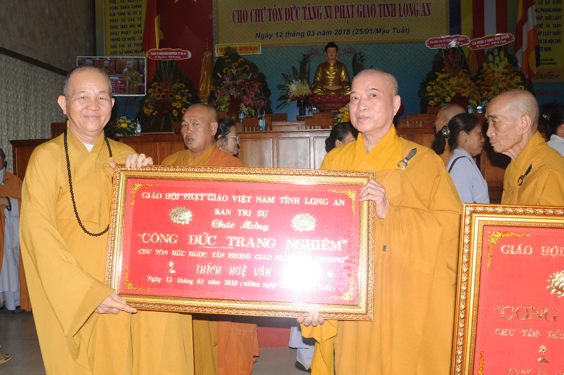 Chư Tôn đức tỉnh Long An: HT. Thích Thiện Huệ – CM BTSGHPGVN tỉnh Long An; HT. Thích Huệ Hồng- Chứng minh Ban trị sự GHPGVN tỉnh Long An; HT. Thích Minh Thiện- Ủy viên HĐTS, Phó Trưởng ban Hoằng pháp TW, Trưởng ban Trị sự GHPGVN tỉnh Long An; HT. Thích Thiện Tâm- Phó ban Trị sự GHPGVN tỉnh Long An; HT. Thích Thiện Tài- Phó ban Trị sự kiêm Trưởng ban Nghi lễ GHPGVN tỉnh Long An; cùng chư Tôn đức: HT. Thích Tắc Phi, HT. Thích Thiện Phúc, HT. Thích Bửu Ứng, HT. Thích Huệ Bạch, HT. Quảng Ý, TT. Thích Phước Nghiêm, TT. Thích Minh Nhật, TT. Minh Thọ, v.v; chư Tôn đức Ni: NT. Thích Tuệ Đăng; NT. Thích Gương Liên v.v..