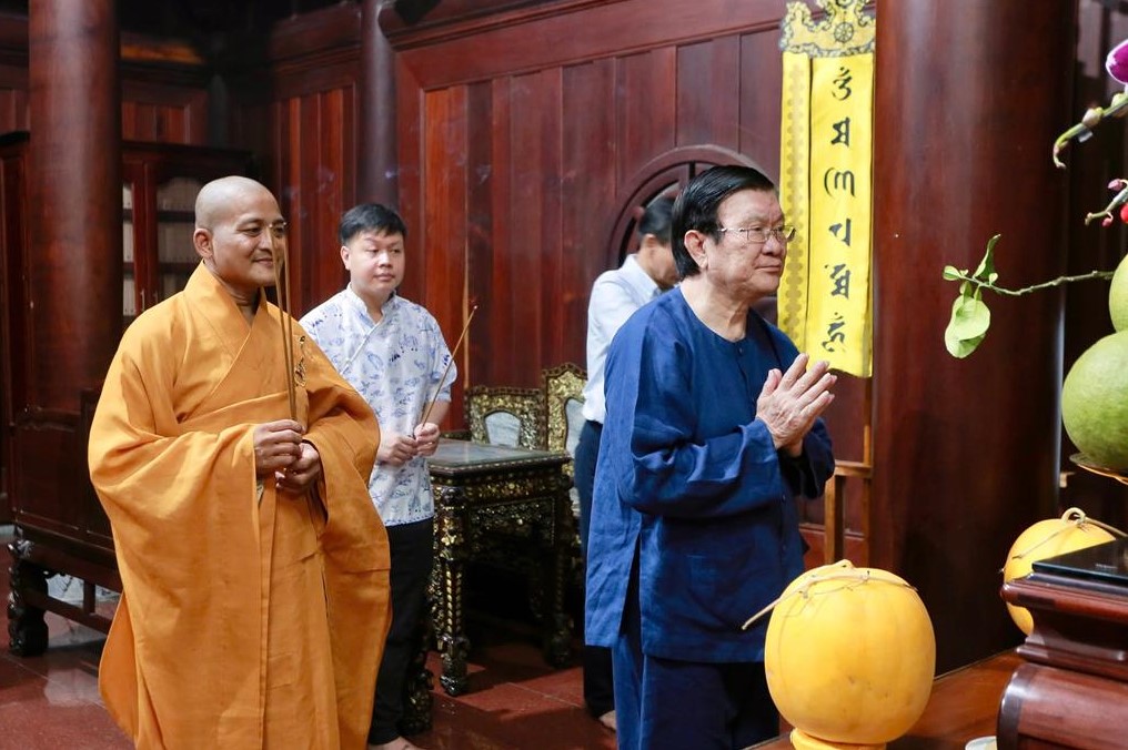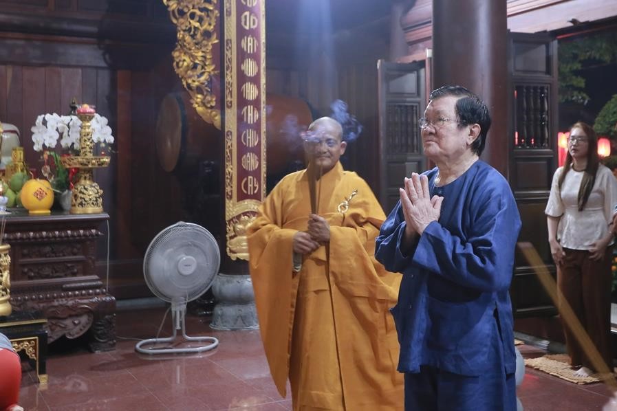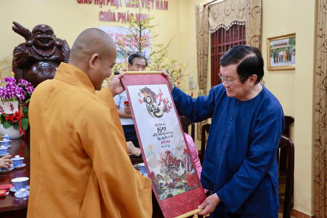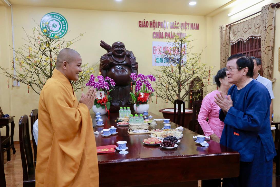 Tại chánh điện chùa Pháp Minh, Nguyên Chủ tịch nước, phu nhân, tộc họ Trương dâng hương đầu năm và có lời thăm hỏi, chúc mừng năm mới đến  Thượng tọa Thích Lệ Duyên và chư Tăng chùa Pháp Minh.