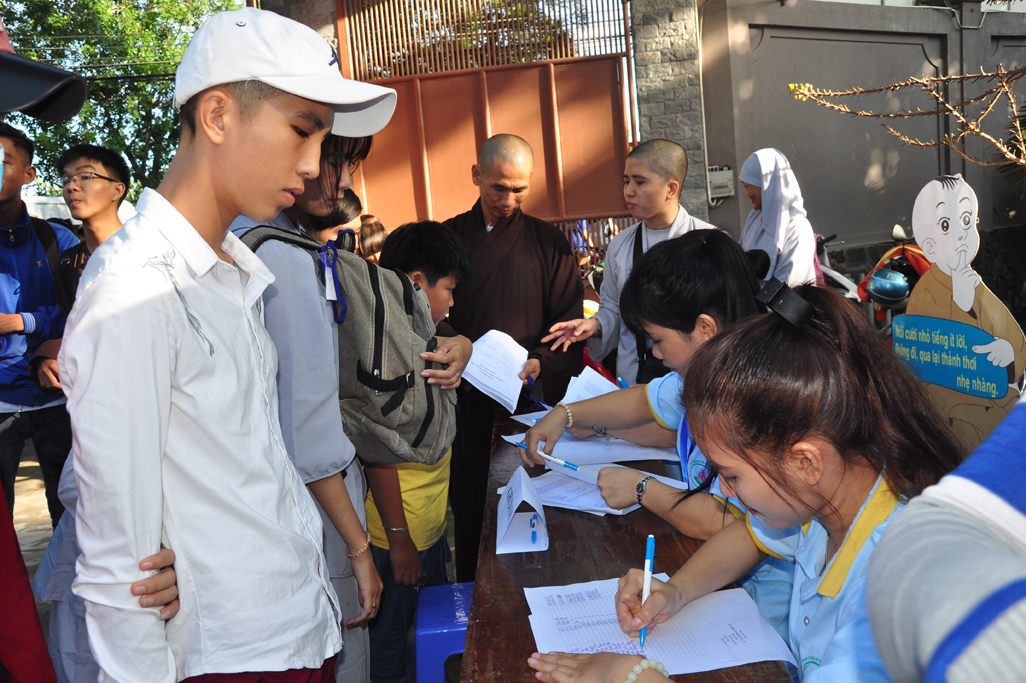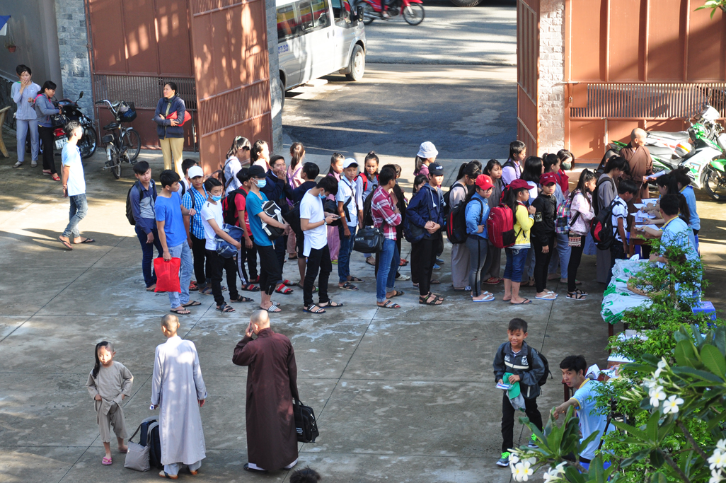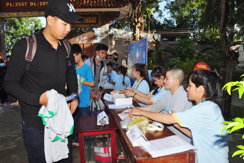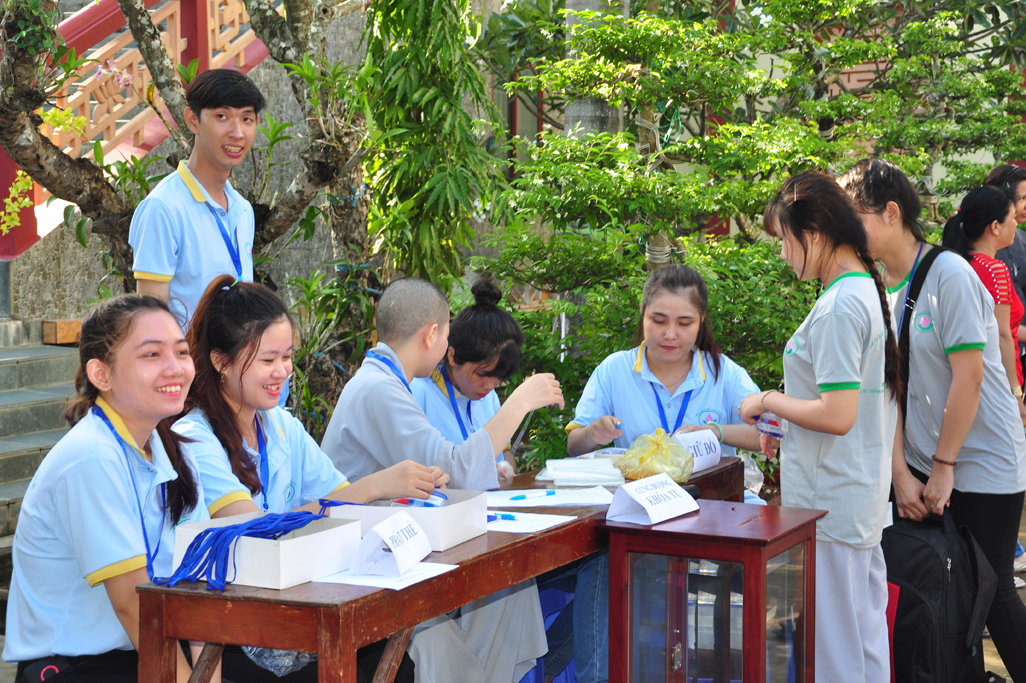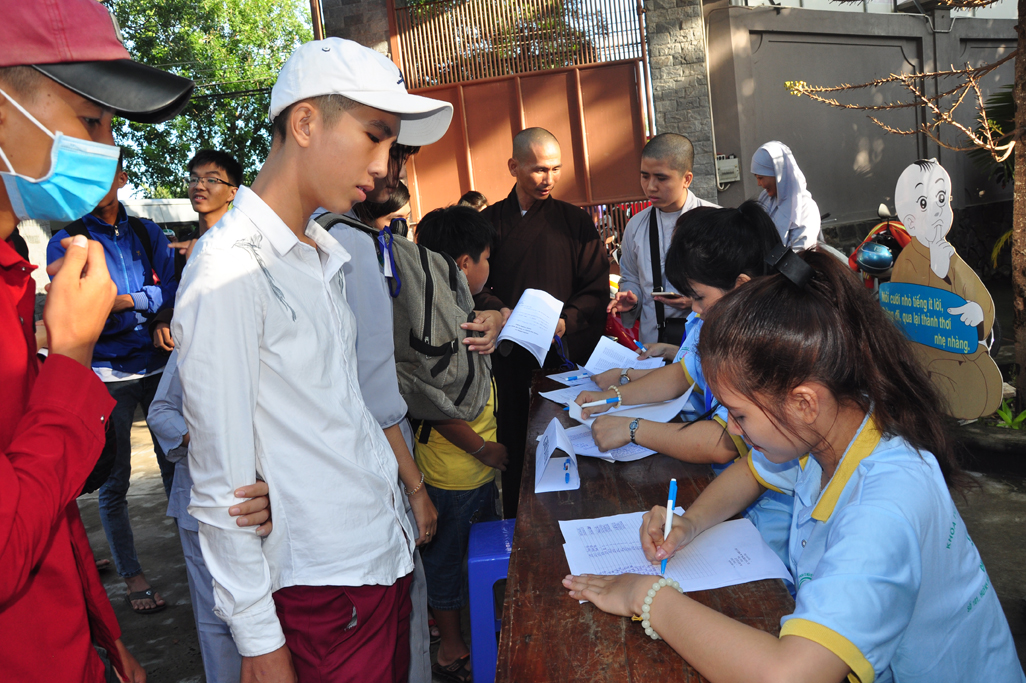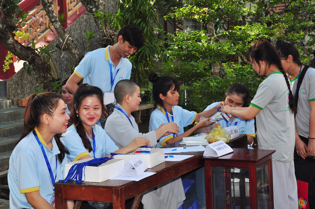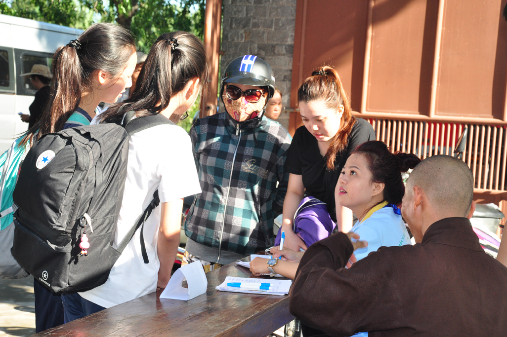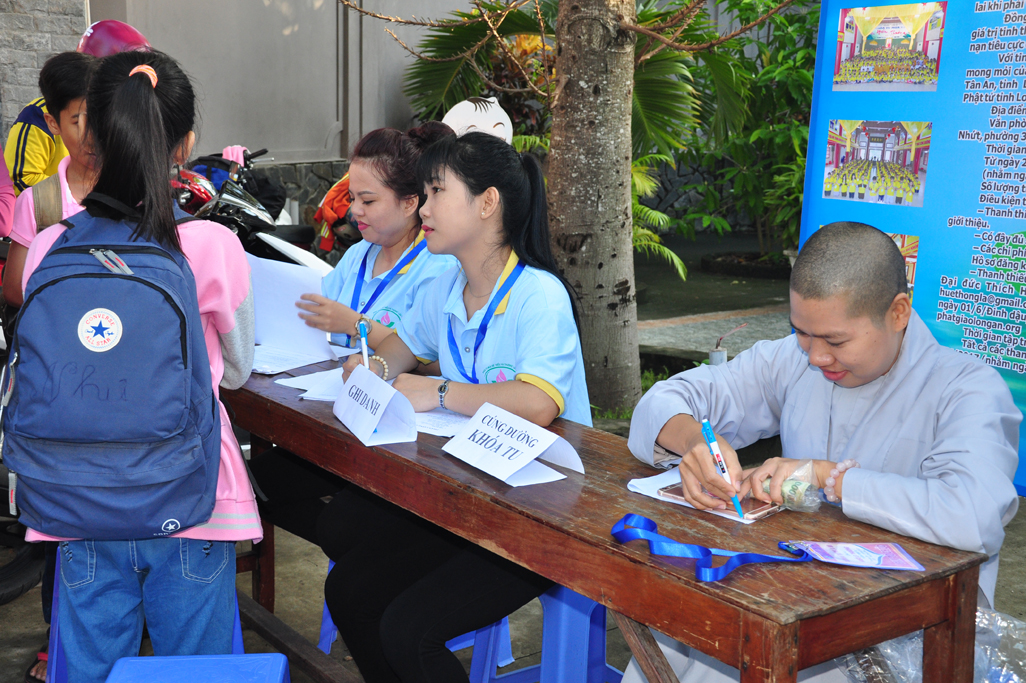 Các em được  quý thầy cô và các anh chị  hoan hỷ đón tiếp ghi danh, phát đồng phục và hướng dẫn dùng điểm tâm sáng.