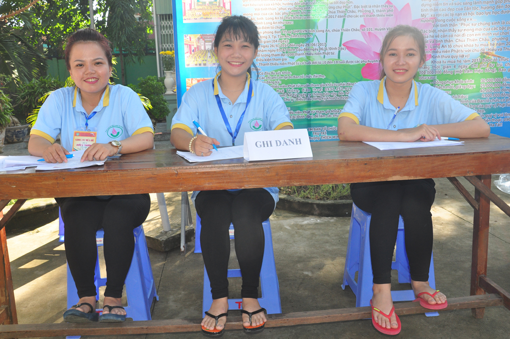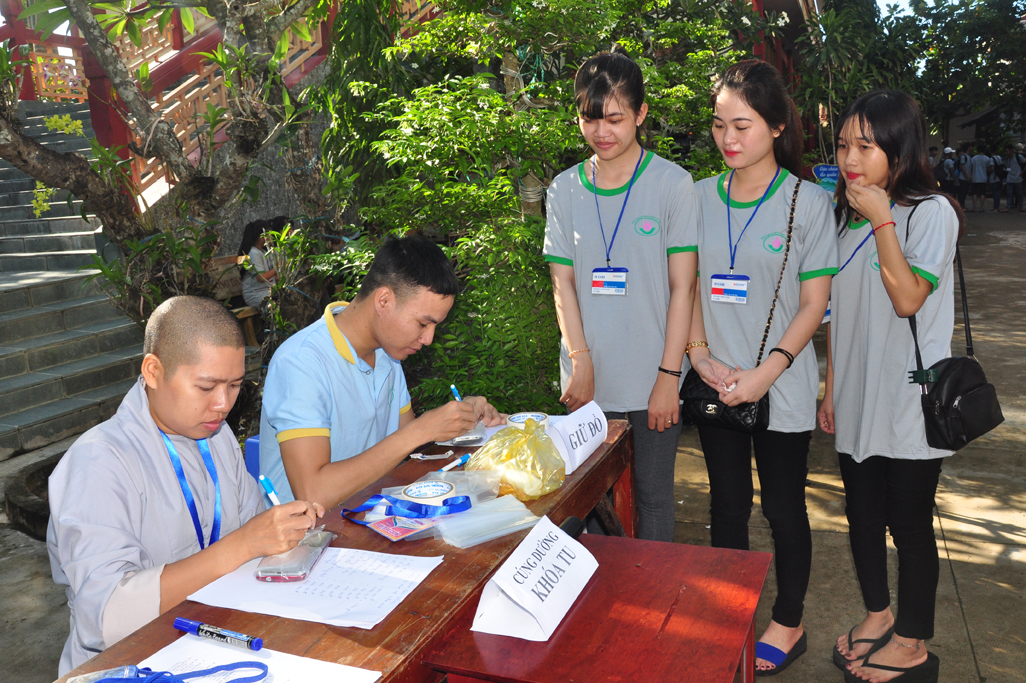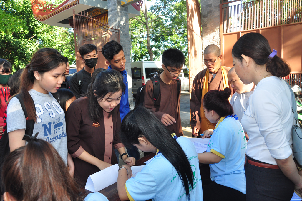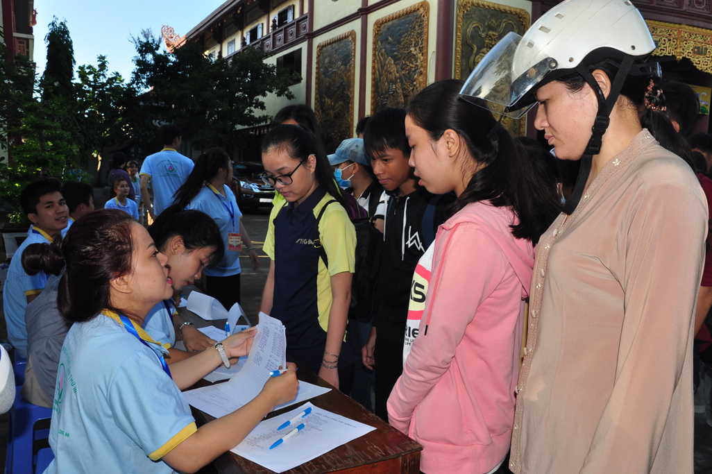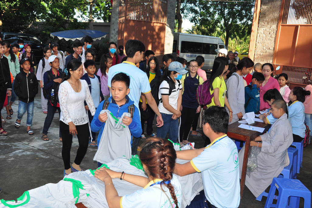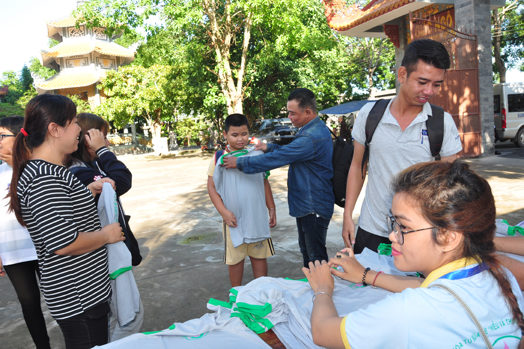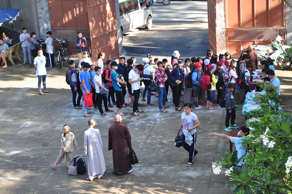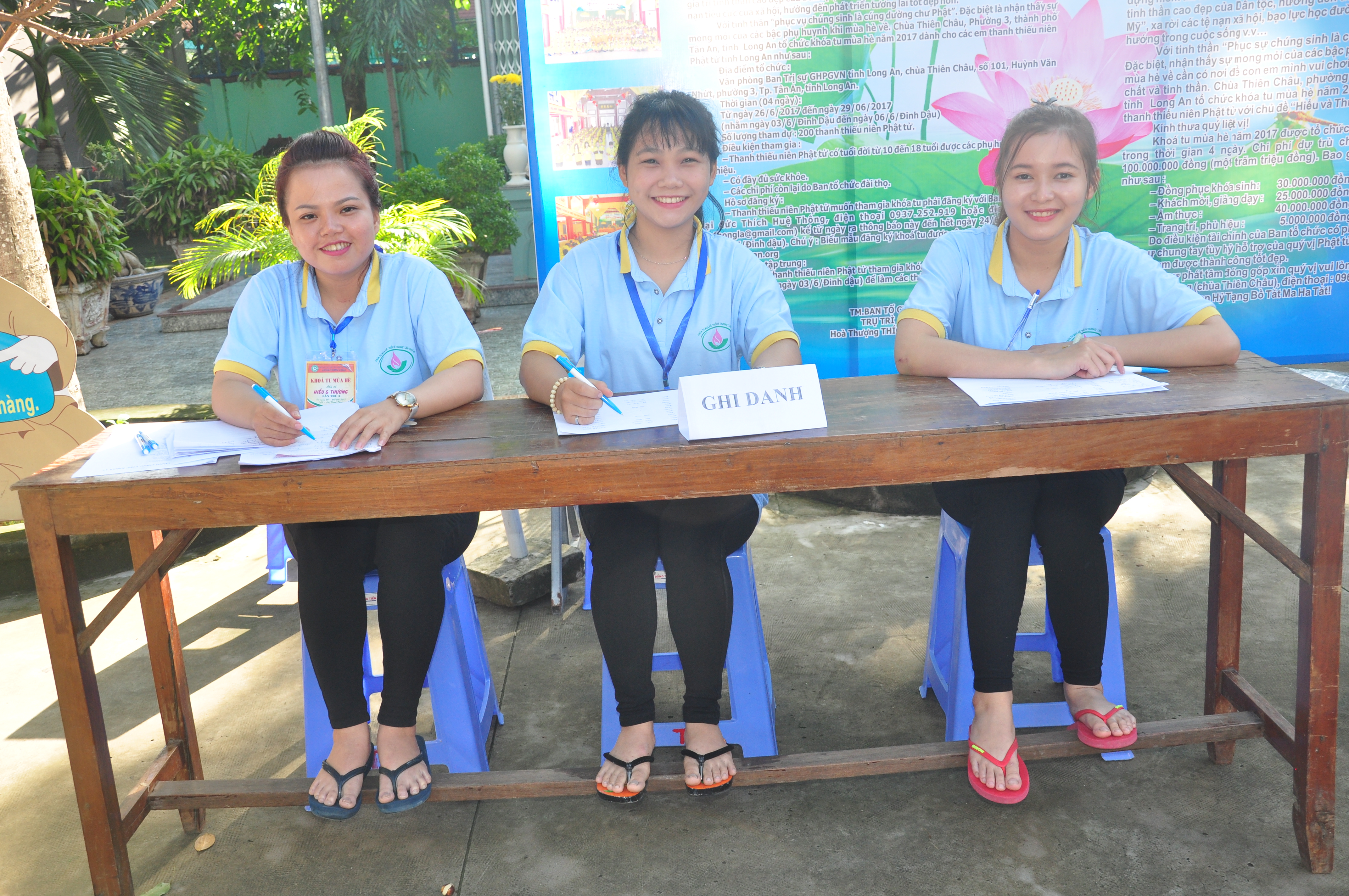 Các em được  quý thầy cô và các anh chị  hoan hỷ đón tiếp ghi danh, phát đồng phục và hướng dẫn dùng điểm tâm sáng.