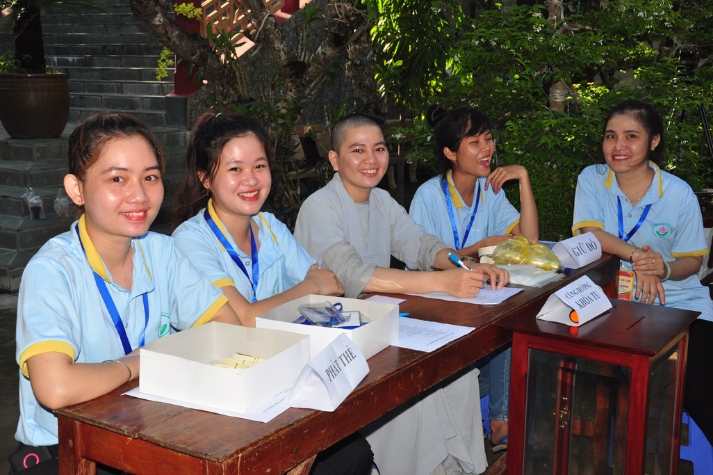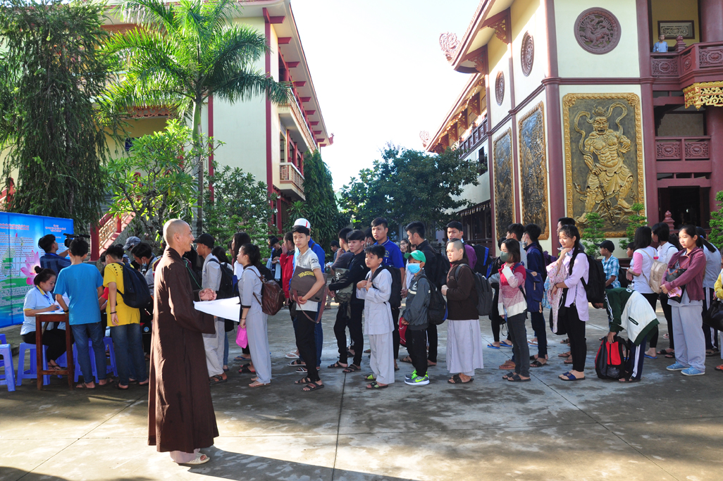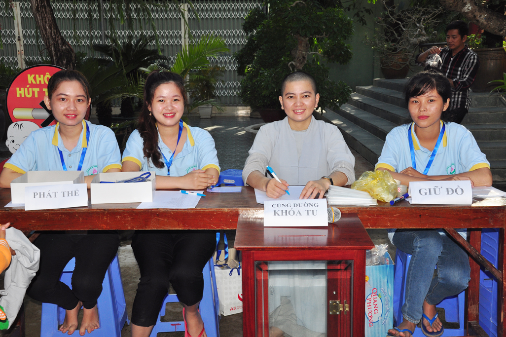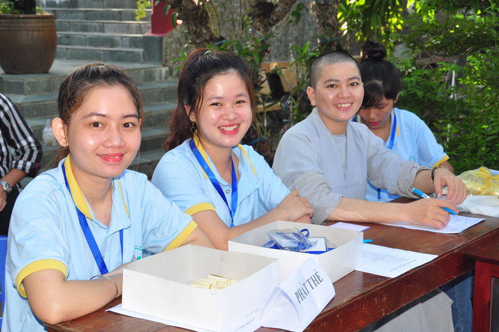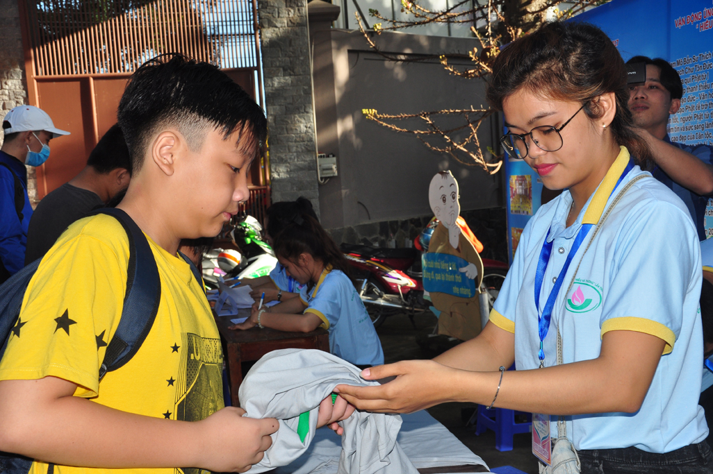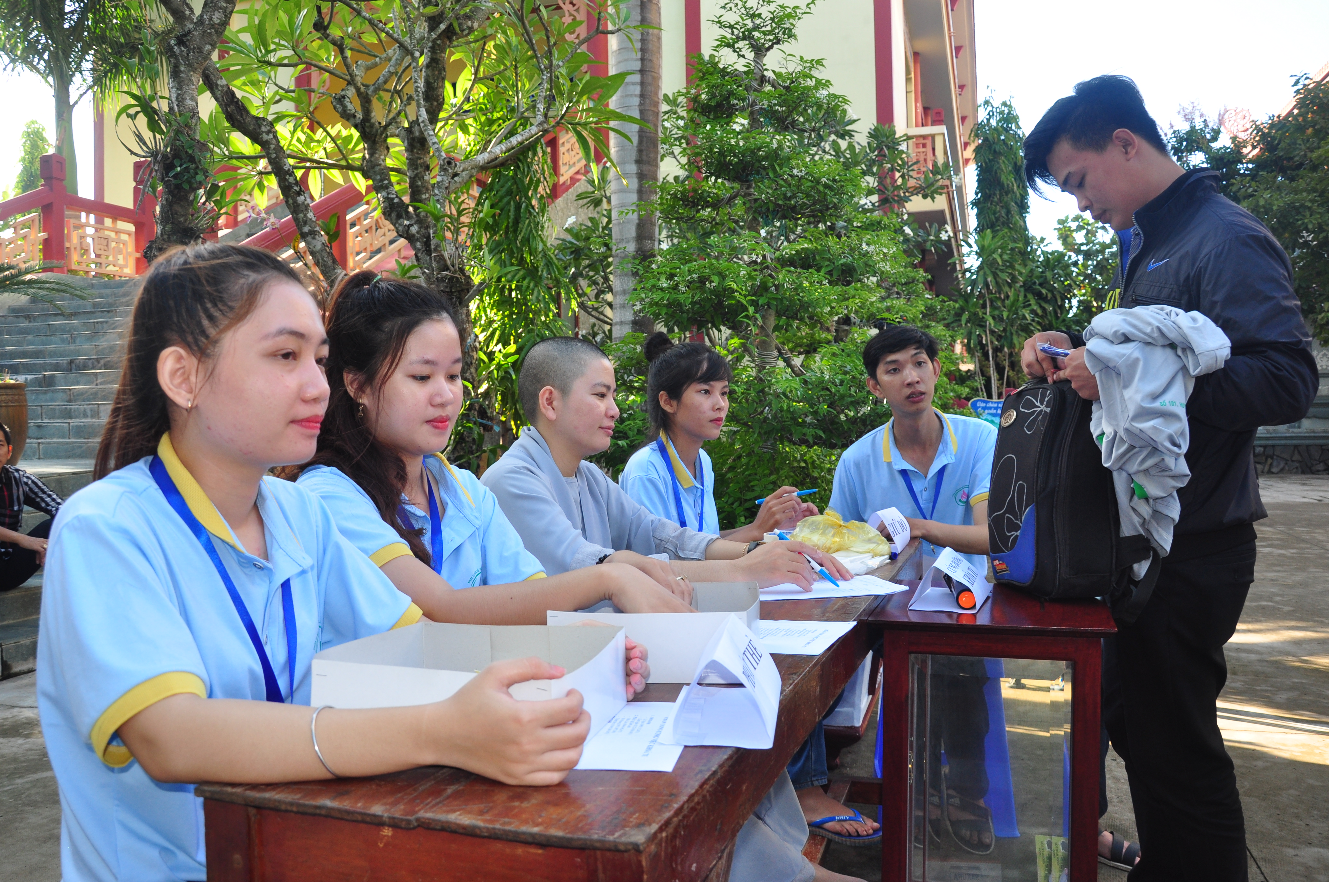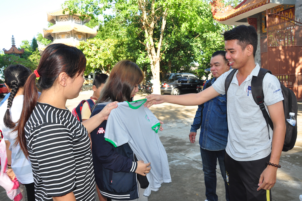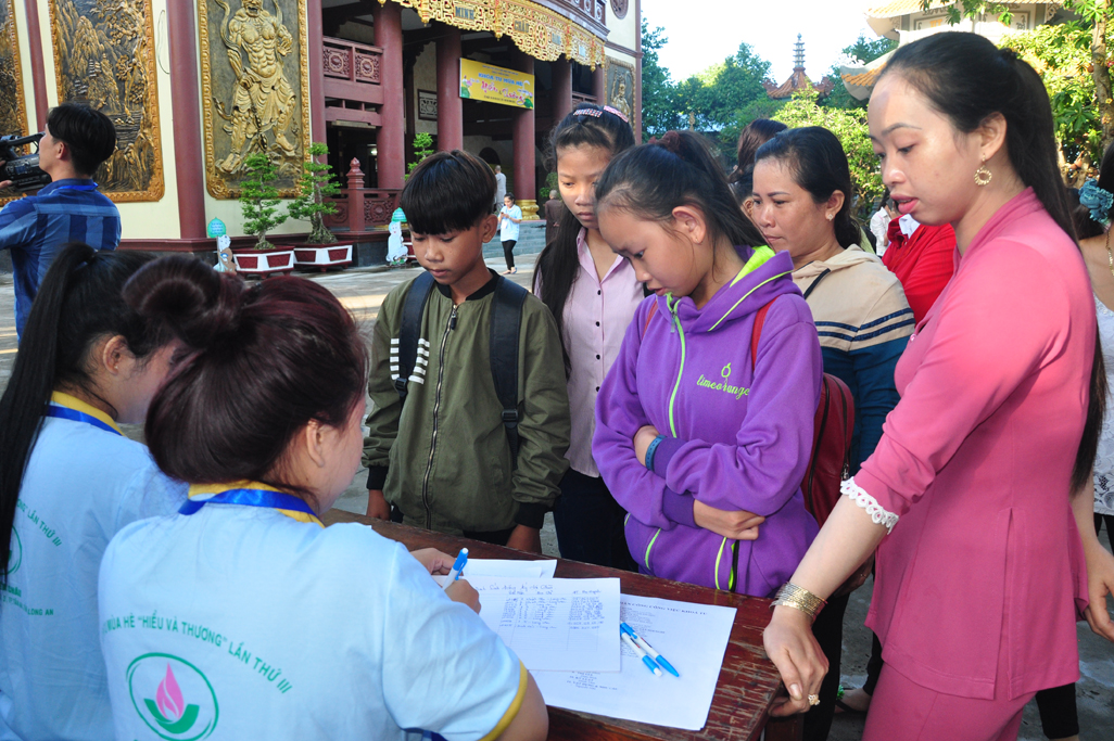 Các em được  quý thầy cô và các anh chị  hoan hỷ đón tiếp ghi danh, phát đồng phục và hướng dẫn dùng điểm tâm sáng.