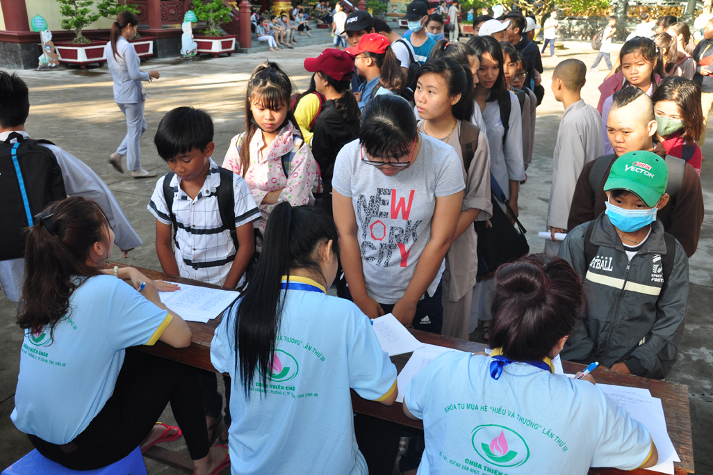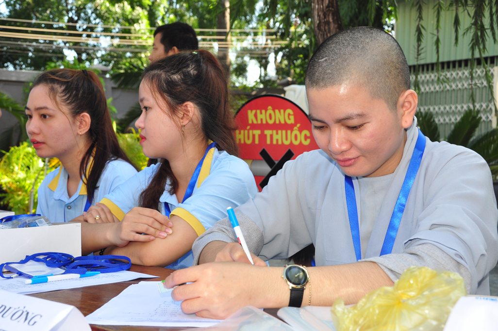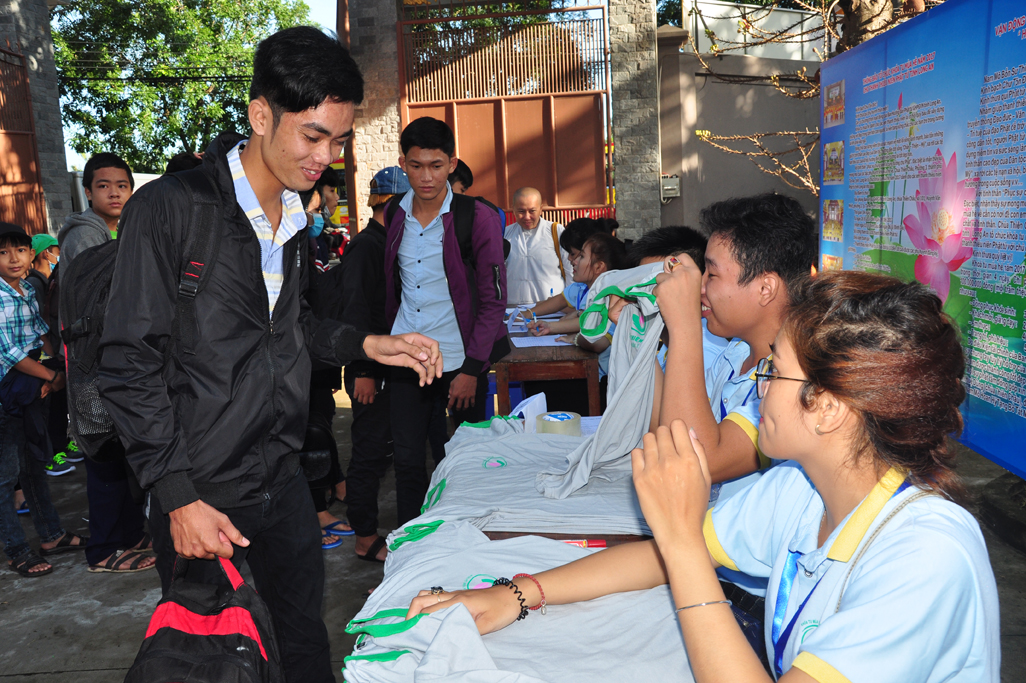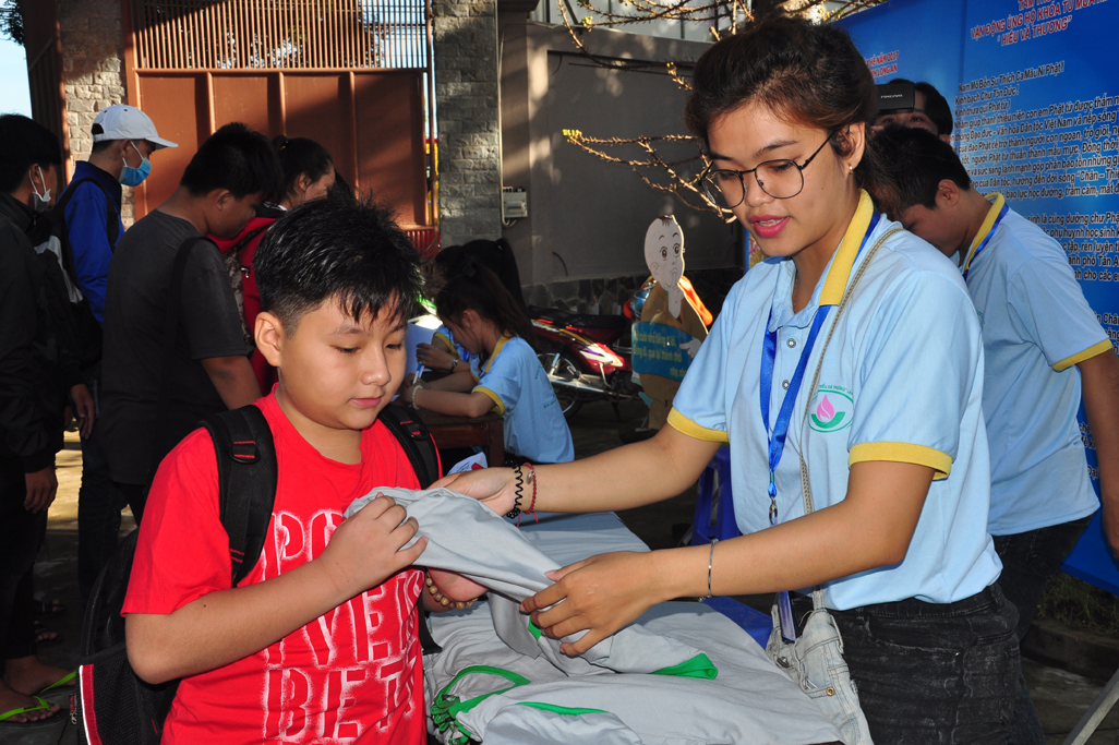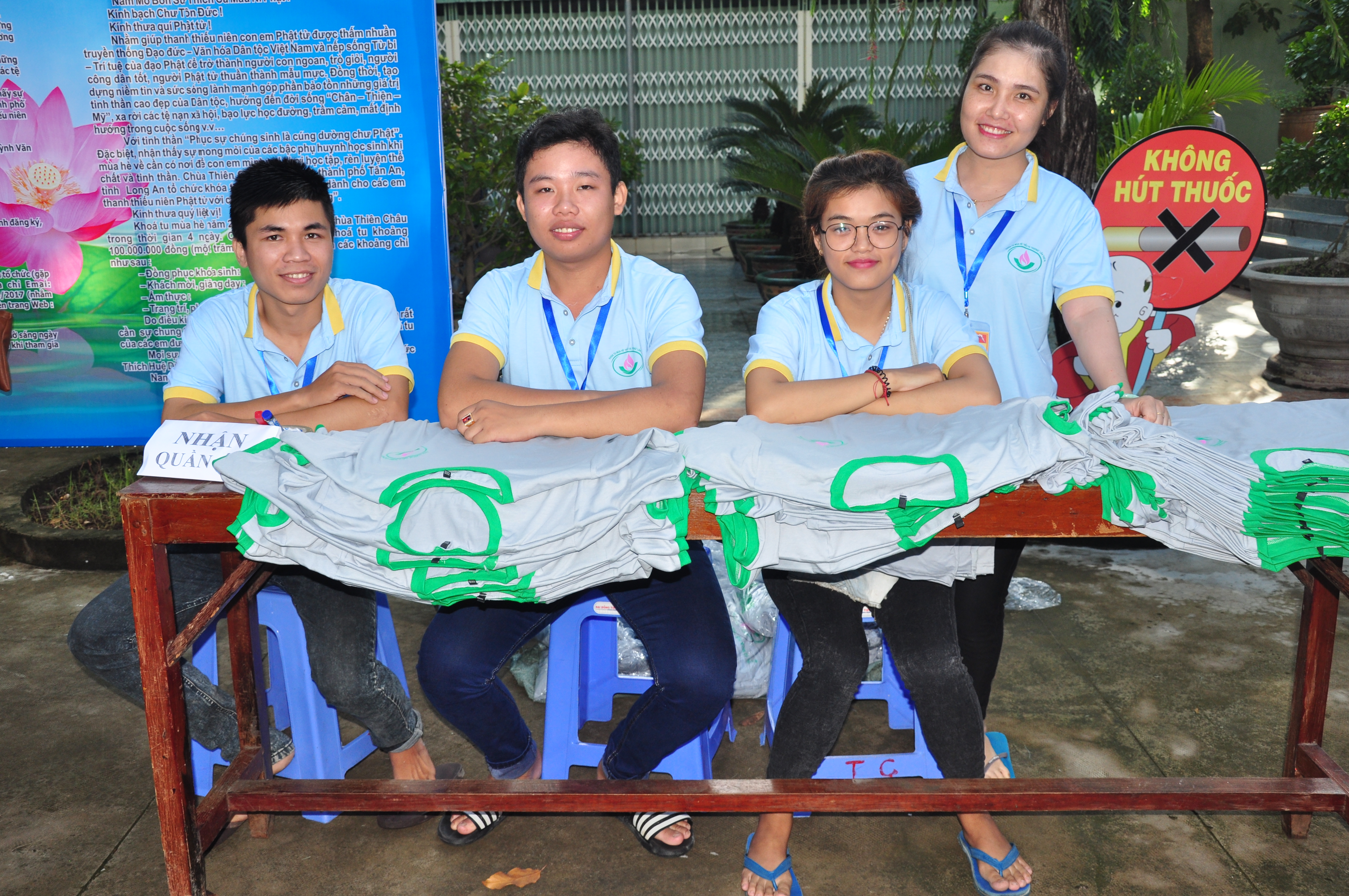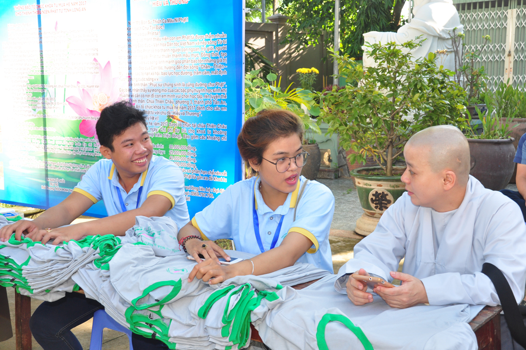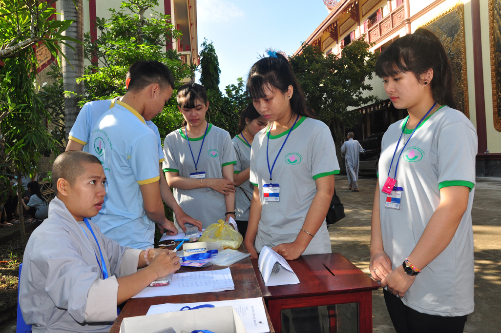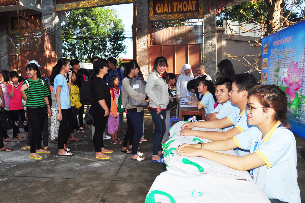 Các em được  quý thầy cô và các anh chị  hoan hỷ đón tiếp ghi danh, phát đồng phục và hướng dẫn dùng điểm tâm sáng.