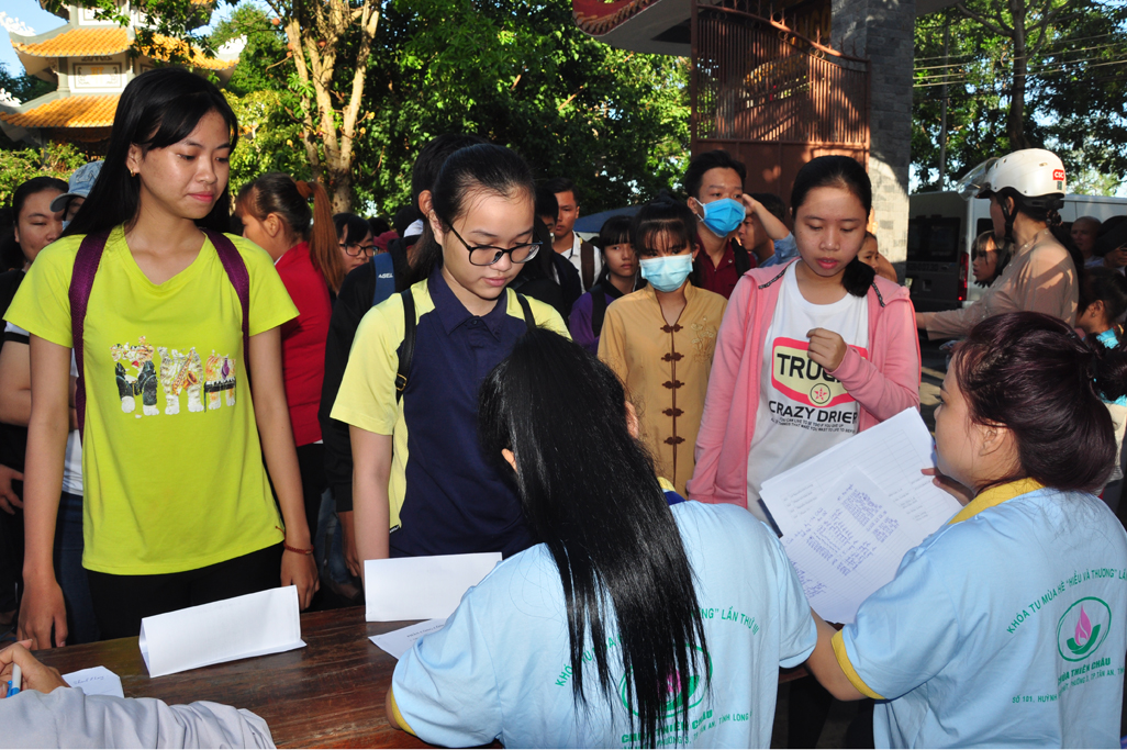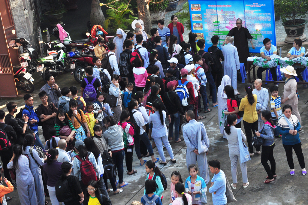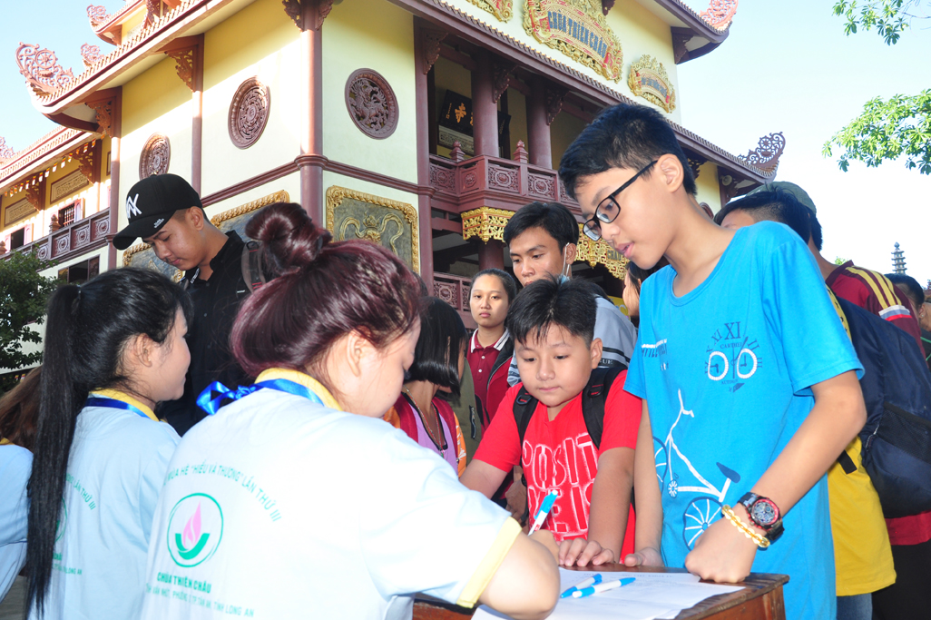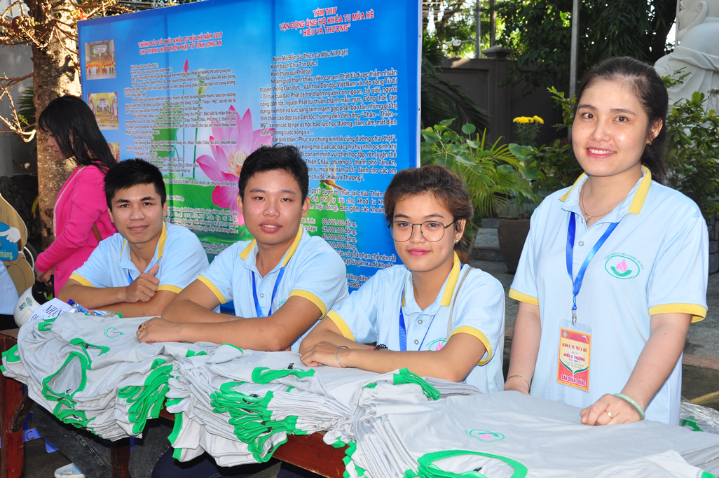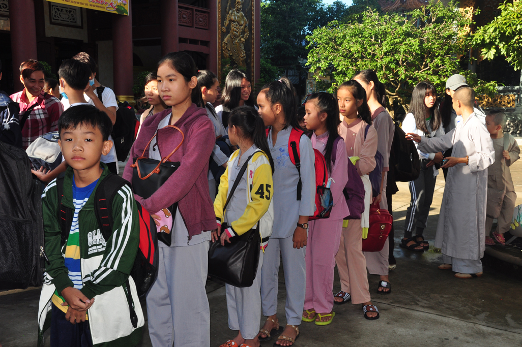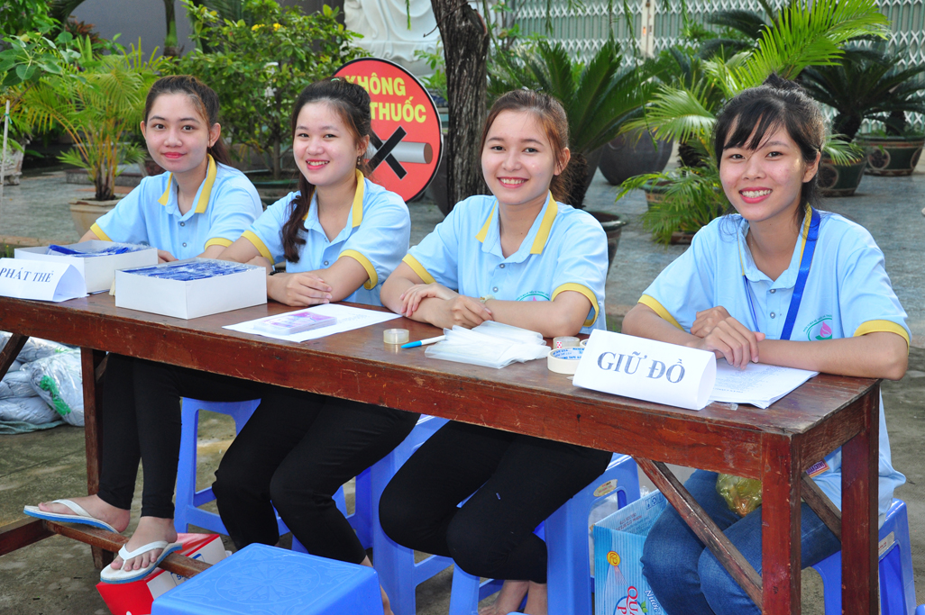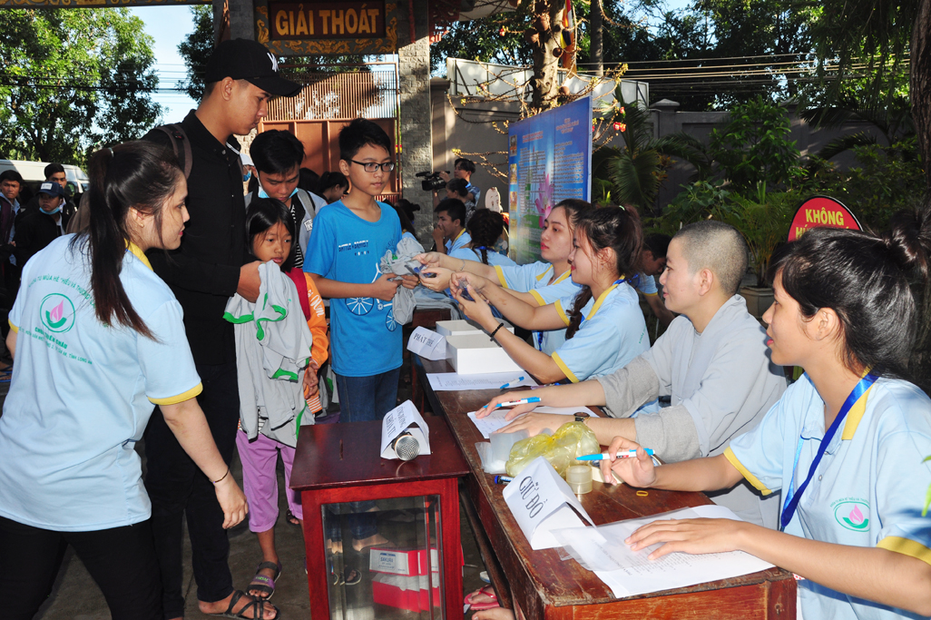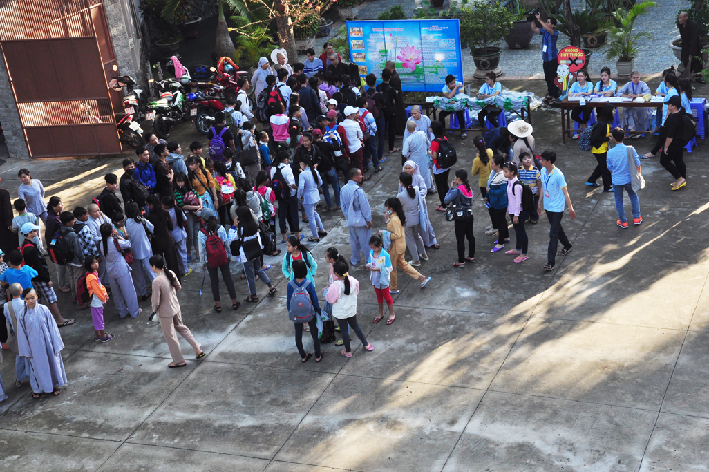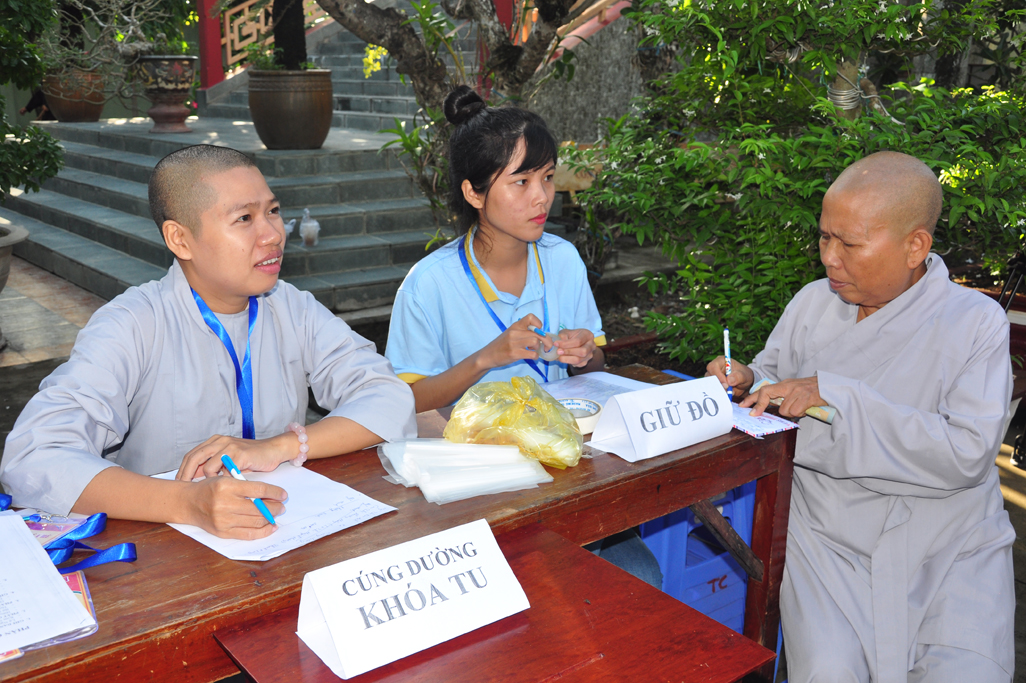 Các em được  quý thầy cô và các anh chị  hoan hỷ đón tiếp ghi danh, phát đồng phục và hướng dẫn dùng điểm tâm sáng.