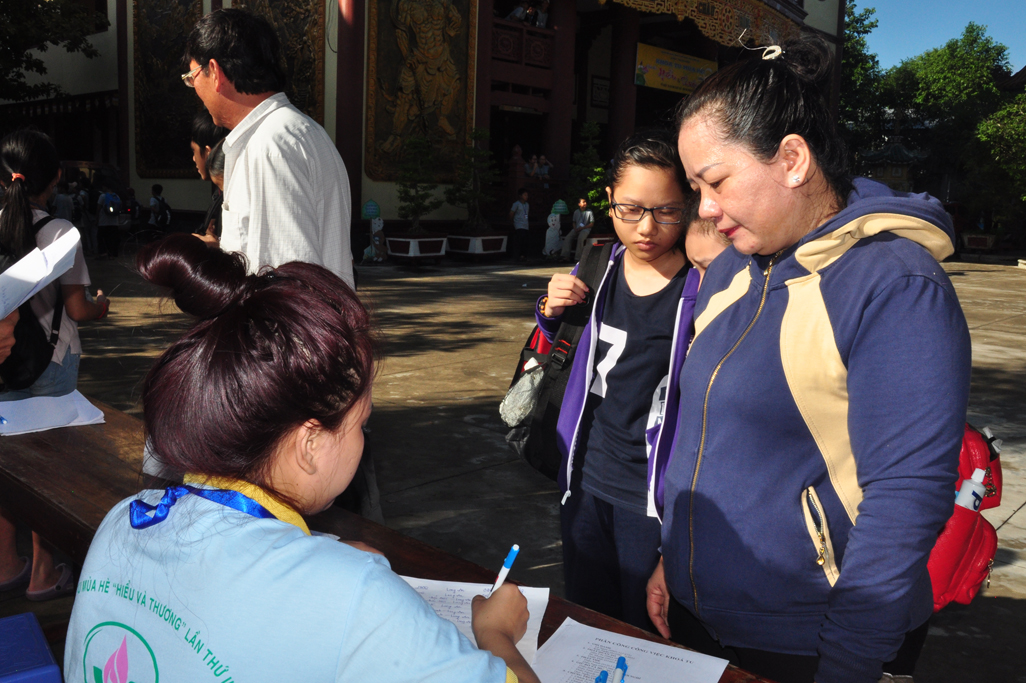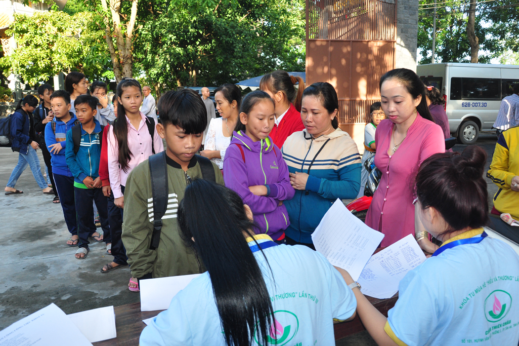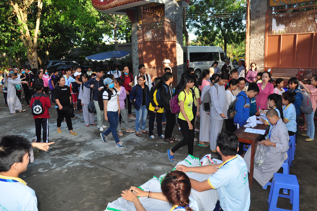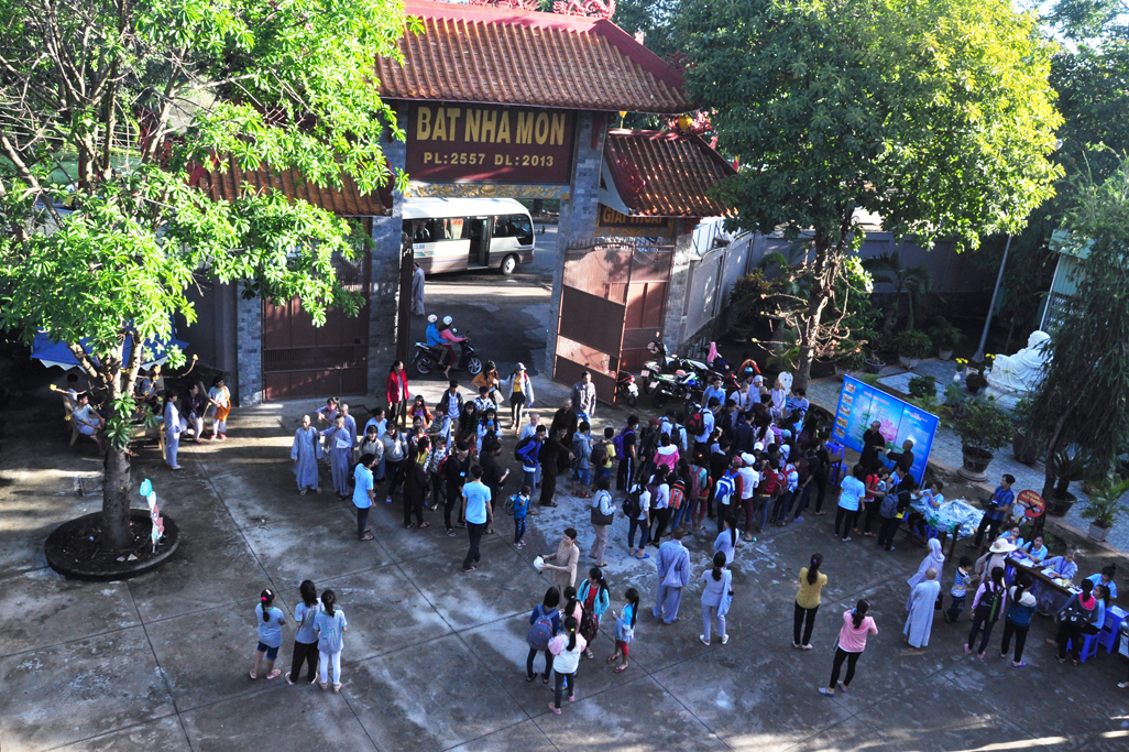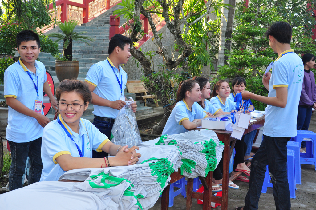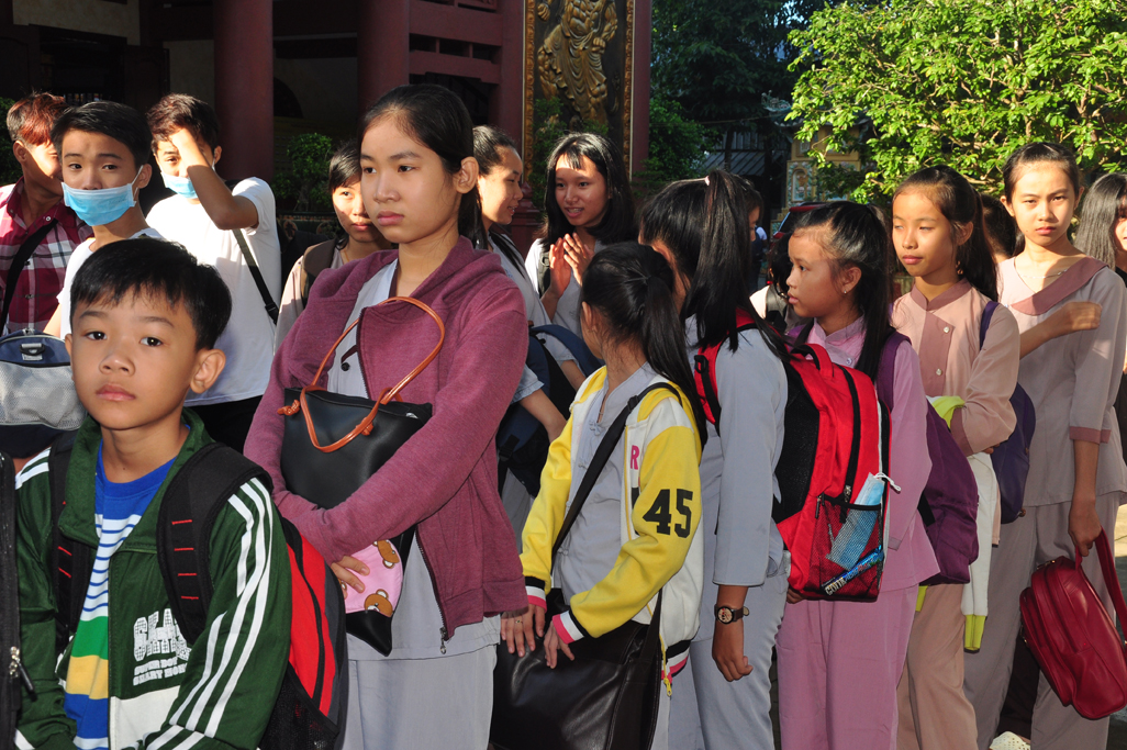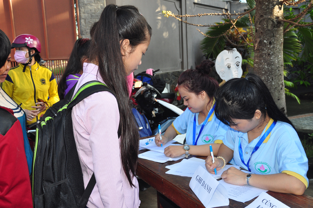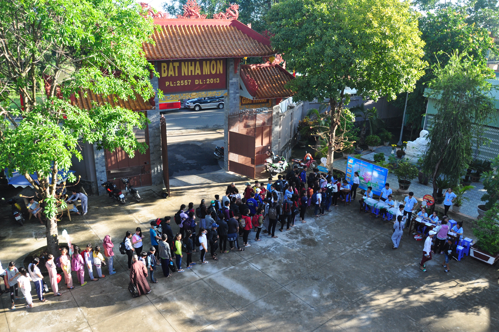 Các em được  quý thầy cô và các anh chị  hoan hỷ đón tiếp ghi danh, phát đồng phục và hướng dẫn dùng điểm tâm sáng.
