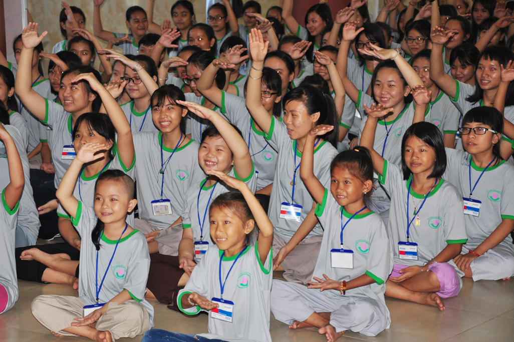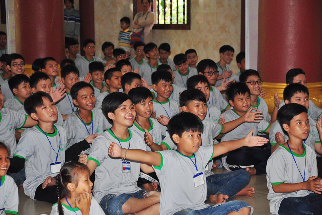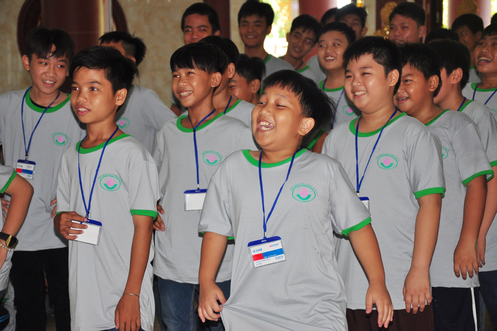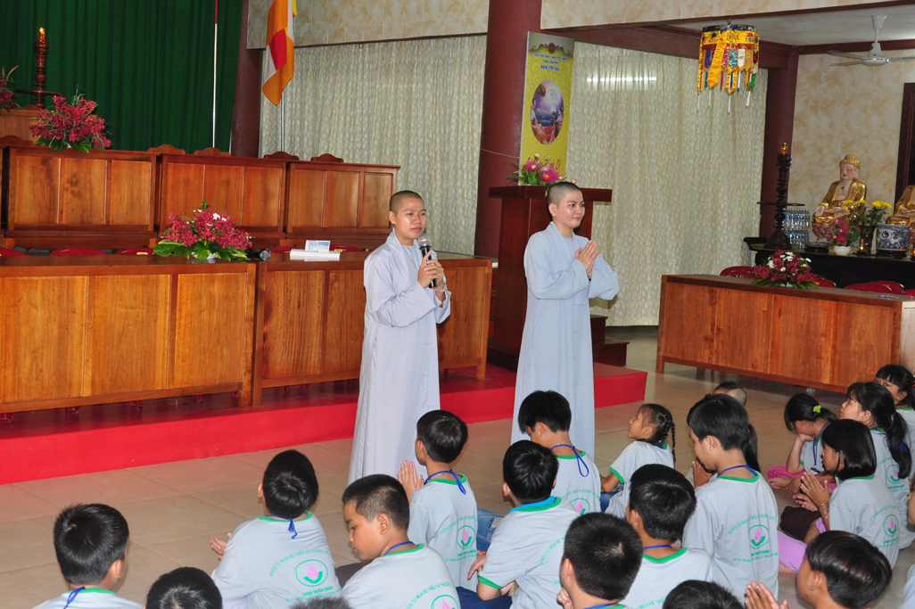 Đúng vào lúc 9 h các em được quý thầy cô chia đội chúng, dạy oai nghi, dạy hát và hướng dẫn các em những điều cần thiết chuẩn bi cho lễ khai mạc diễn ra 14 h chiều.