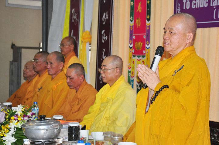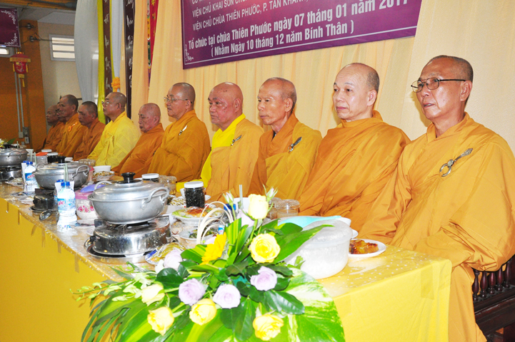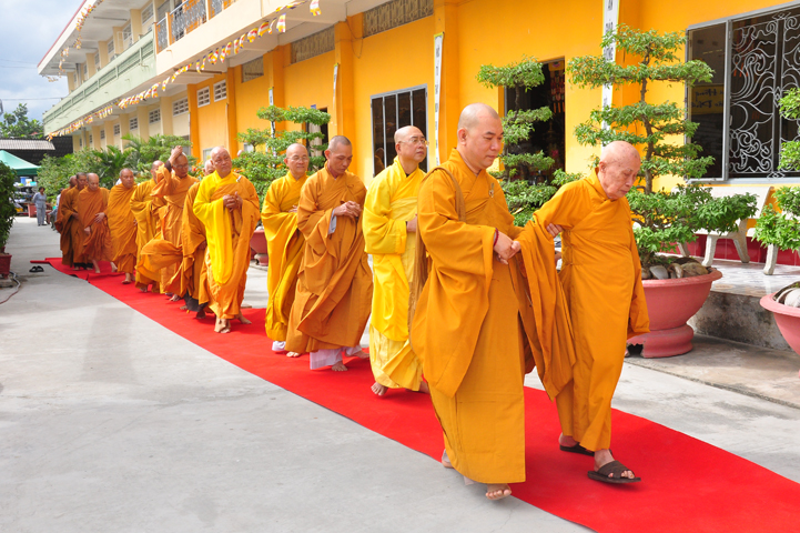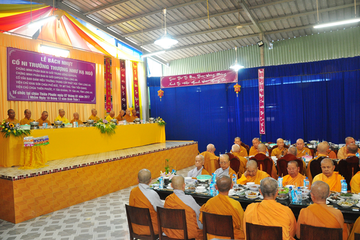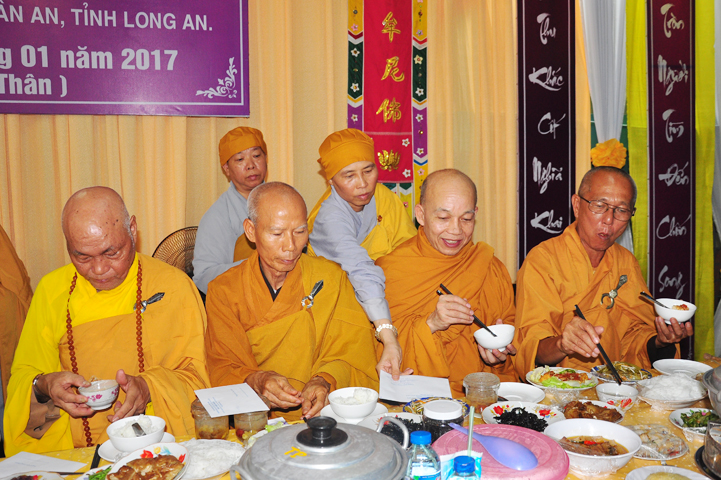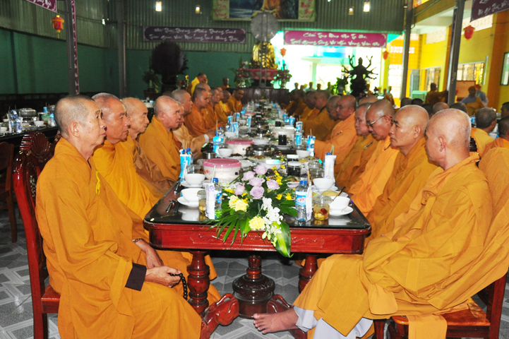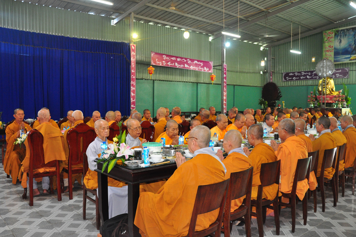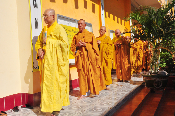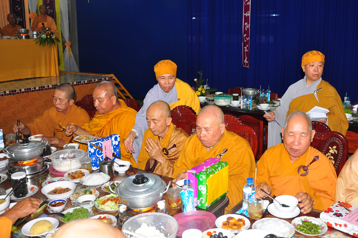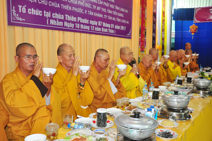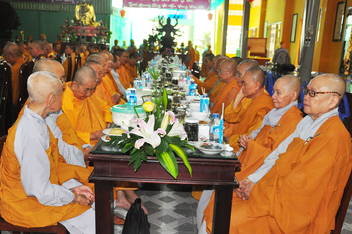 Chư tôn giáo phẩm quang lâm và chứng minh trai đường hôm nay gồm có: HT Thích Viên Giác, UVBTT HĐCMGHPGVN; HT Thích Minh Thiện-UVHĐTS, Phó trưởng Ban Hoằng pháp TW, Trưởng BTS GHPGVN, trụ trì chùa Thiên Châu, tỉnh Long An; HT Thích Thiện Huệ- CMBTS GHPGVN tỉnh Long AN; Chư tôn đức Giáo phẩm BTS GHPGVN tỉnh Long An; chư Tôn đức BTSPG thành phố Tân An, tỉnh Long An; Chư tôn đức Giáo phẩm Ban giám hiệu Trường Trung cấp Phật học Long An, cùng chư tôn đức Tăng trụ trì các tự viện trong tỉnh Long An, tỉnh Tiền Giang; TT Giác Thiện trụ trì chùa Phước Long (Tiền Giang) xướng lễ nghi thức cúng Quá đường.