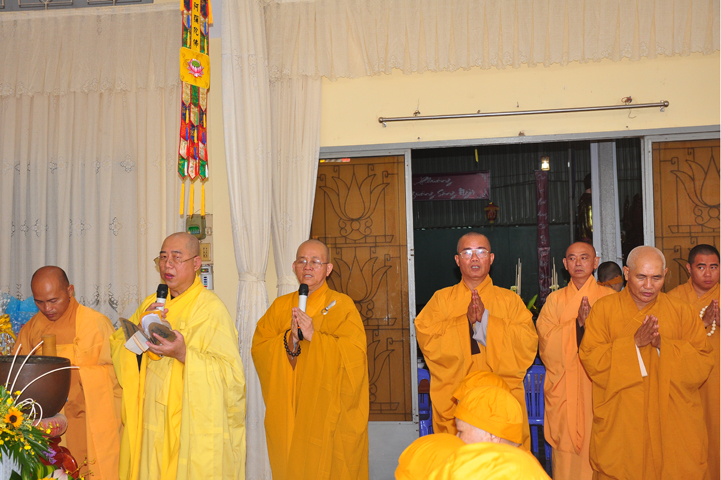 Đại đức Thích Lệ Trí, Chánh thư ký BTSGHPG tỉnh Long An, đại lao cho toàn thể môn nhân pháp quyến dâng lời cung thỉnh. Đồng thời Đại đức cũng là người đại lao cho chư tôn đức, thành kích tuyên đọc sơ lược tiểu sử cũng như công hạnh của cố NT, trước khi tác pháp cúng dường.