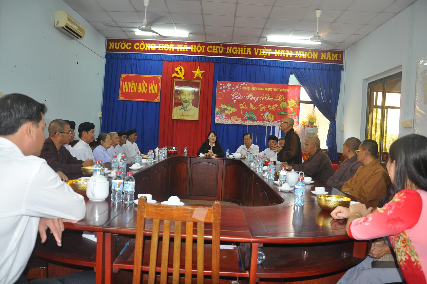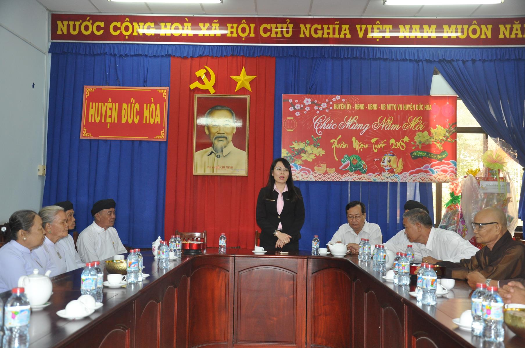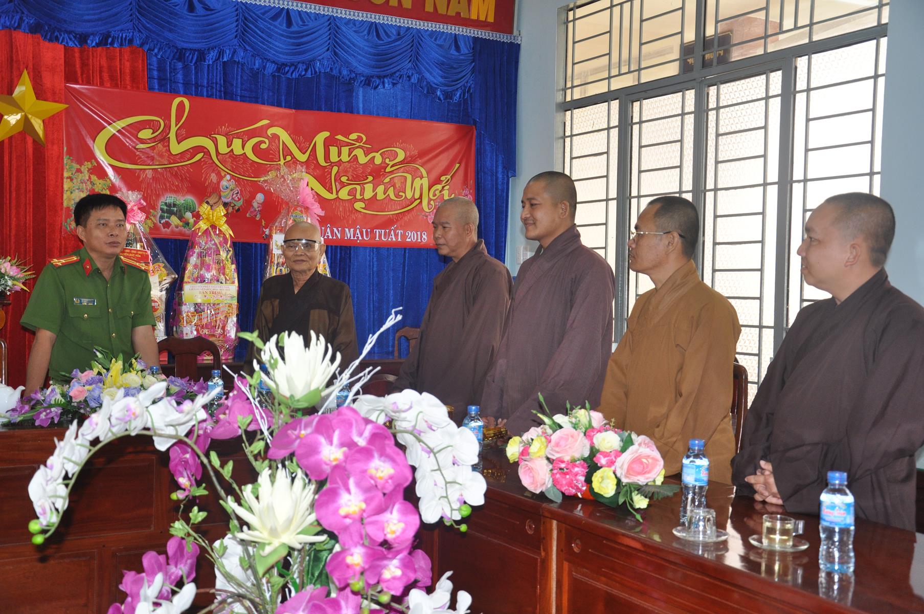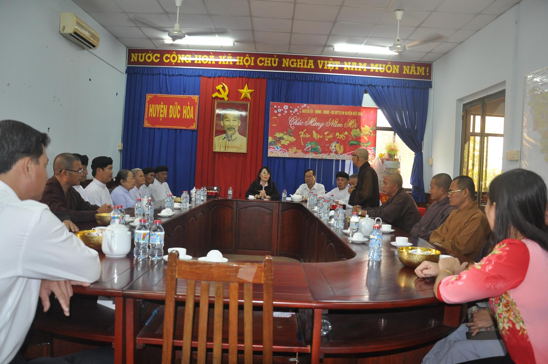 Trong không khí vui xuân 2018, chuẩn bị đón ngày Tết cổ truyền thiêng liêng của Dân tộc, sáng ngày 9 tháng 02 năm 2017(24/12/ Đinh Dậu) phái đoàn Thường trực Ban Trị Sự GHPGVN liên huyện Đức Hòa – Đức Huệ do Hòa thượng Thích Thiện Phúc- Ủy viên BTS GHPGVN tỉnh Long An – Trưởng ban BTS GHPGVN liên huyện Đức Hòa – Đức Huệ làm trưởng đoàn cùng Chư tôn đức trong Thường trực Ban Trị sự liên huyện đến thăm và chúc Tết các Ban ngành đoàn thể chính quyền tại huyện Đức Hòa, gồm có: Huyện ủy, Ủy Ban Nhân Dân, Ủy ban Mặt Trận Tổ quốc Việt Nam, Công An và phòng Nội vụ huyện.
