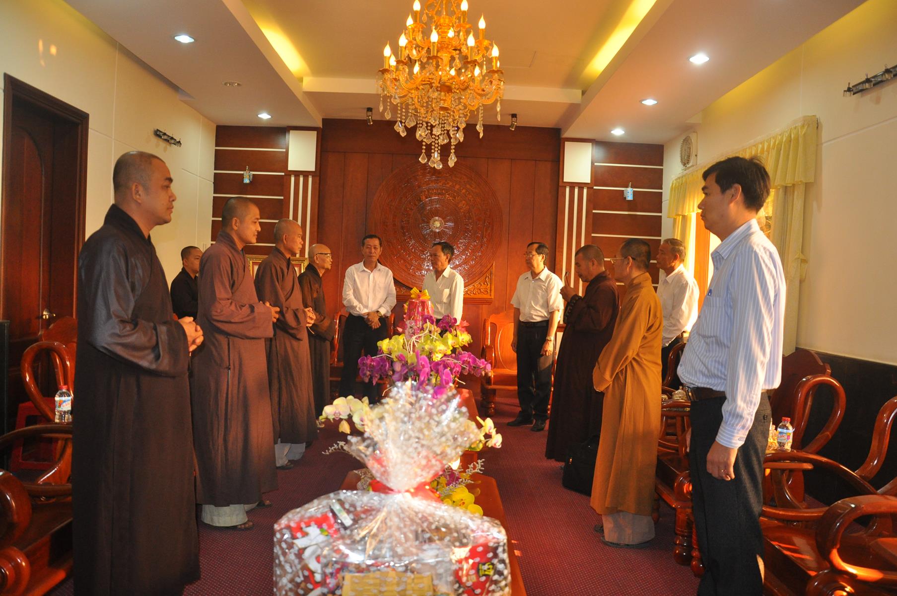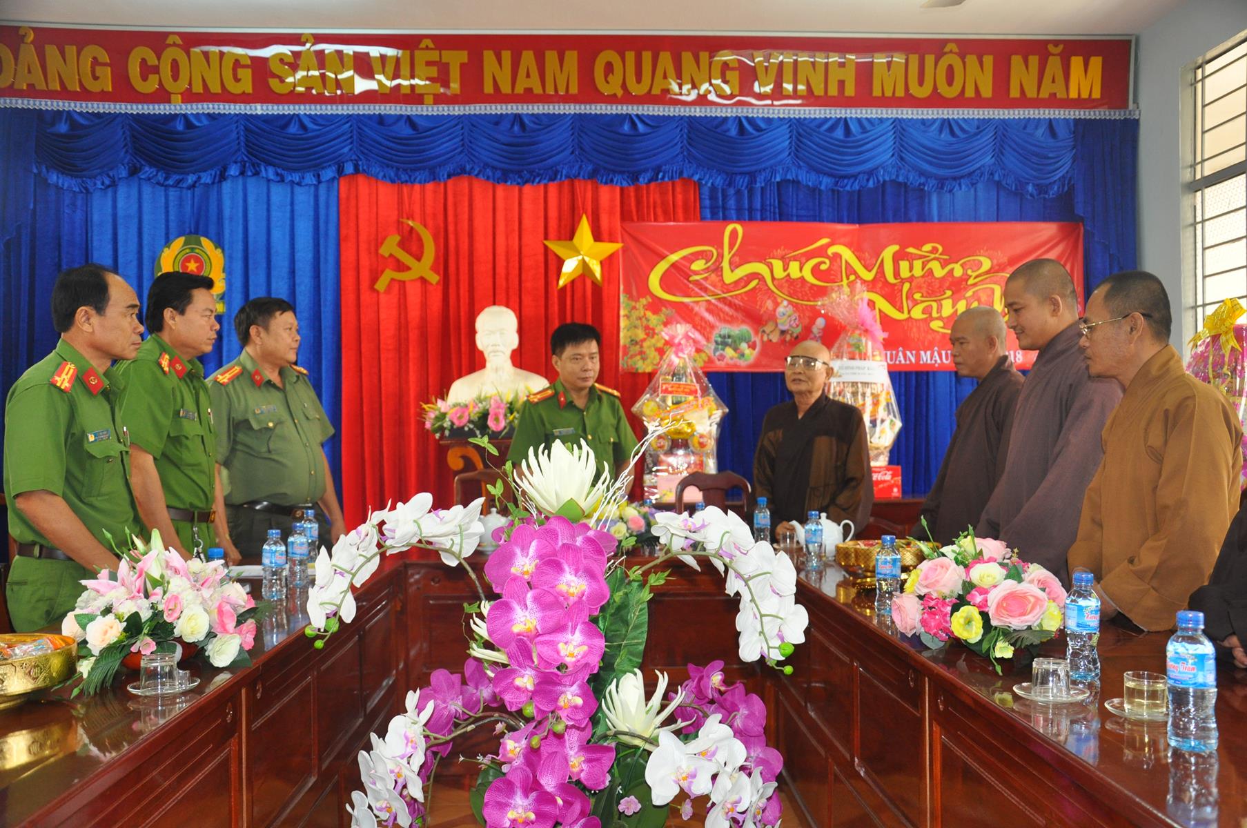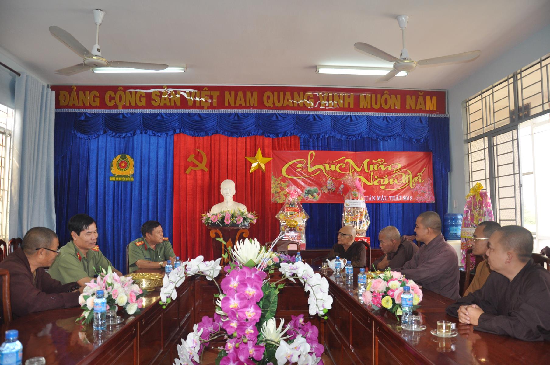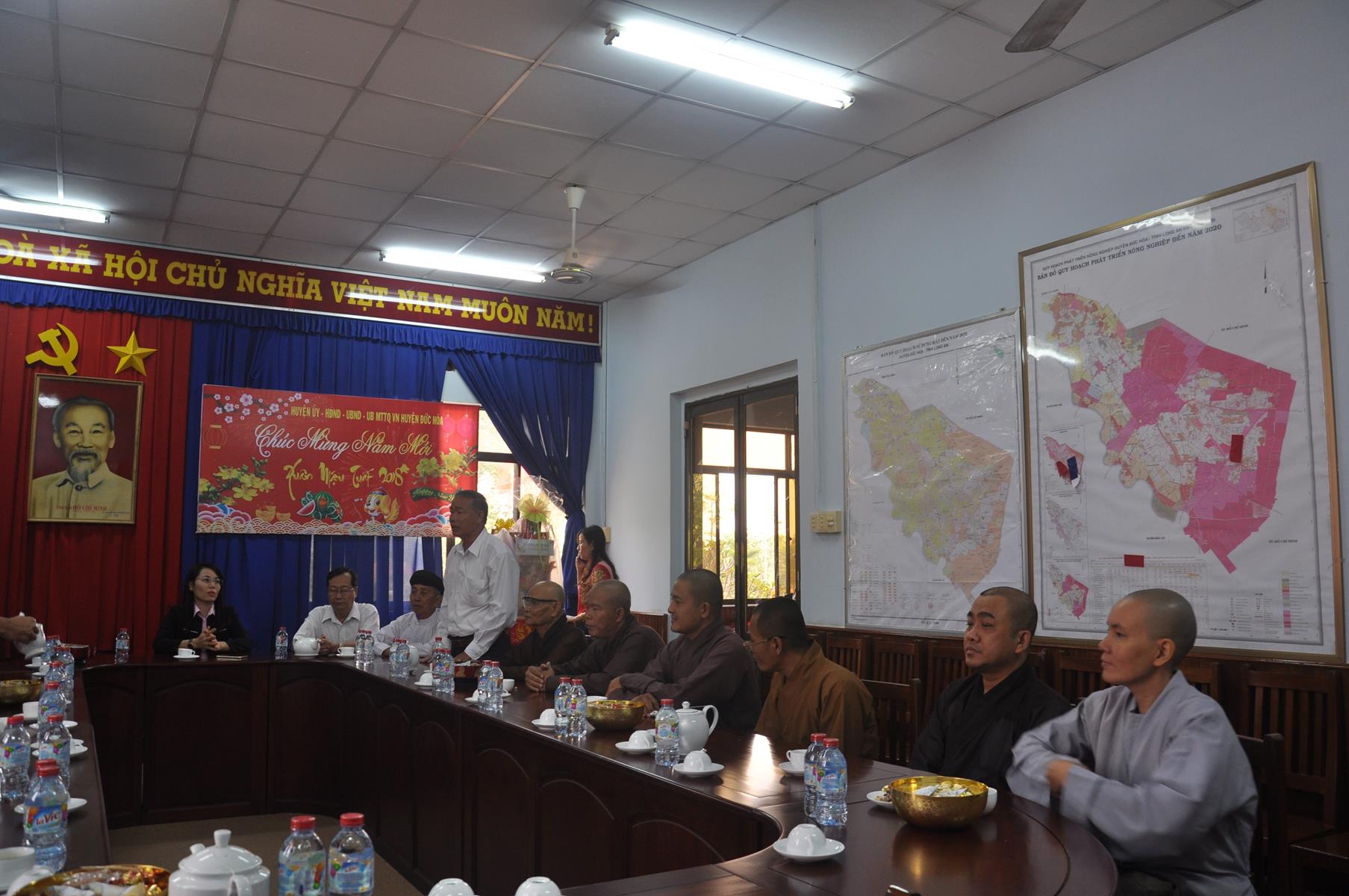 Trong không khí vui xuân 2018, chuẩn bị đón ngày Tết cổ truyền thiêng liêng của Dân tộc, sáng ngày 9 tháng 02 năm 2017(24/12/ Đinh Dậu) phái đoàn Thường trực Ban Trị Sự GHPGVN liên huyện Đức Hòa – Đức Huệ do Hòa thượng Thích Thiện Phúc- Ủy viên BTS GHPGVN tỉnh Long An – Trưởng ban BTS GHPGVN liên huyện Đức Hòa – Đức Huệ làm trưởng đoàn cùng Chư tôn đức trong Thường trực Ban Trị sự liên huyện đến thăm và chúc Tết các Ban ngành đoàn thể chính quyền tại huyện Đức Hòa, gồm có: Huyện ủy, Ủy Ban Nhân Dân, Ủy ban Mặt Trận Tổ quốc Việt Nam, Công An và phòng Nội vụ huyện.