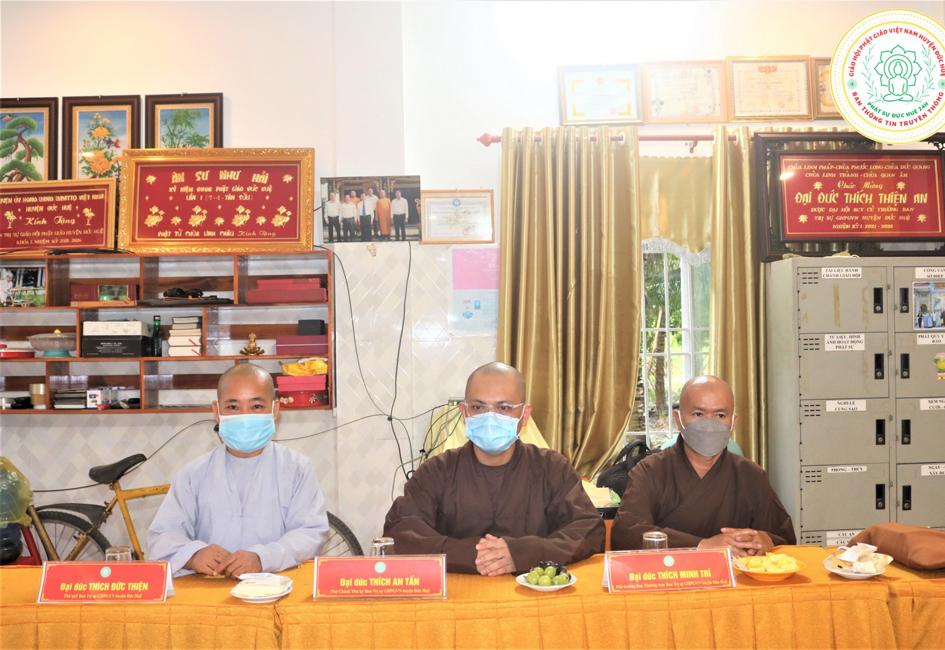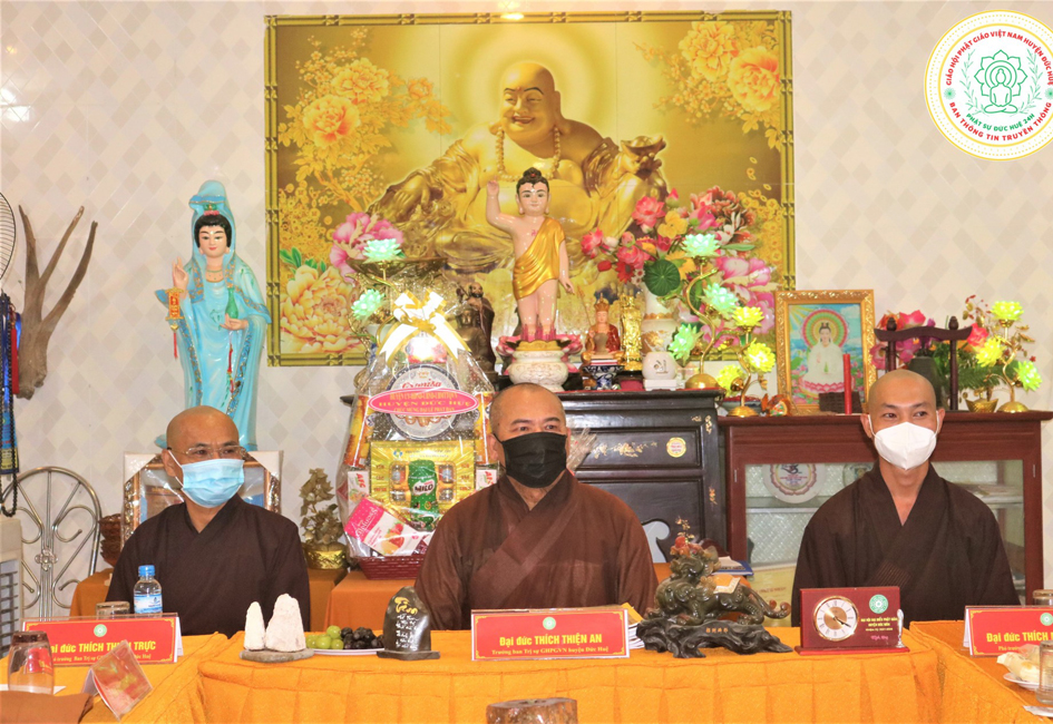 Ban Thường trực Ban Trị sự Phật giáo huyện Đức Huệ có: Đại đức Thích Thiện An – Trưởng Ban trị sự GHPGVN huyện Đức Huệ; Đại đức Thích Thiện Trực, Đại đức Thích Minh Nguyệt đồng Phó trưởng BTS GHPGVN huyện Đức Huệ; Đại đức Thích Trí Huệ Chánh thư ký BTS GHPGVN huyện Đức Huệ; Đạo hữu Lệ Kiệt- Chánh phó văn phòng BTS GHPGVN tỉnh Long An cùng Chư Tôn đức thường trực BTS GHPGVN huyện Đức Huệ.