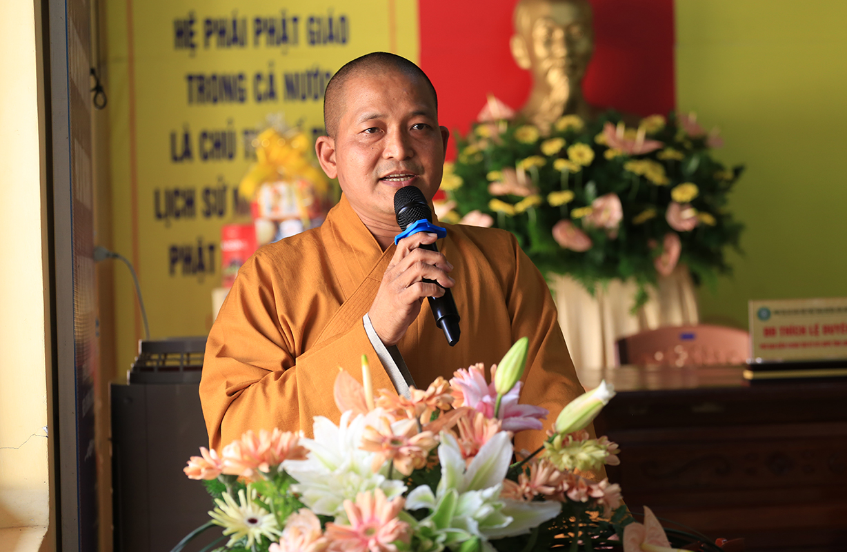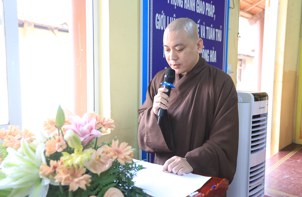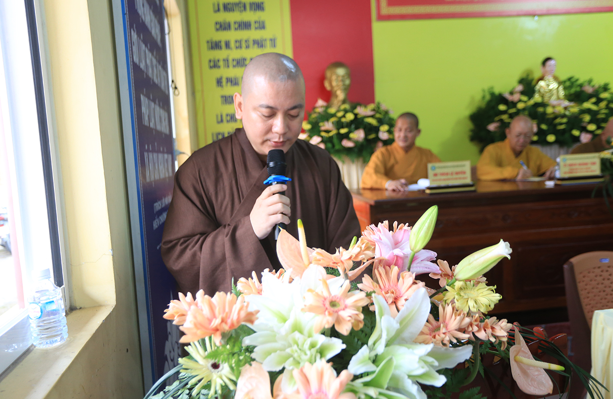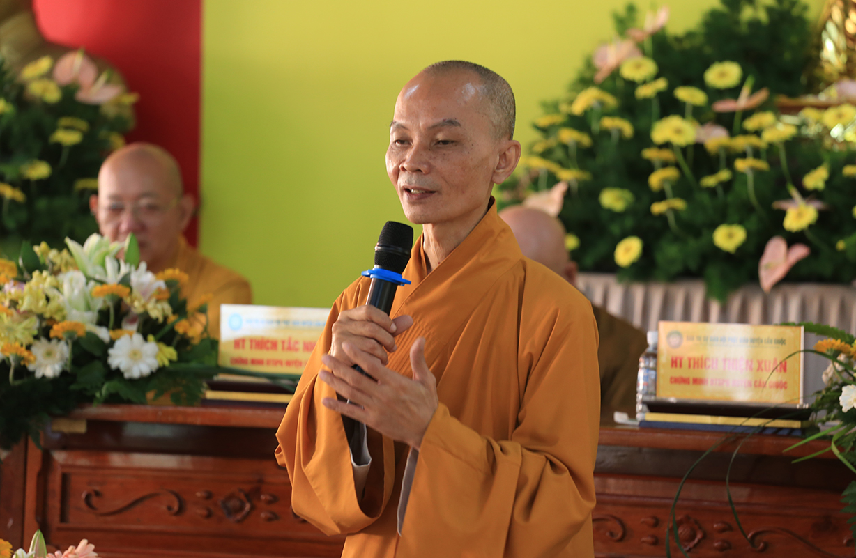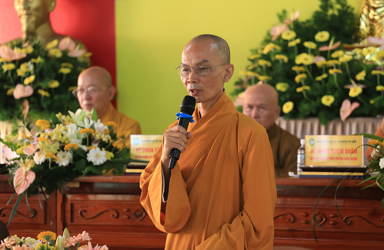 TT. Thích Quảng Tâm – UV HĐTS, Phó BTS GHPGVN tỉnh Long An có lời phát biểu. Thượng toạ gửi lời thăm hỏi và chúc mừng Hội nghị của Hòa Thượng Trưởng BTS GHPGVN tỉnh Long An đến BTS GHPGVN huyện Cần Giuộc. Bên cạnh đó, Thượng toạ tán dương thành tích của các ban chuyên ngành BTS huyện Cần Giuộc đạt được trong năm 2024, cũng như tán thán thành tích cao của đơn vị Phật giáo Cần Giuộc tại Hội thi Giáo lý Phật tử vừa qua. Thượng toạ thông tri về Đại lễ Vesak năm 2025 sẽ được tổ chức tại Học Viện Phật Giáo Việt Nam tại TP.HCM. Phật giáo tỉnh Long An, cụ thể, Chùa Tôn Thạnh là một trong những điểm sẽ đón tiếp đông đảo các phái đoàn Tăng Ni Phật tử từ các tỉnh phía Bắc về tham dự lễ Vesak. Về Đại giới đàn Đạt Pháp, Thượng toạ hy vọng Chư Tôn đức BTS huyện Cần Giuộc hỗ trợ để Đại giới đàn được thành tựu tốt đẹp.