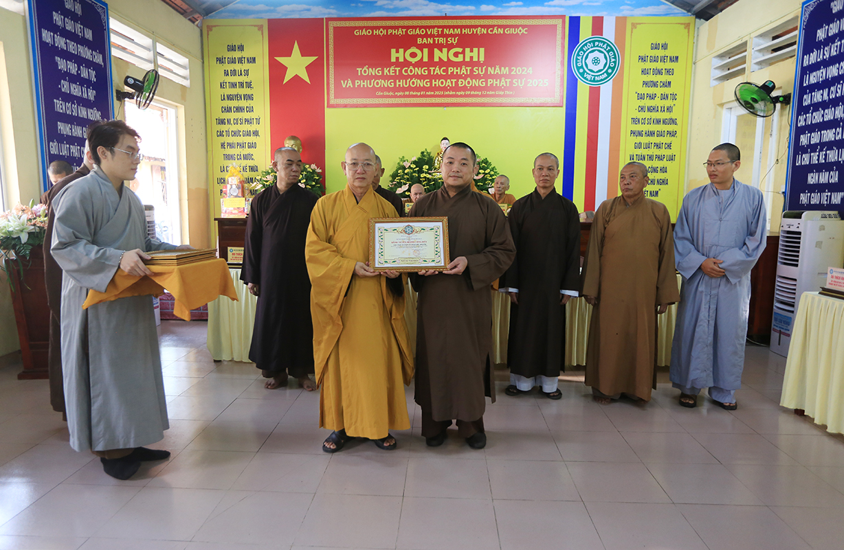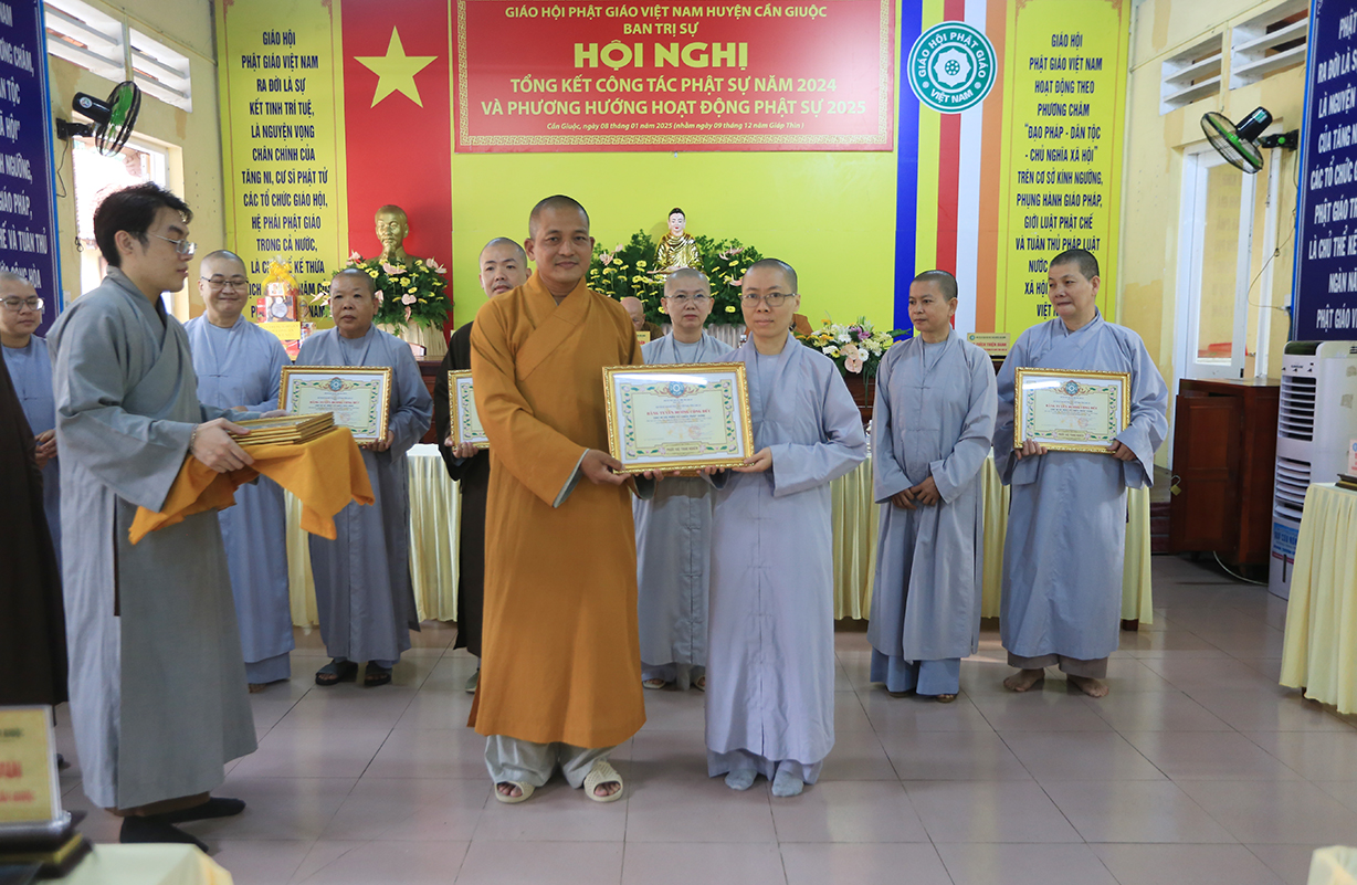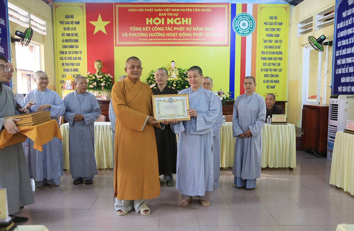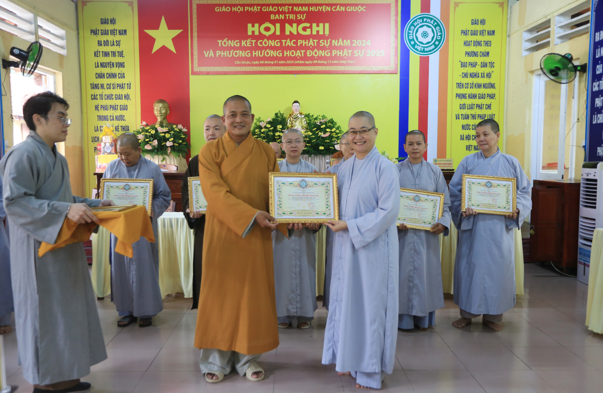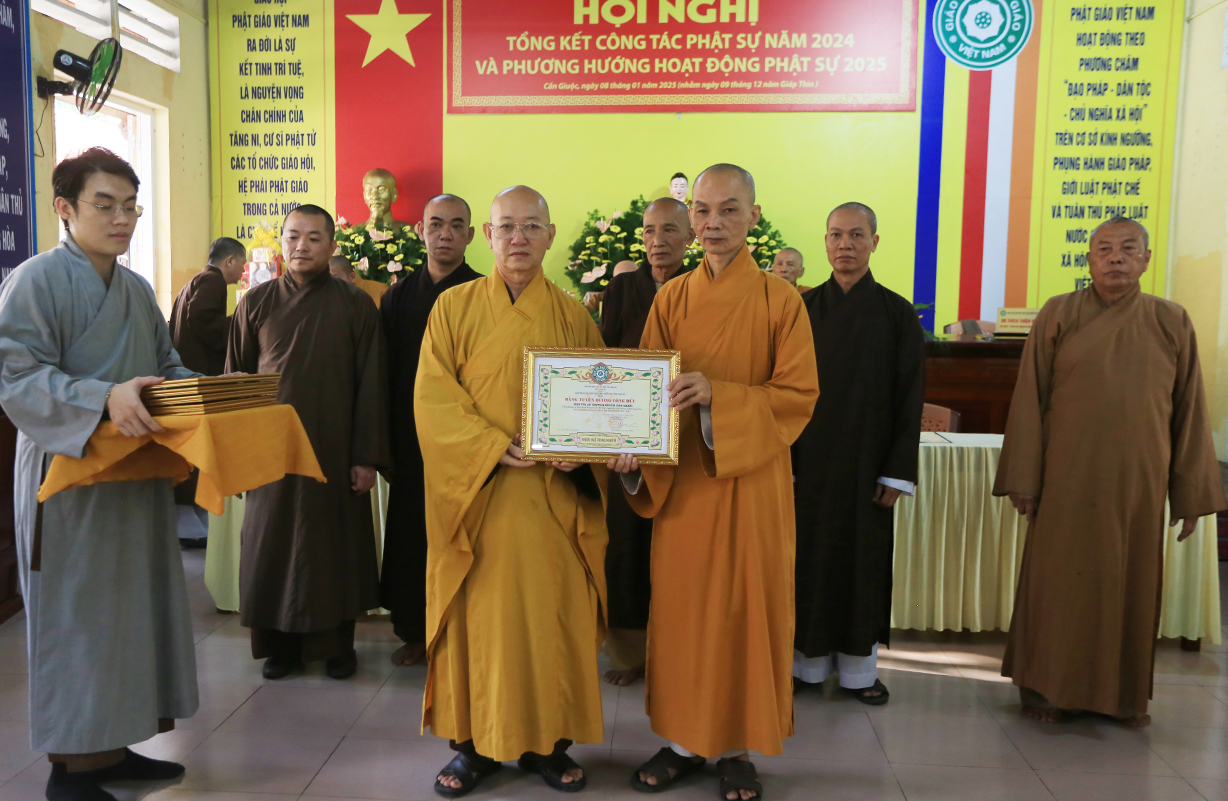 Dịp này, Thường trực BTS GHPGVN tỉnh Long An đã trao bằng Tuyên dương công đức đến 16 tập thể nhằm ghi nhận và tuyên dương công đức đóng góp, hỗ trợ tích cực cho các hoạt động Phật sự năm 2024.