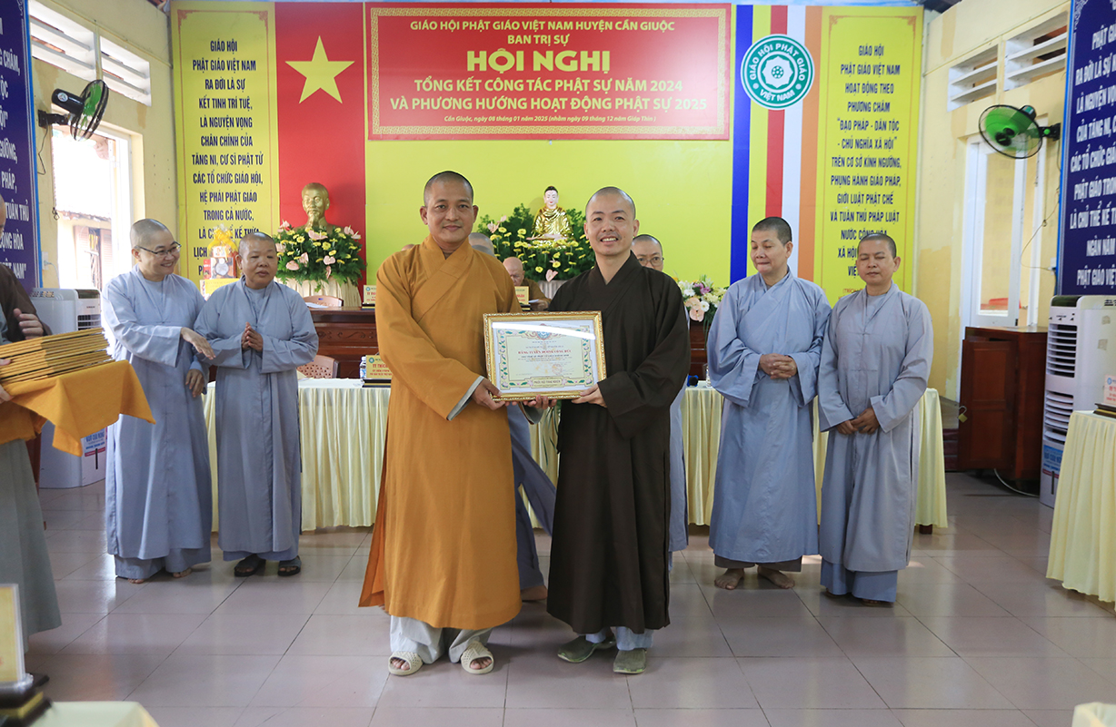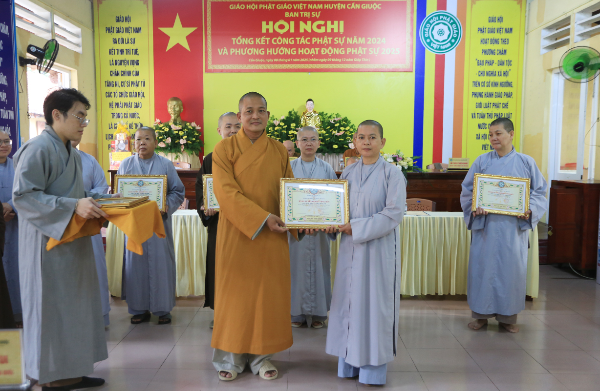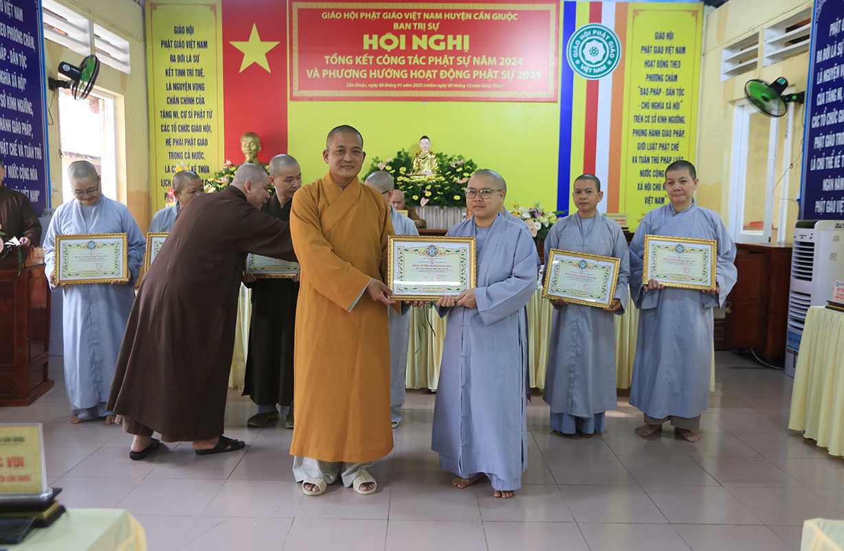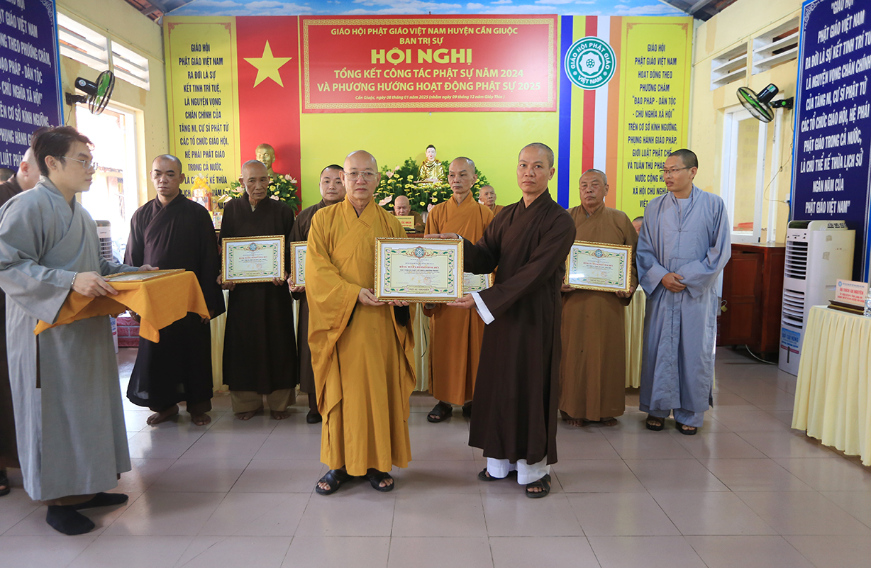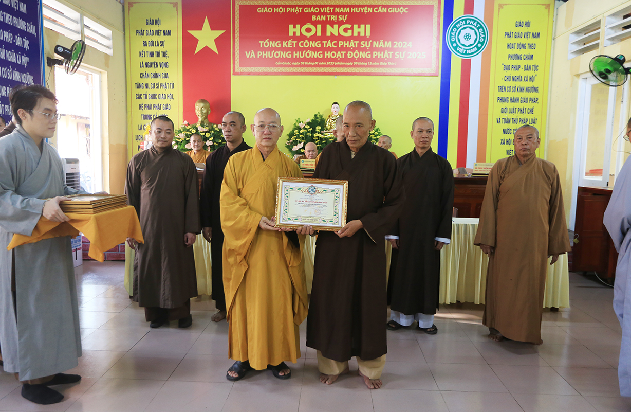 Dịp này, Thường trực BTS GHPGVN tỉnh Long An đã trao bằng Tuyên dương công đức đến 16 tập thể nhằm ghi nhận và tuyên dương công đức đóng góp, hỗ trợ tích cực cho các hoạt động Phật sự năm 2024.