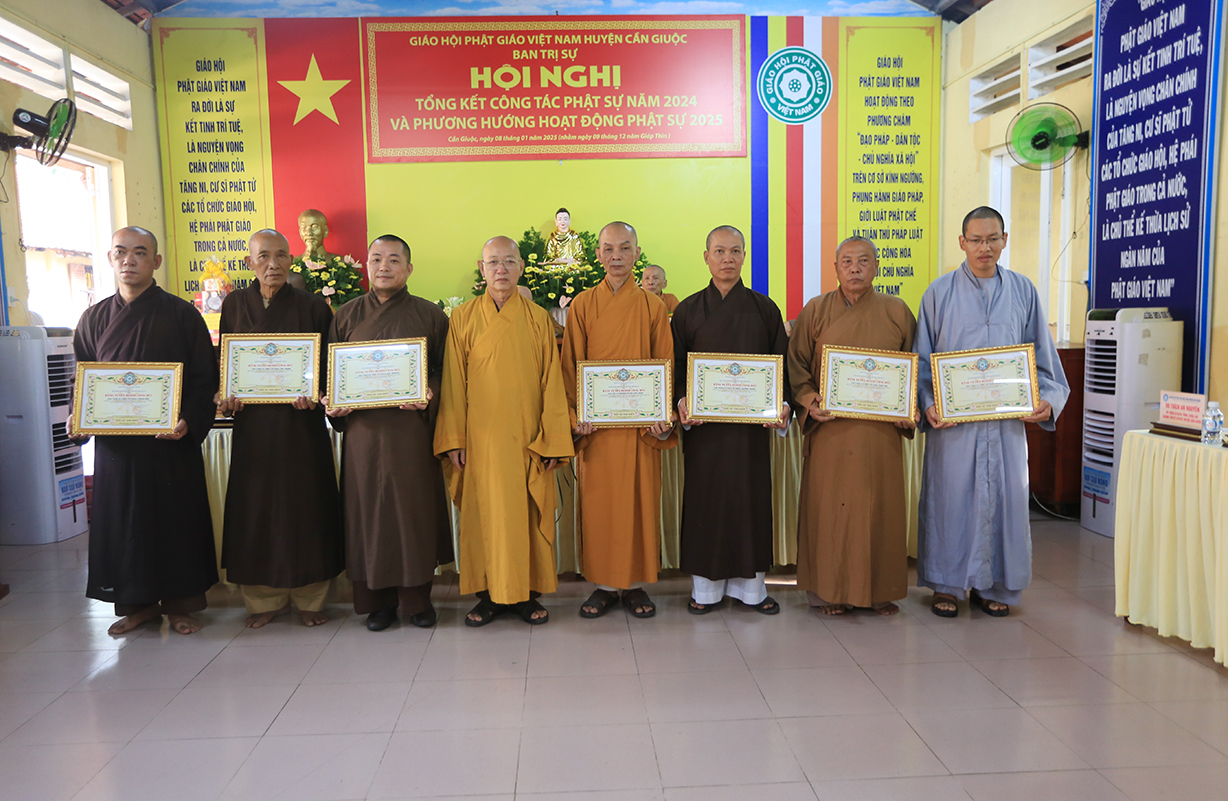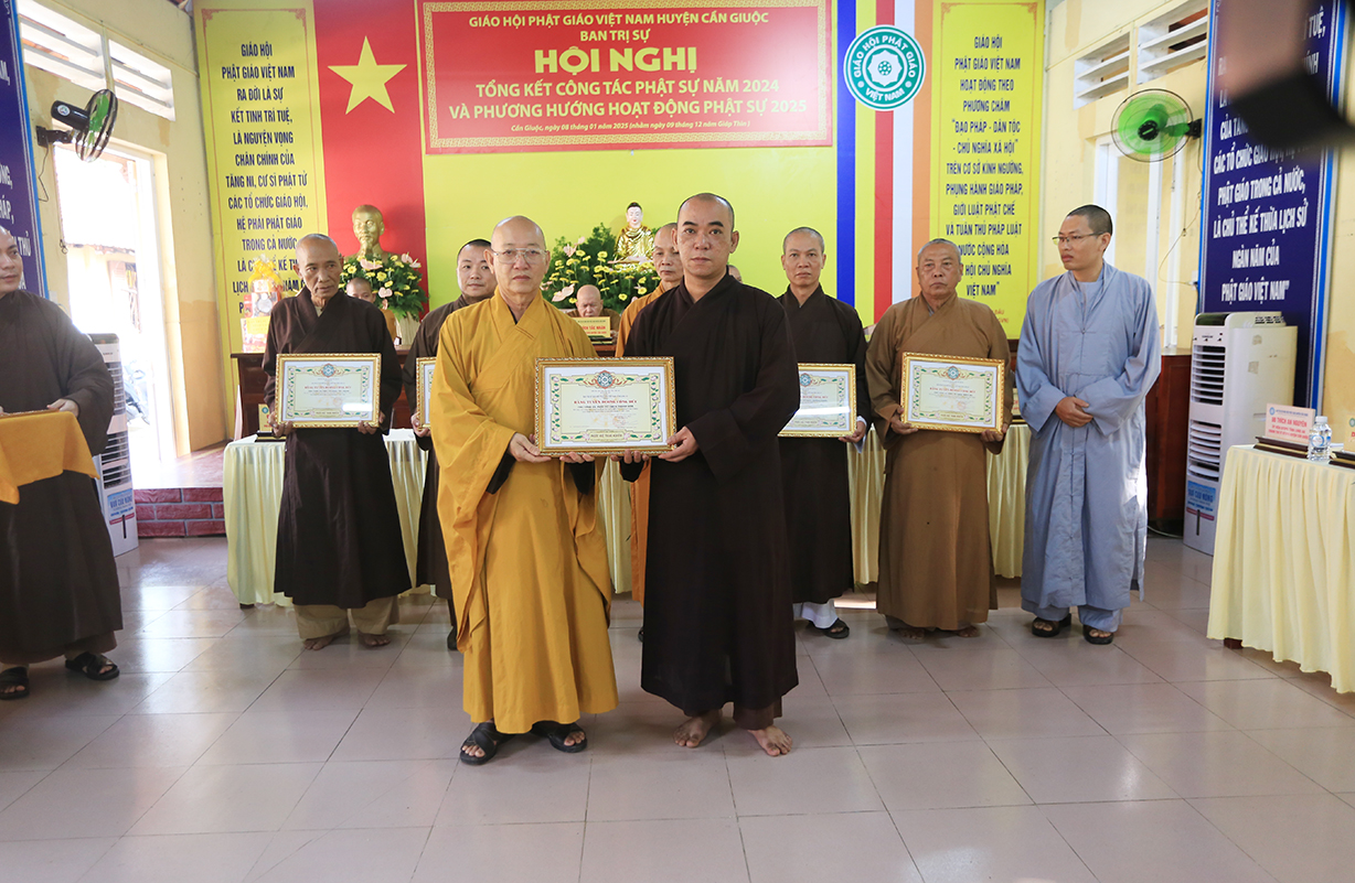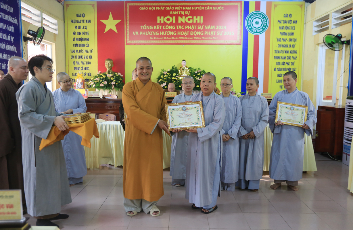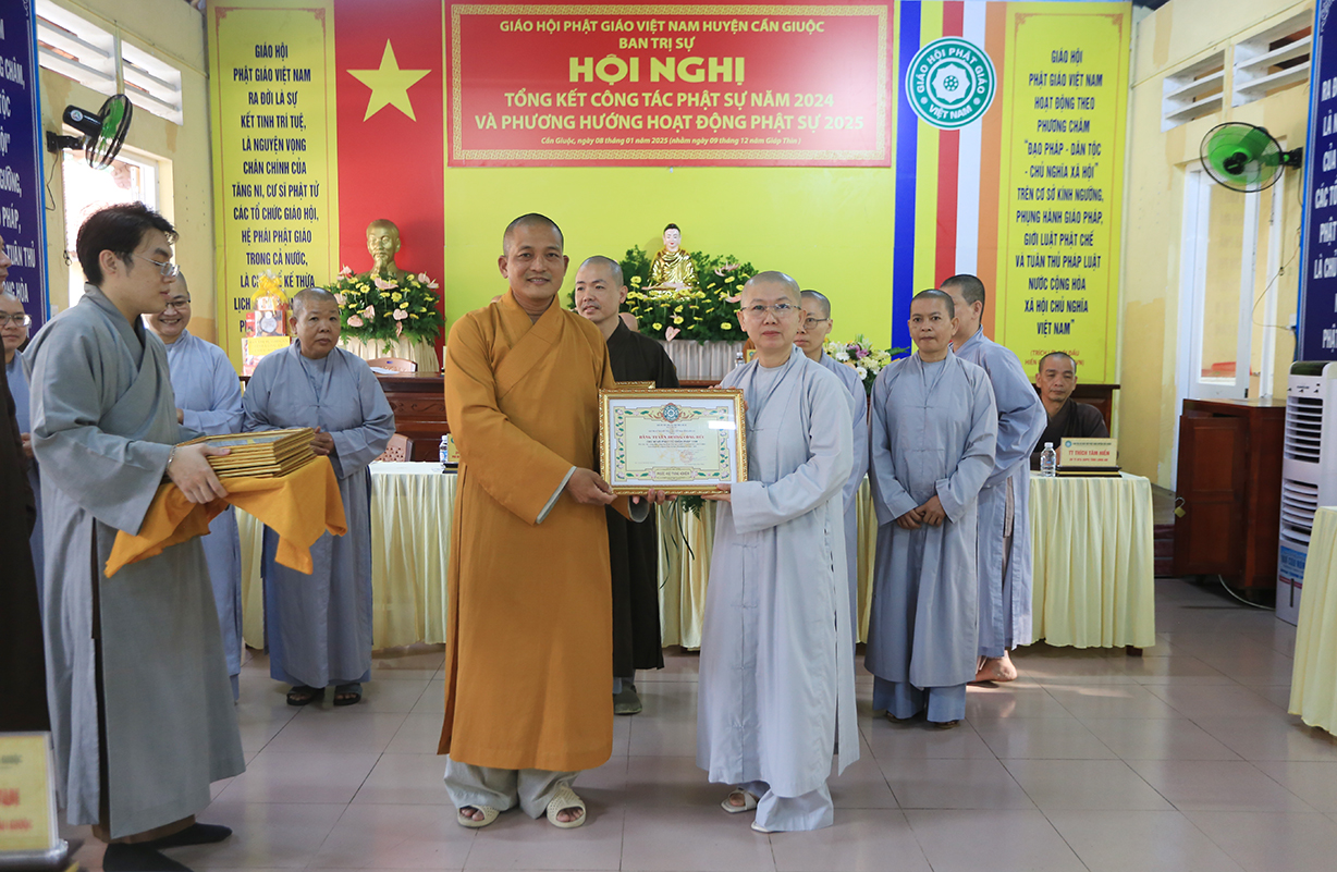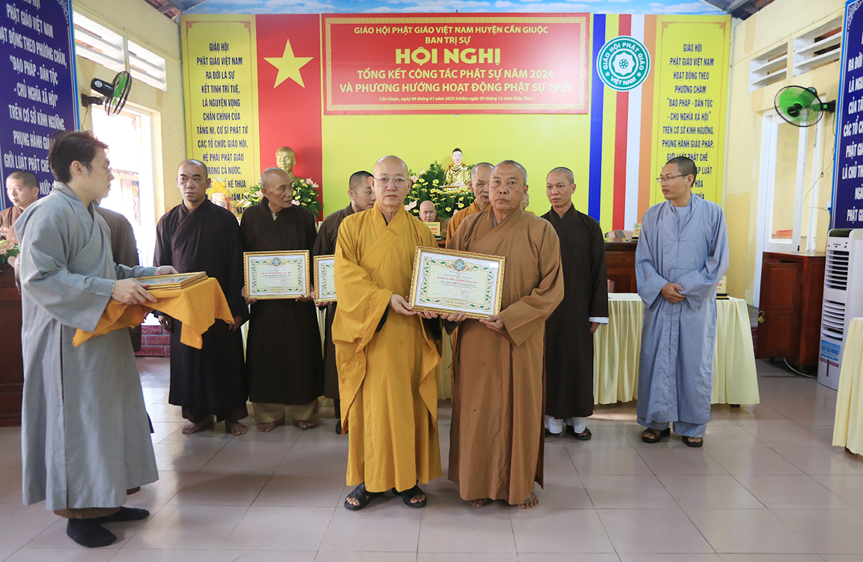Dịp này, Thường trực BTS GHPGVN tỉnh Long An đã trao bằng Tuyên dương công đức đến 16 tập thể nhằm ghi nhận và tuyên dương công đức đóng góp, hỗ trợ tích cực cho các hoạt động Phật sự năm 2024.