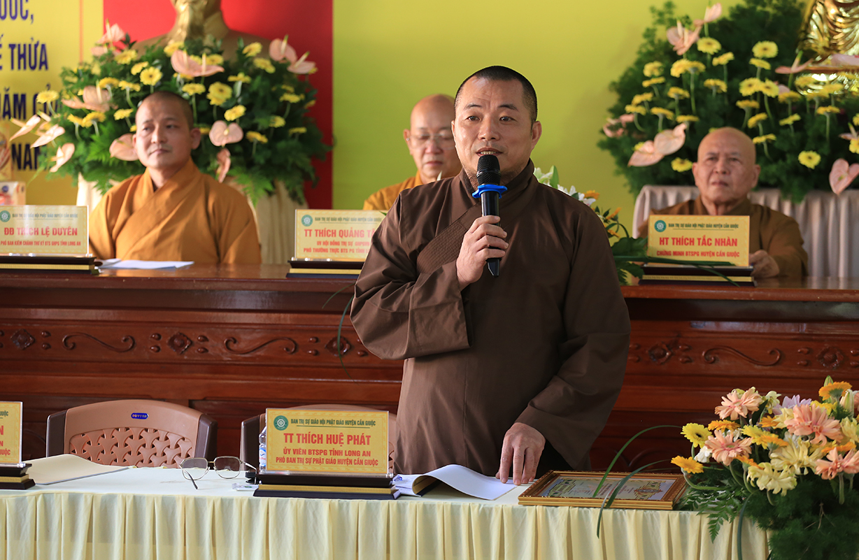Thay mặt Văn phòng BTS GHPGVN tỉnh Long An, ĐĐ. Thích Lệ Duyên đã thông tin một số Phật sự của Phật giáo Long An trong năm 2025. Đại đức chúc mừng, ghi nhận công đức của BTS GHPGVN huyện Cần Giuộc và toàn thể Tăng Ni huyện nhà đã đạt được nhiều thành tựu trong công tác Phật sự năm 2024. Đại đức mong muốn Tăng Ni Phật tử huyện nhà phát tâm hỗ trợ Đại Giới Đàn Đạt Pháp và Đại lễ Phật đản Vesak Liên Hiệp Quốc 2025.