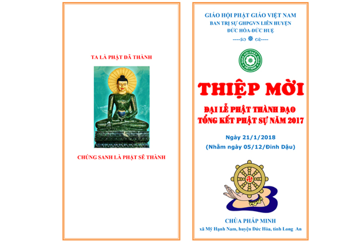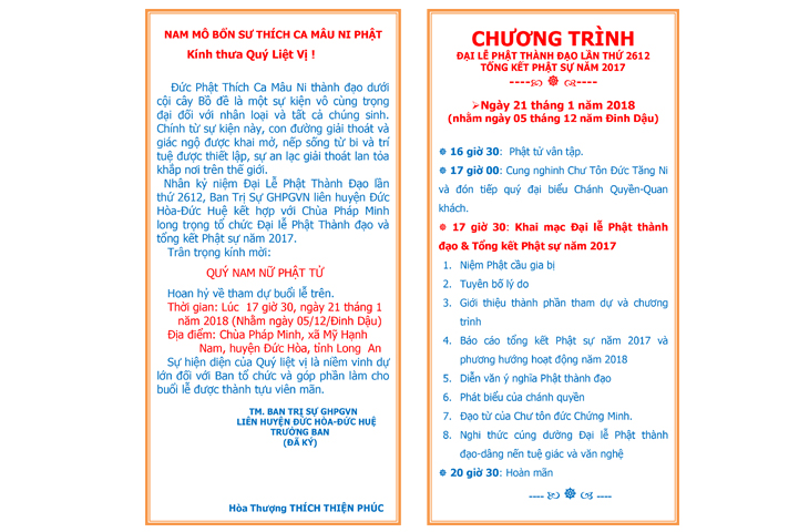 Nhân kỷ niệm Đại Lễ Phật Thành Đạo lần thứ 2612, Ban Trị Sự GHPGVN liên huyện Đức Hòa-Đức Huệ kết hợp với Chùa Pháp Minh long trọng tổ chức Đại lễ Phật Thành đạo và tổng kết Phật sự năm 2017.
