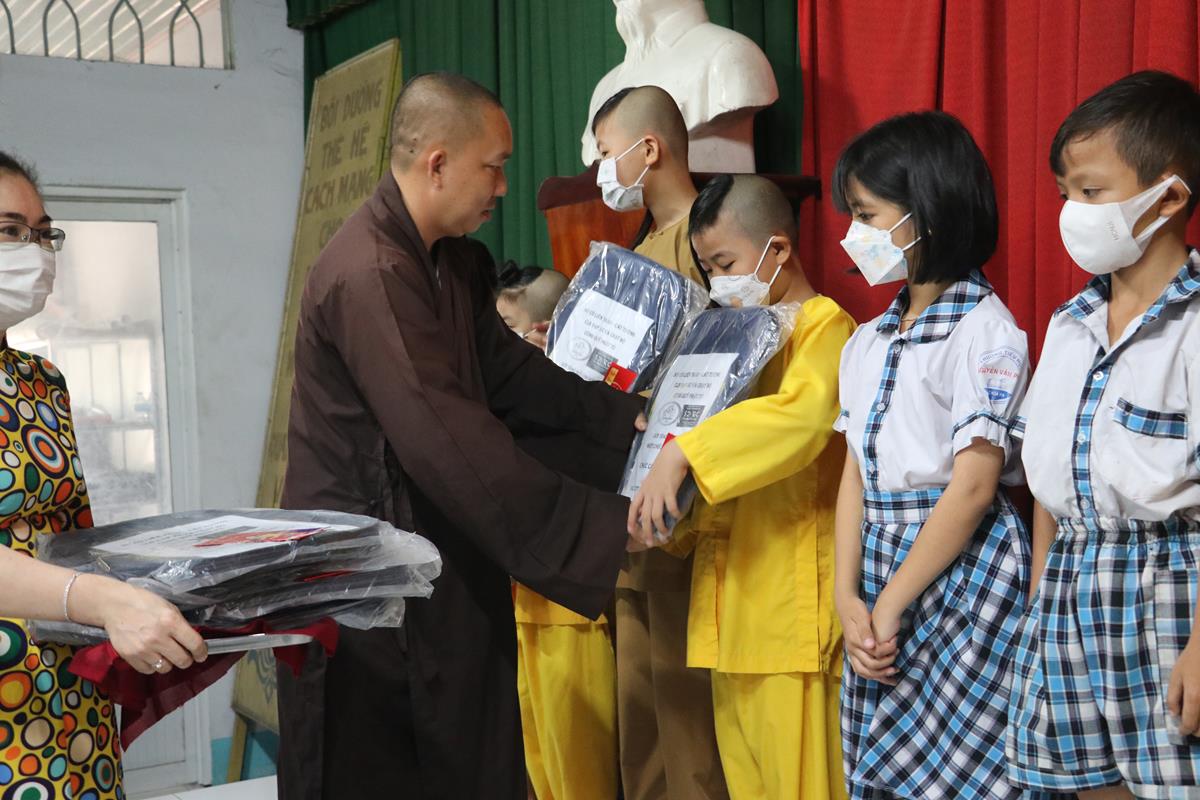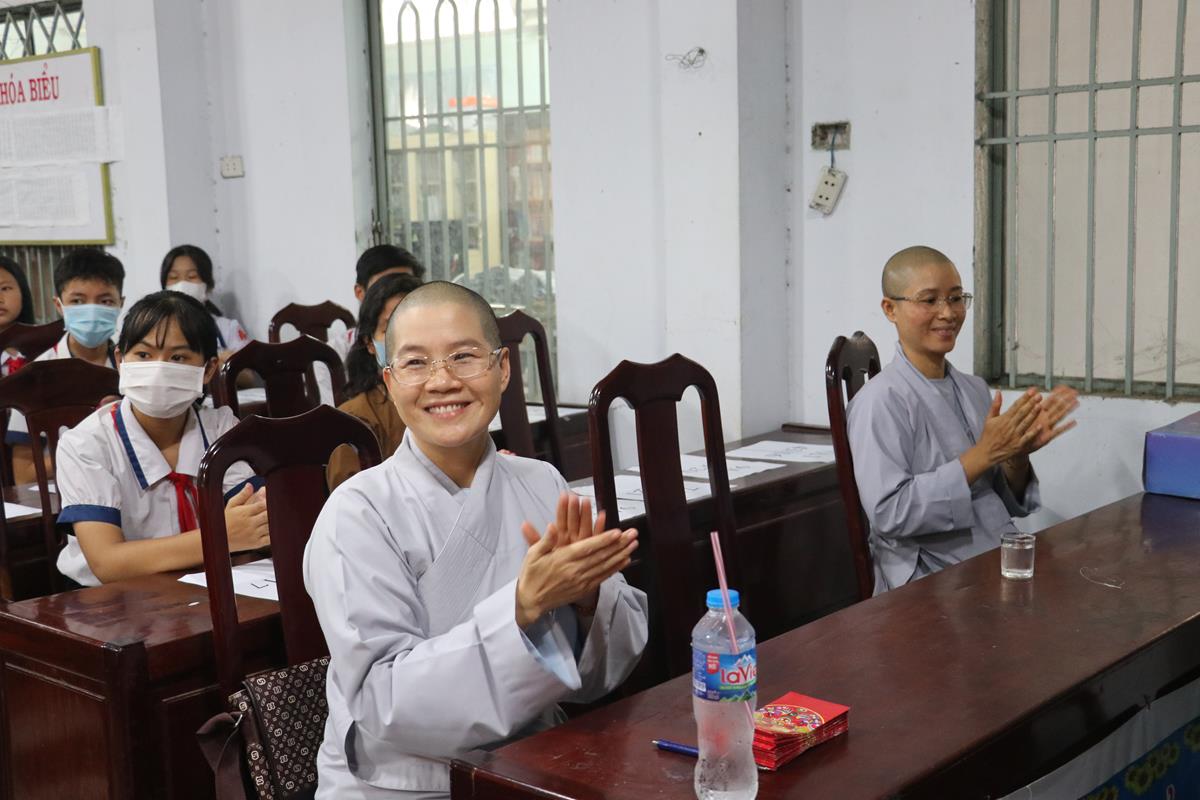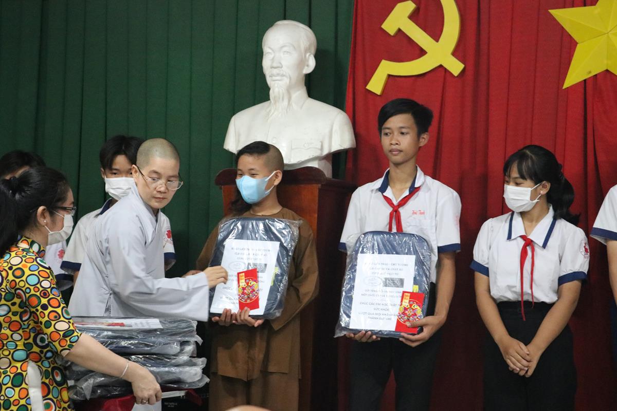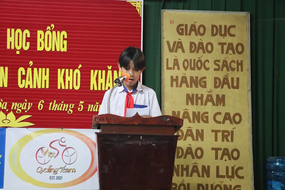 Thay mặt các em học sinh nhận quà, em Bùi Bình Minh học sinh lớp 9A5 trường THCS Võ Văn Tần có lời phát biểu tri ân Chư tôn đức, SC. Thích Nữ Liên Thảo và quý Mạnh Thường quân đã hỗ trợ những phần quà tới các em. Em hứa sẽ nỗ lực học tập để có một kết quả thật tốt trong kỳ thi sắp tới. Cuối lời em gửi lời tri ân chân thành và lời chúc sức khỏe tới toàn thể hội trường.
