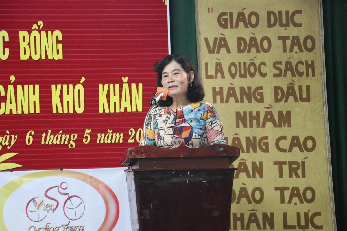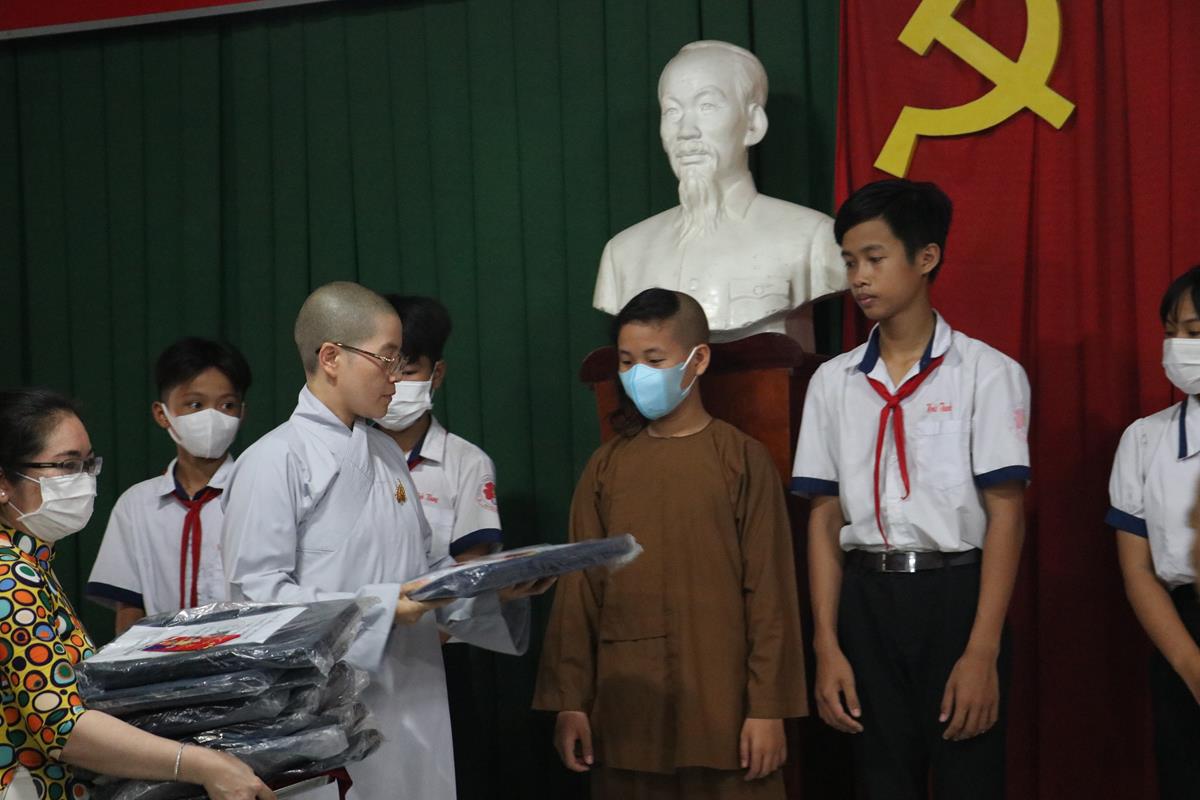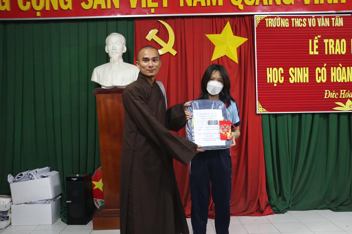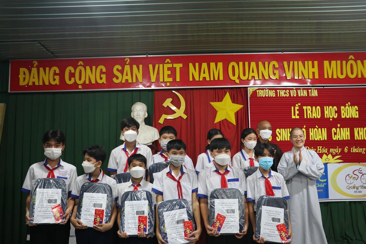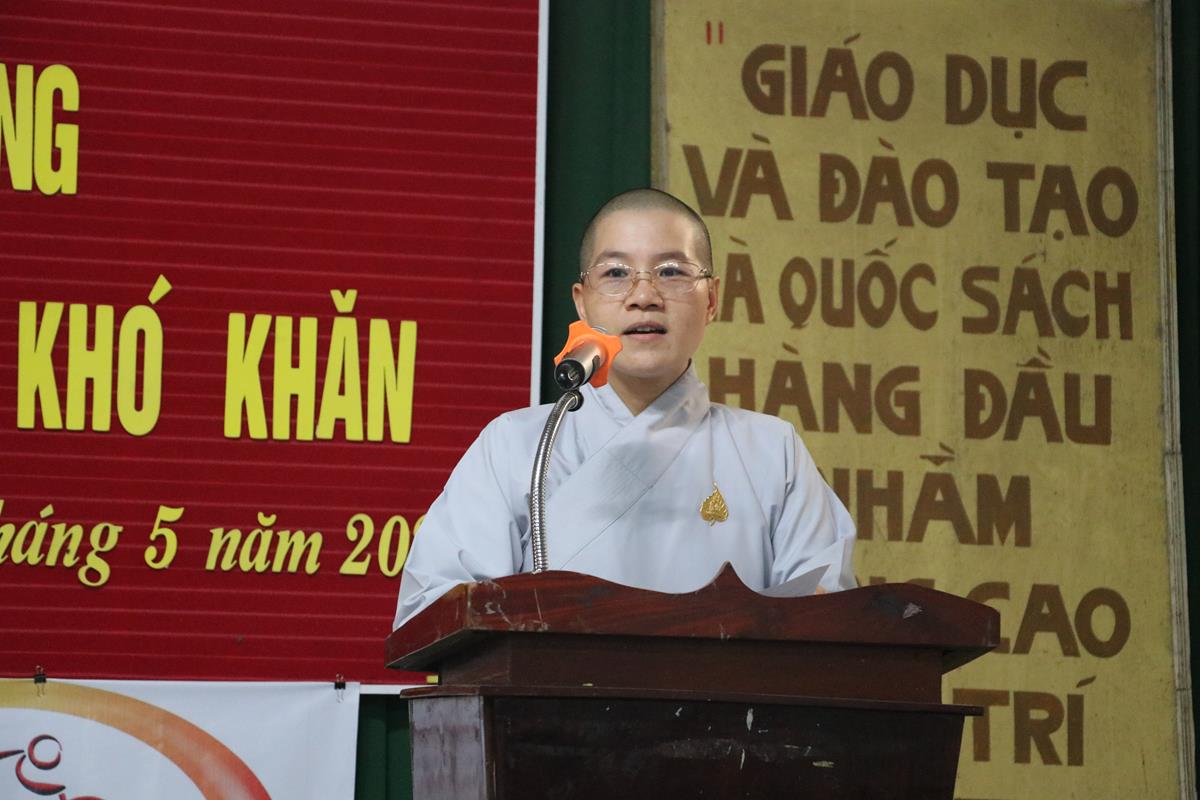 Phát biểu trong buổi lễ, Sư Cô Thích Nữ Liên Thảo cho biết nhờ có sự hỗ trợ từ CLB đạp xe và chạy bộ của các thành viên tại Việt Nam, Mỹ quốc cùng sự chung tay của quý Sư cô và các Phật tử đã tài trợ, góp phần gởi tới các em học sinh trên địa bàn huyện Đức Hòa có hoàn cảnh khó khăn. Dưới sự Chứng minh của Chư tôn đức Ban Thường trực BTS GHPGVN huyện Đức Hòa, Ban Hoằng Pháp và chính quyền sở tại đã tạo điều kiện để buổi lễ phát quà được thành công tốt đẹp. Sư cô cảm ơn giúp đỡ nhiệt tình của Ban giám hiệu trường và các giáo viên đã chung tay làm nên thiện sự ý nghĩa này.