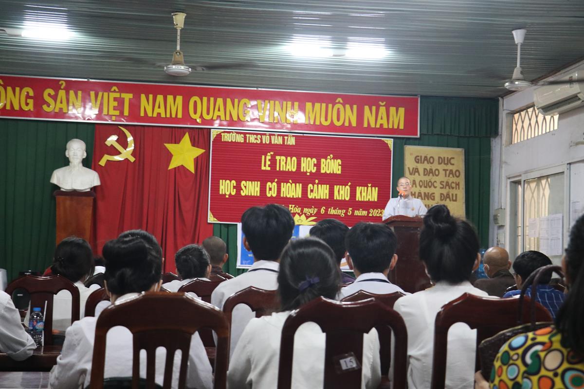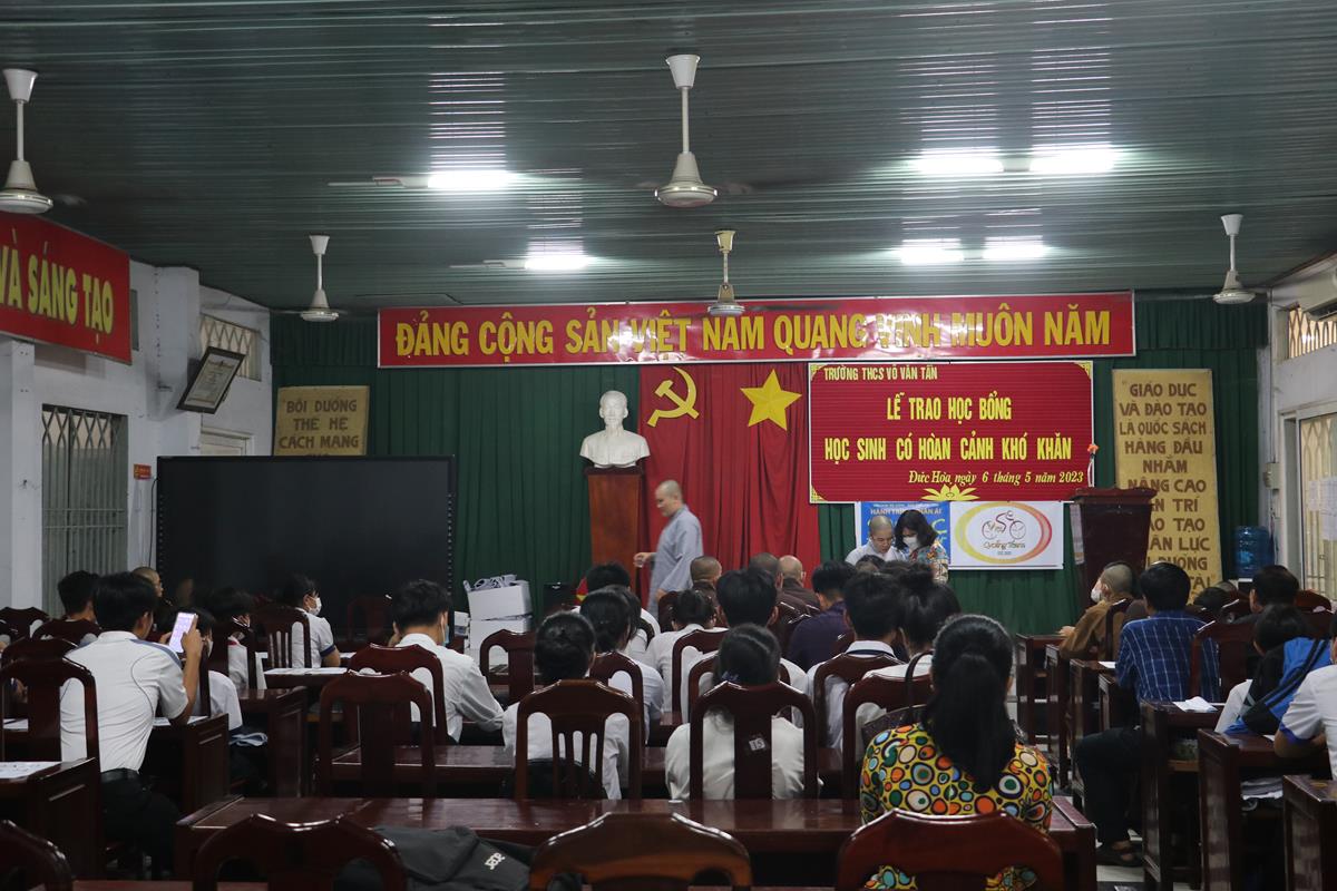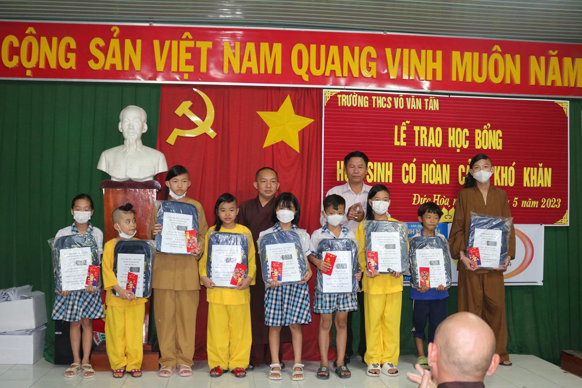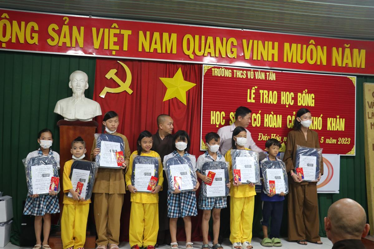 Chiều ngày 06 tháng 5 năm 2023 (nhằm ngày 17/03/Quý Mão ), tại Trường Trung Học Cơ Sở Võ Văn Tần, thị trấn Đức Hòa, huyện Đức Hòa, tỉnh Long An, Ban Trị sự GHPGVN huyện Đức Hòa phối hợp Ban Hoằng pháp GHPGVN huyện trao tặng 40 suất học bổng cho các em học sinh có hoàn cảnh khó khăn trên địa bàn huyện Đức Hòa.