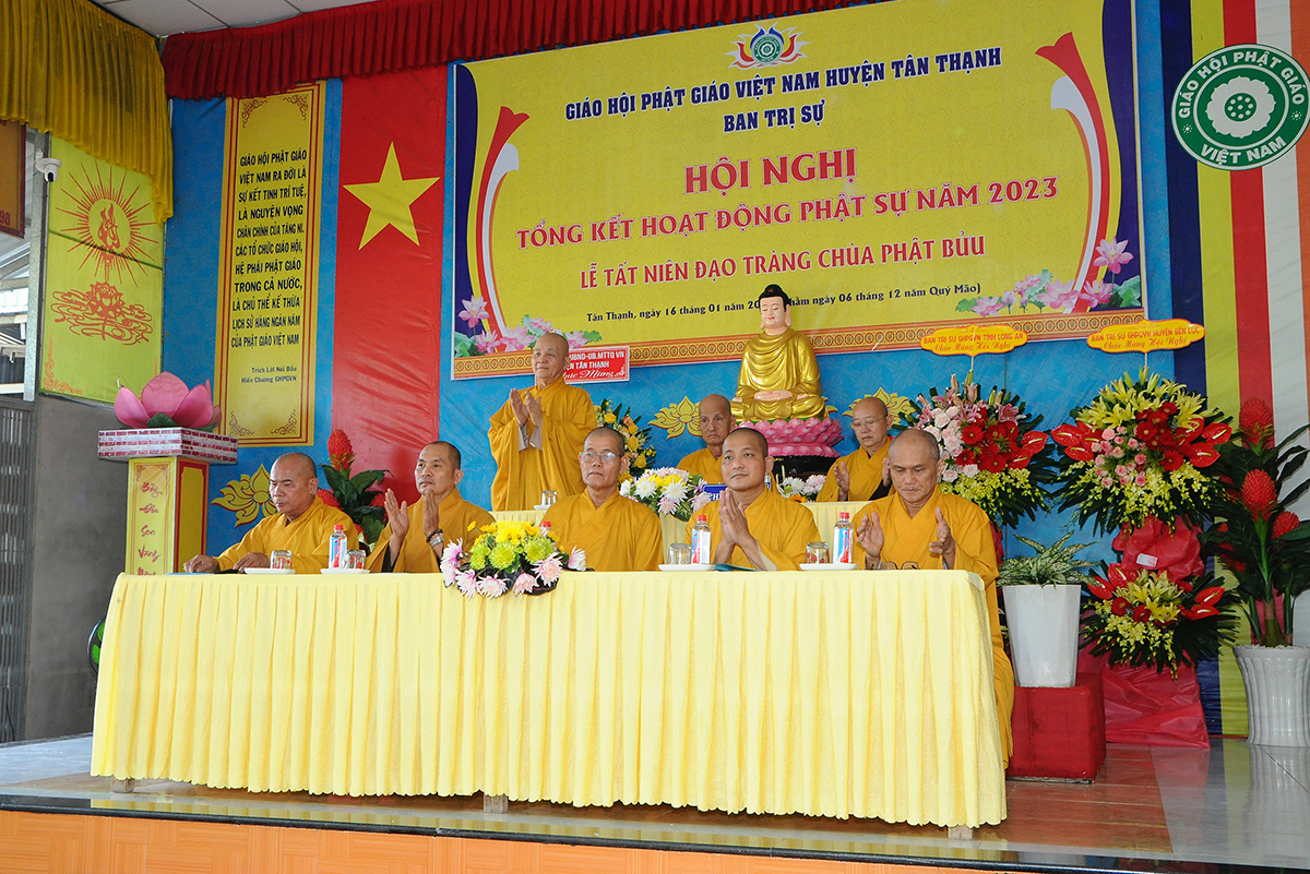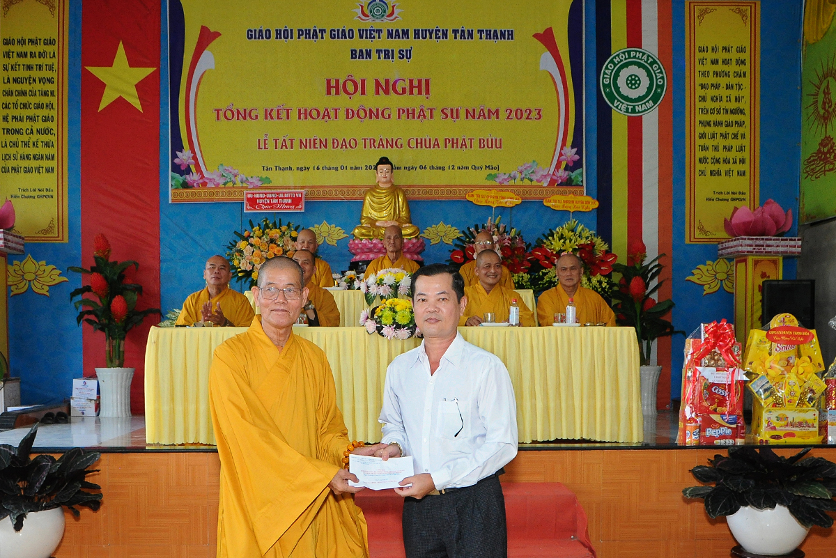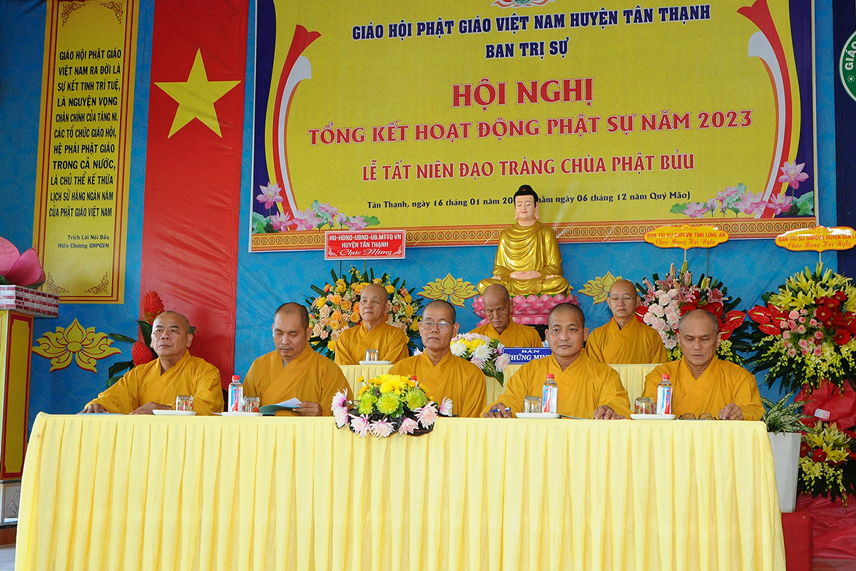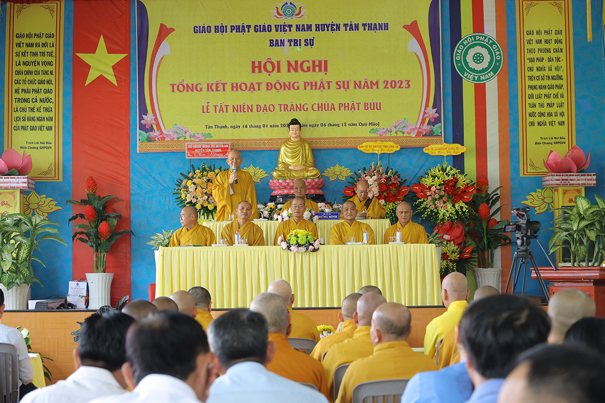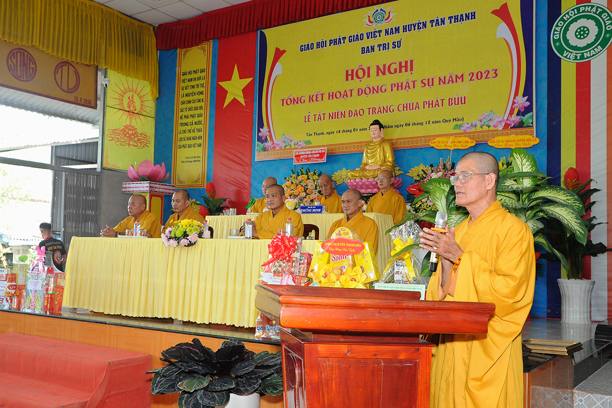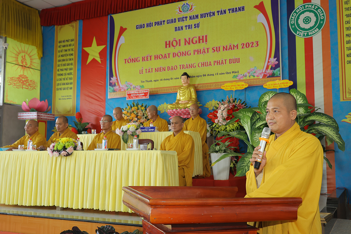 Đại diện Văn phòng, Đại đức Thích Nguyên Lộc – Chánh Thư ký BTS Phật giáo huyện trình bày báo cáo Tổng kết Phật sự năm 2023. Được sự chỉ đạo trực tiếp của chư Tôn đức giáo phẩm Ban Thường trực BTS GHPGVN tỉnh Long An, sự quan tâm giúp đỡ của các cấp Chính quyền, sự nhiệt tình ủng hộ của Tăng Ni, Phật tử, sự hỗ trợ của các mạnh thường quân trong huyện, tỉnh cũng như ngoài tỉnh nên công tác hoạt động Phật sự năm 2023 ổn định, đạt nhiều thành tựu quan trọng nỗi bật là công tác từ thiện xã hội. Theo đó, toàn huyện có 12 ngôi chùa, có 24 vị Tăng Ni. Ban Trị Sự GHPGVN huyện Tân Thạnh cùng chư Tôn đức Tăng Ni và Phật tử các tự viện đã tích cực tham gia vào những công tác từ thiện, an sinh xã hội. Tổng giá trị hoạt động từ thiện, an sinh xã hội đạt gần 20 tỷ đồng.