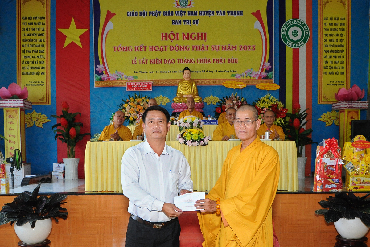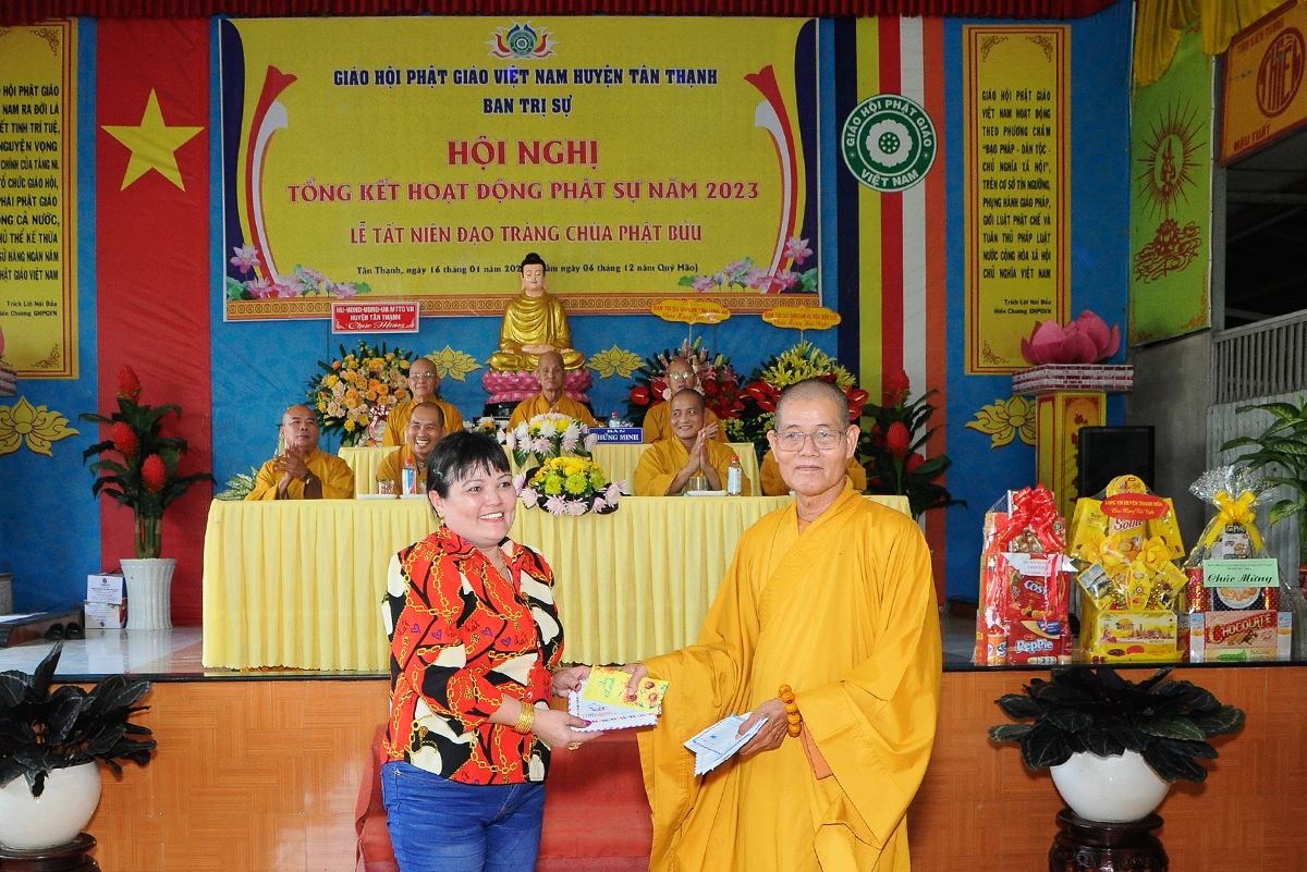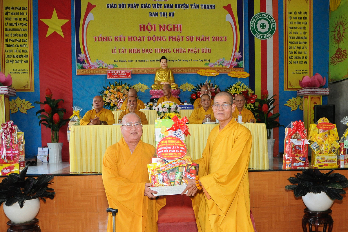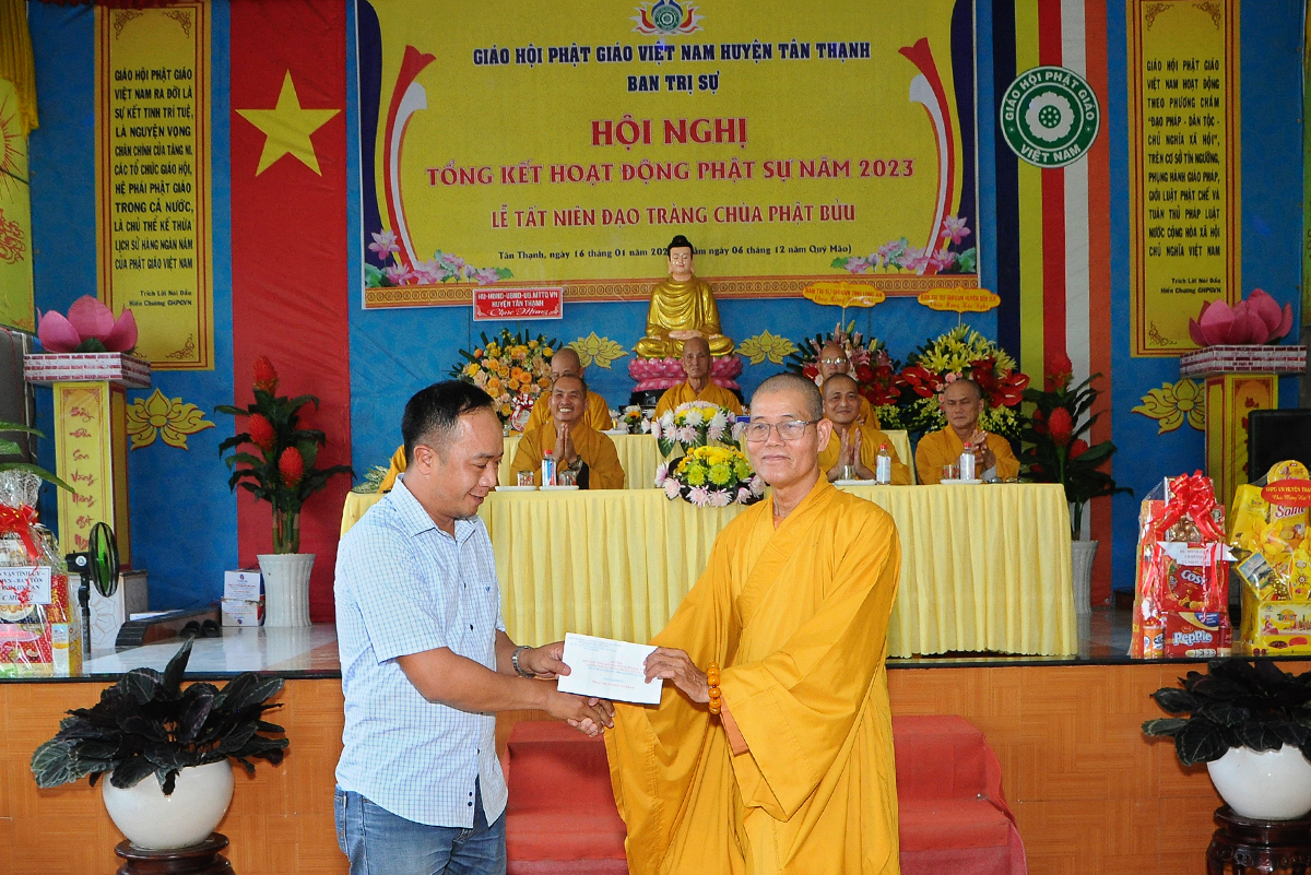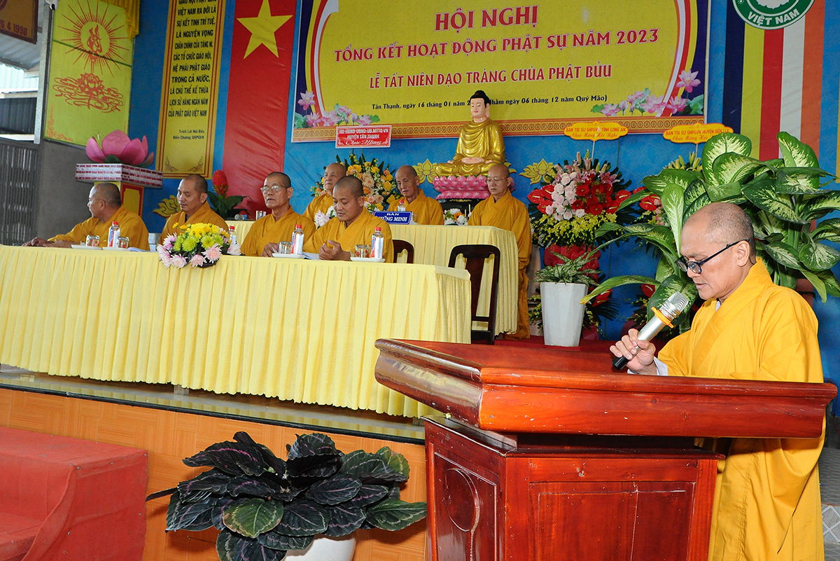 Đại diện Văn phòng, Đại đức Thích Nguyên Lộc – Chánh Thư ký BTS Phật giáo huyện trình bày báo cáo Tổng kết Phật sự năm 2023. Được sự chỉ đạo trực tiếp của chư Tôn đức giáo phẩm Ban Thường trực BTS GHPGVN tỉnh Long An, sự quan tâm giúp đỡ của các cấp Chính quyền, sự nhiệt tình ủng hộ của Tăng Ni, Phật tử, sự hỗ trợ của các mạnh thường quân trong huyện, tỉnh cũng như ngoài tỉnh nên công tác hoạt động Phật sự năm 2023 ổn định, đạt nhiều thành tựu quan trọng nỗi bật là công tác từ thiện xã hội. Theo đó, toàn huyện có 12 ngôi chùa, có 24 vị Tăng Ni. Ban Trị Sự GHPGVN huyện Tân Thạnh cùng chư Tôn đức Tăng Ni và Phật tử các tự viện đã tích cực tham gia vào những công tác từ thiện, an sinh xã hội. Tổng giá trị hoạt động từ thiện, an sinh xã hội đạt gần 20 tỷ đồng.