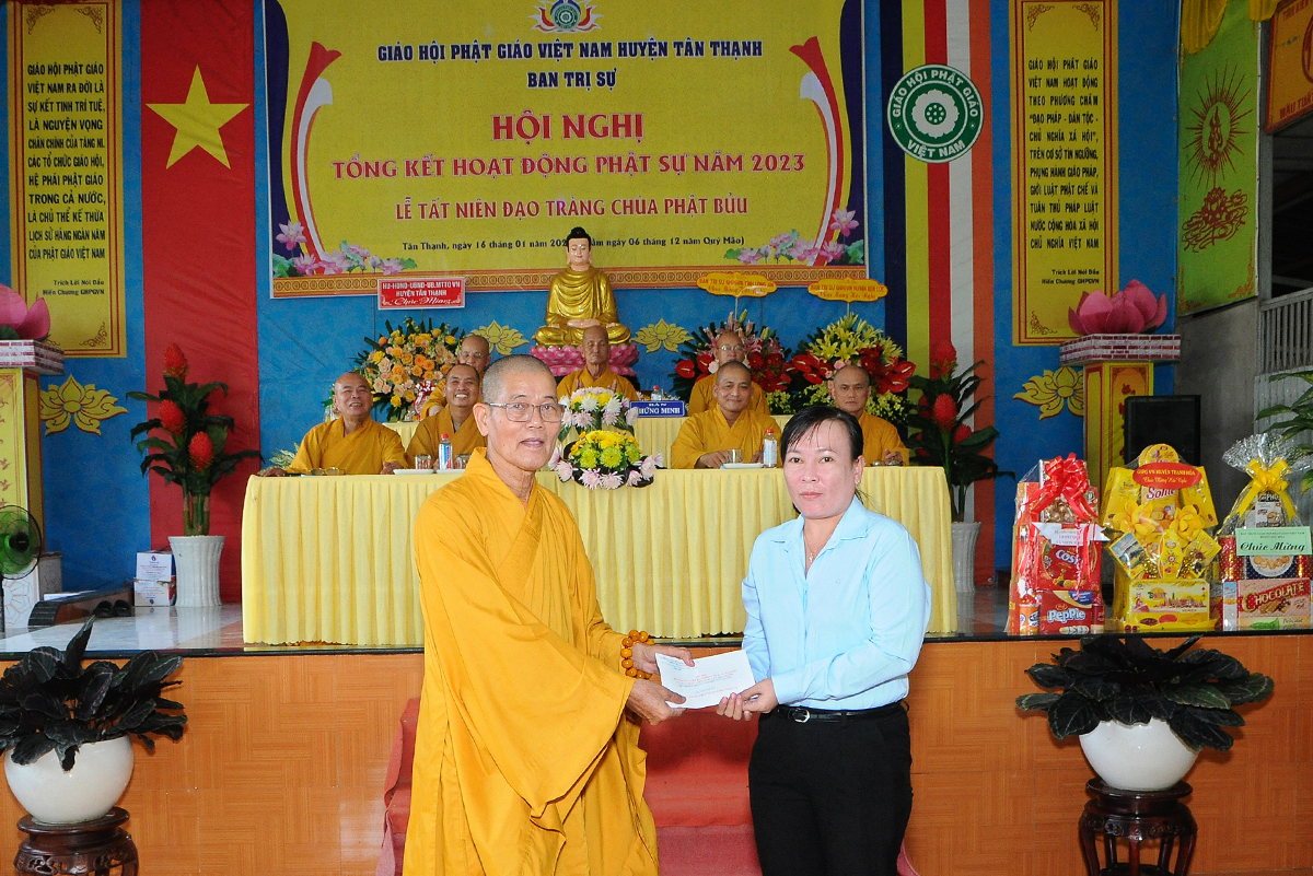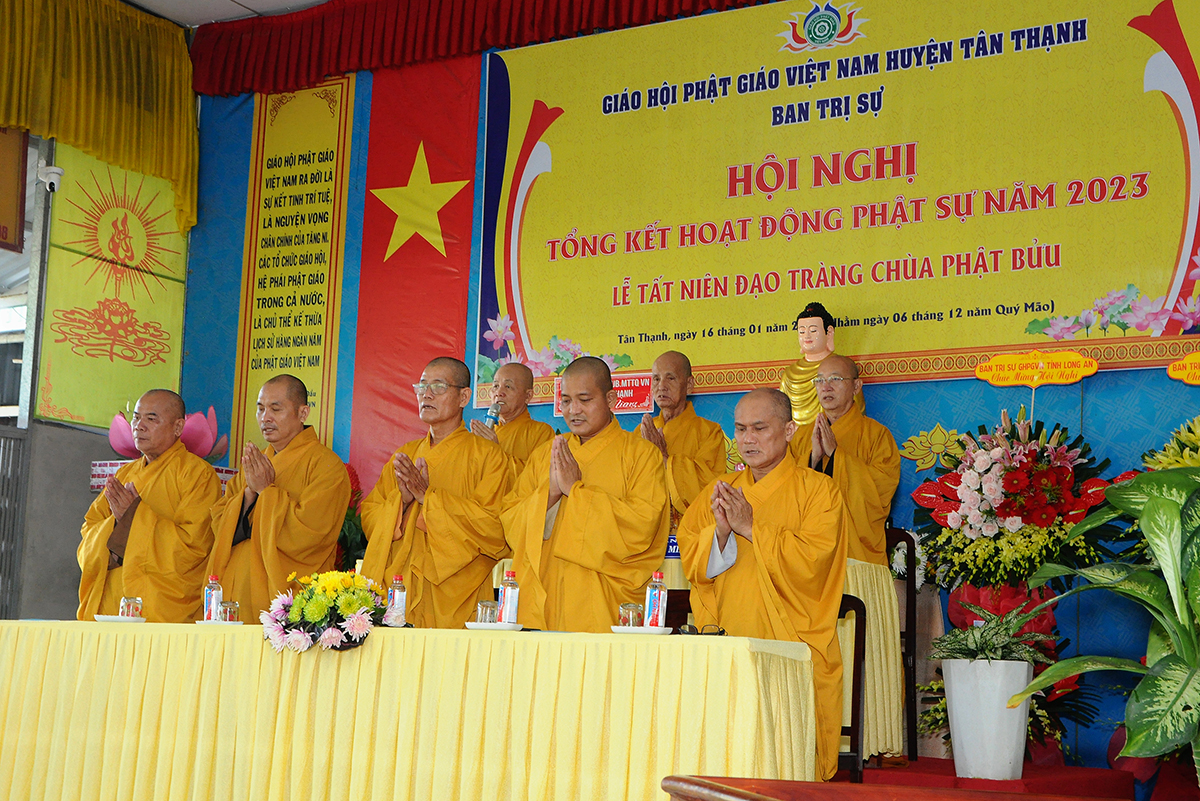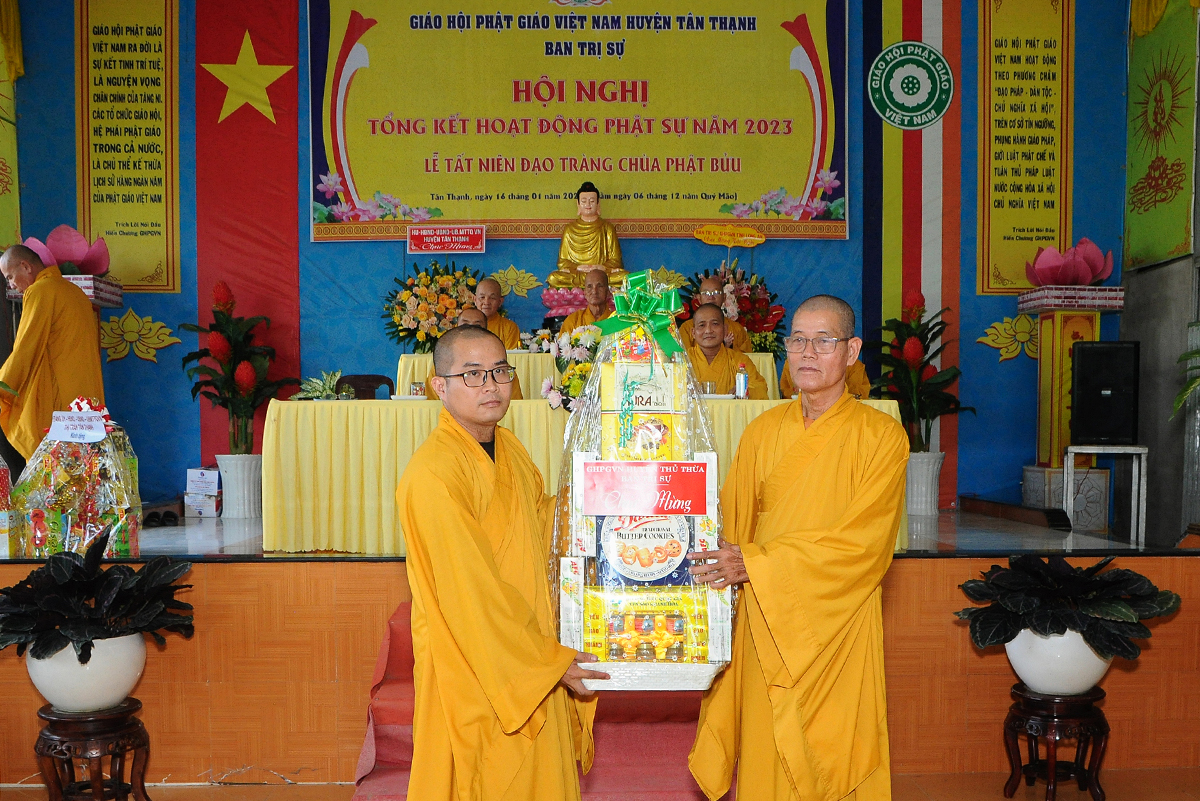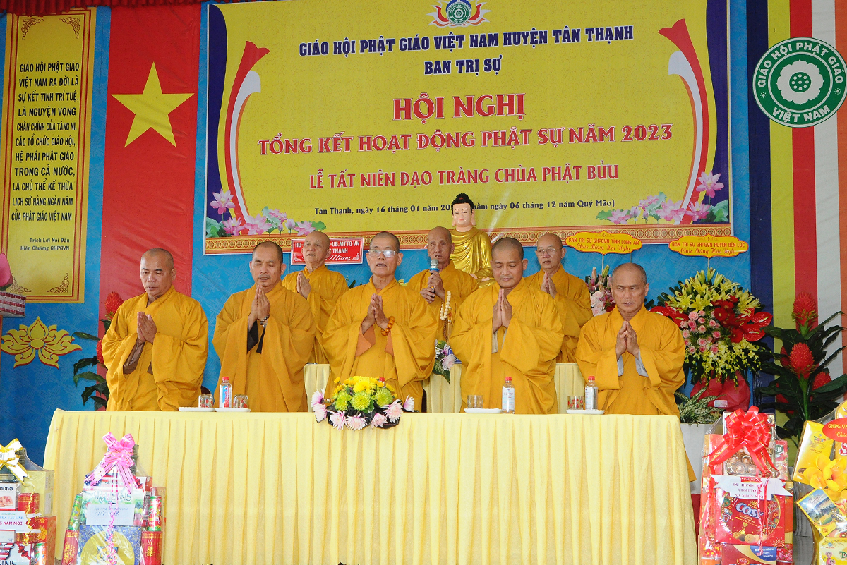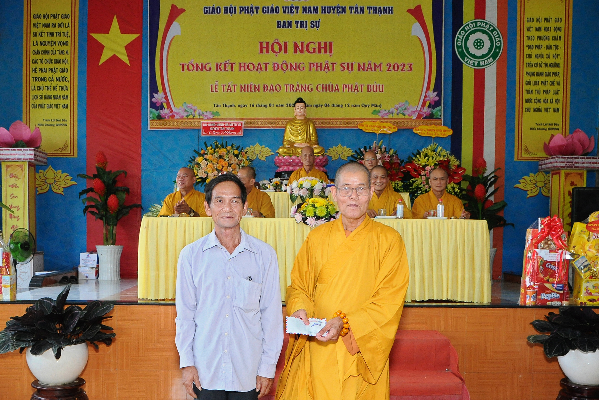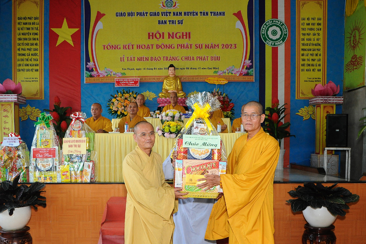 Đại diện Văn phòng, Đại đức Thích Nguyên Lộc – Chánh Thư ký BTS Phật giáo huyện trình bày báo cáo Tổng kết Phật sự năm 2023. Được sự chỉ đạo trực tiếp của chư Tôn đức giáo phẩm Ban Thường trực BTS GHPGVN tỉnh Long An, sự quan tâm giúp đỡ của các cấp Chính quyền, sự nhiệt tình ủng hộ của Tăng Ni, Phật tử, sự hỗ trợ của các mạnh thường quân trong huyện, tỉnh cũng như ngoài tỉnh nên công tác hoạt động Phật sự năm 2023 ổn định, đạt nhiều thành tựu quan trọng nỗi bật là công tác từ thiện xã hội. Theo đó, toàn huyện có 12 ngôi chùa, có 24 vị Tăng Ni. Ban Trị Sự GHPGVN huyện Tân Thạnh cùng chư Tôn đức Tăng Ni và Phật tử các tự viện đã tích cực tham gia vào những công tác từ thiện, an sinh xã hội. Tổng giá trị hoạt động từ thiện, an sinh xã hội đạt gần 20 tỷ đồng.