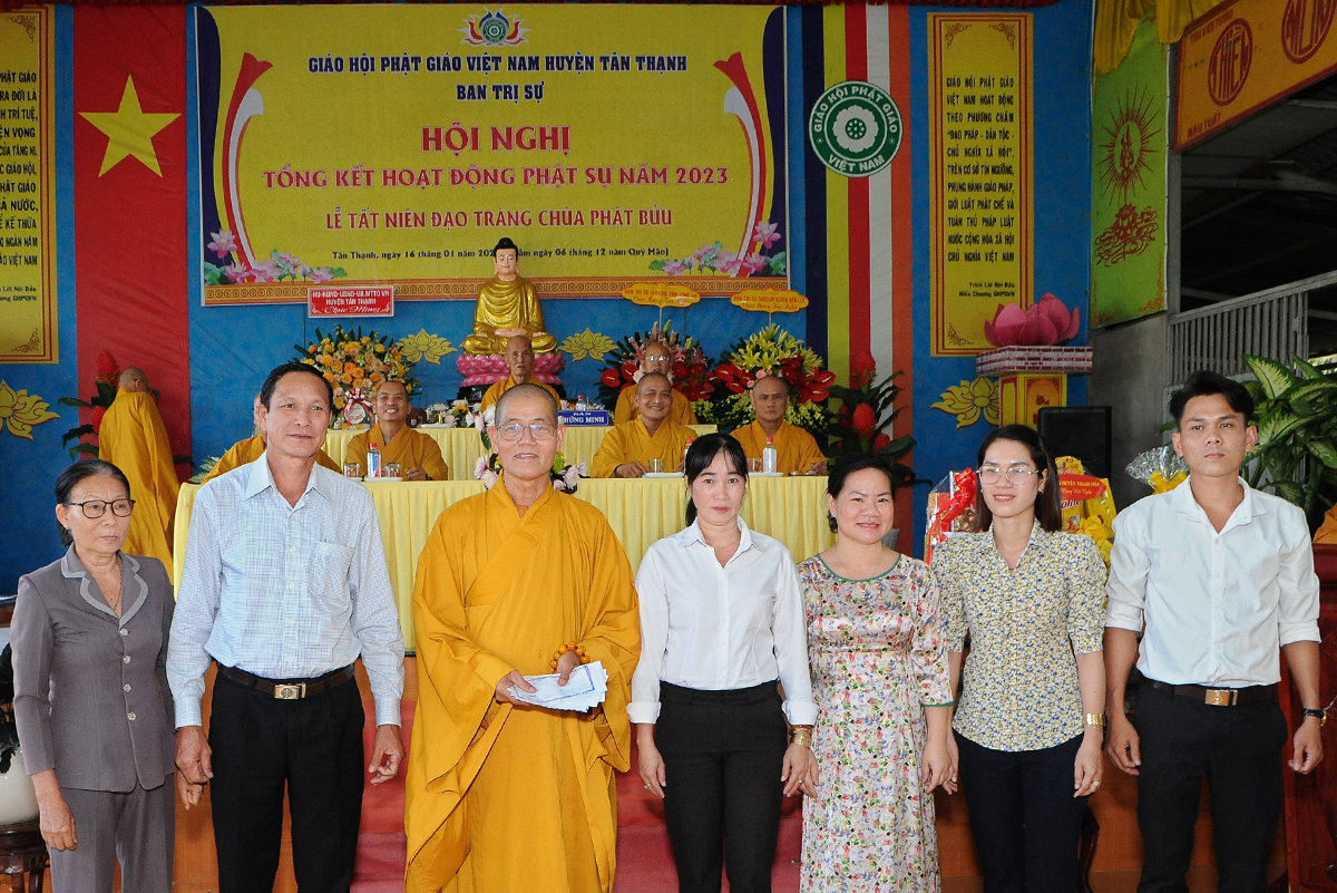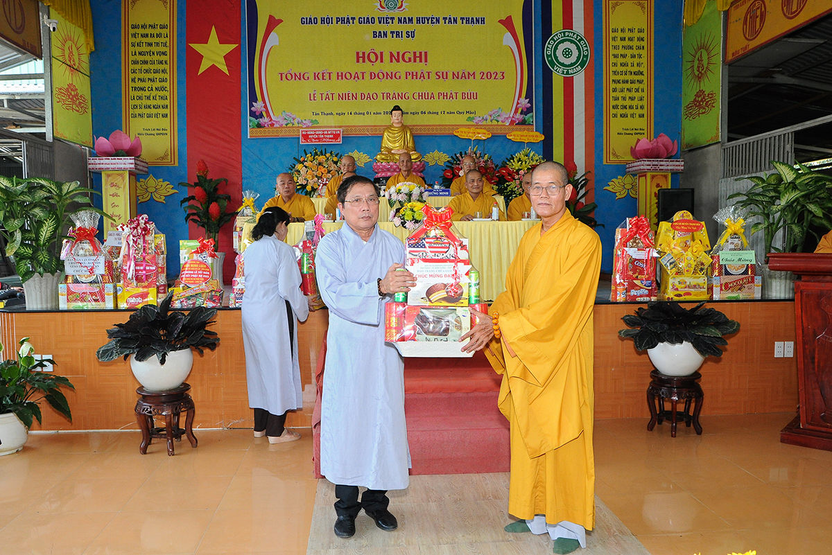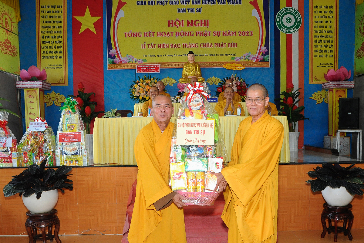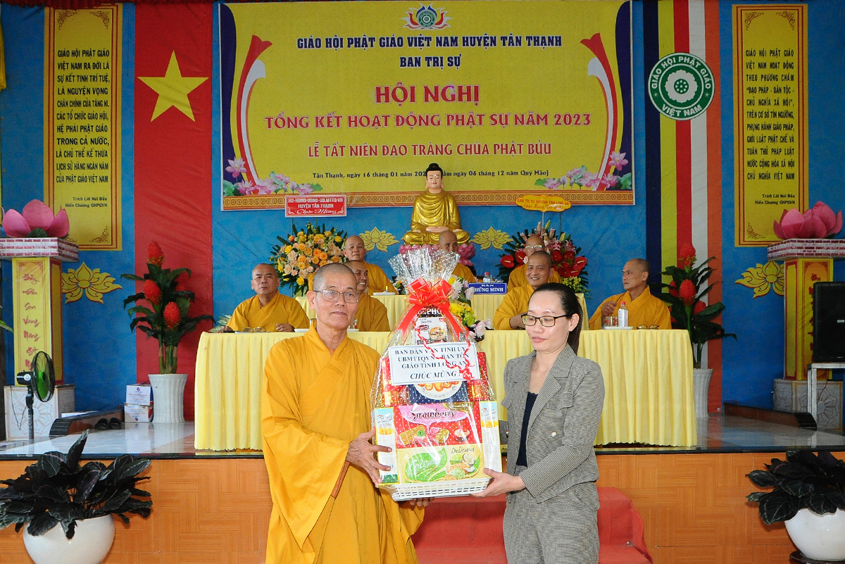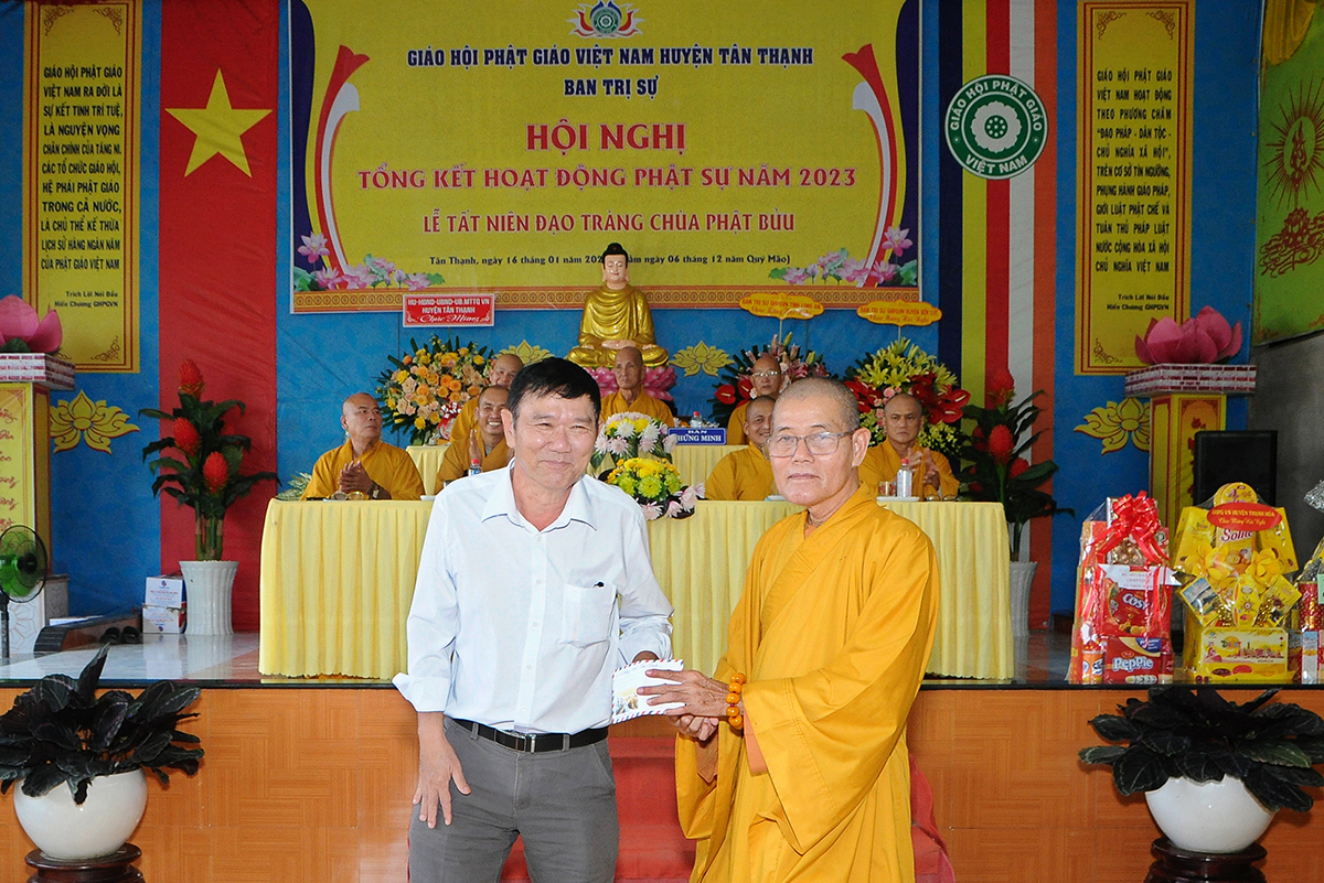 Đại diện Văn phòng, Đại đức Thích Nguyên Lộc – Chánh Thư ký BTS Phật giáo huyện trình bày báo cáo Tổng kết Phật sự năm 2023. Được sự chỉ đạo trực tiếp của chư Tôn đức giáo phẩm Ban Thường trực BTS GHPGVN tỉnh Long An, sự quan tâm giúp đỡ của các cấp Chính quyền, sự nhiệt tình ủng hộ của Tăng Ni, Phật tử, sự hỗ trợ của các mạnh thường quân trong huyện, tỉnh cũng như ngoài tỉnh nên công tác hoạt động Phật sự năm 2023 ổn định, đạt nhiều thành tựu quan trọng nỗi bật là công tác từ thiện xã hội. Theo đó, toàn huyện có 12 ngôi chùa, có 24 vị Tăng Ni. Ban Trị Sự GHPGVN huyện Tân Thạnh cùng chư Tôn đức Tăng Ni và Phật tử các tự viện đã tích cực tham gia vào những công tác từ thiện, an sinh xã hội. Tổng giá trị hoạt động từ thiện, an sinh xã hội đạt gần 20 tỷ đồng.