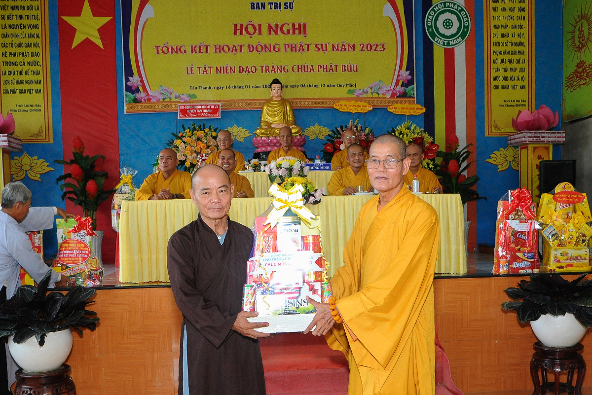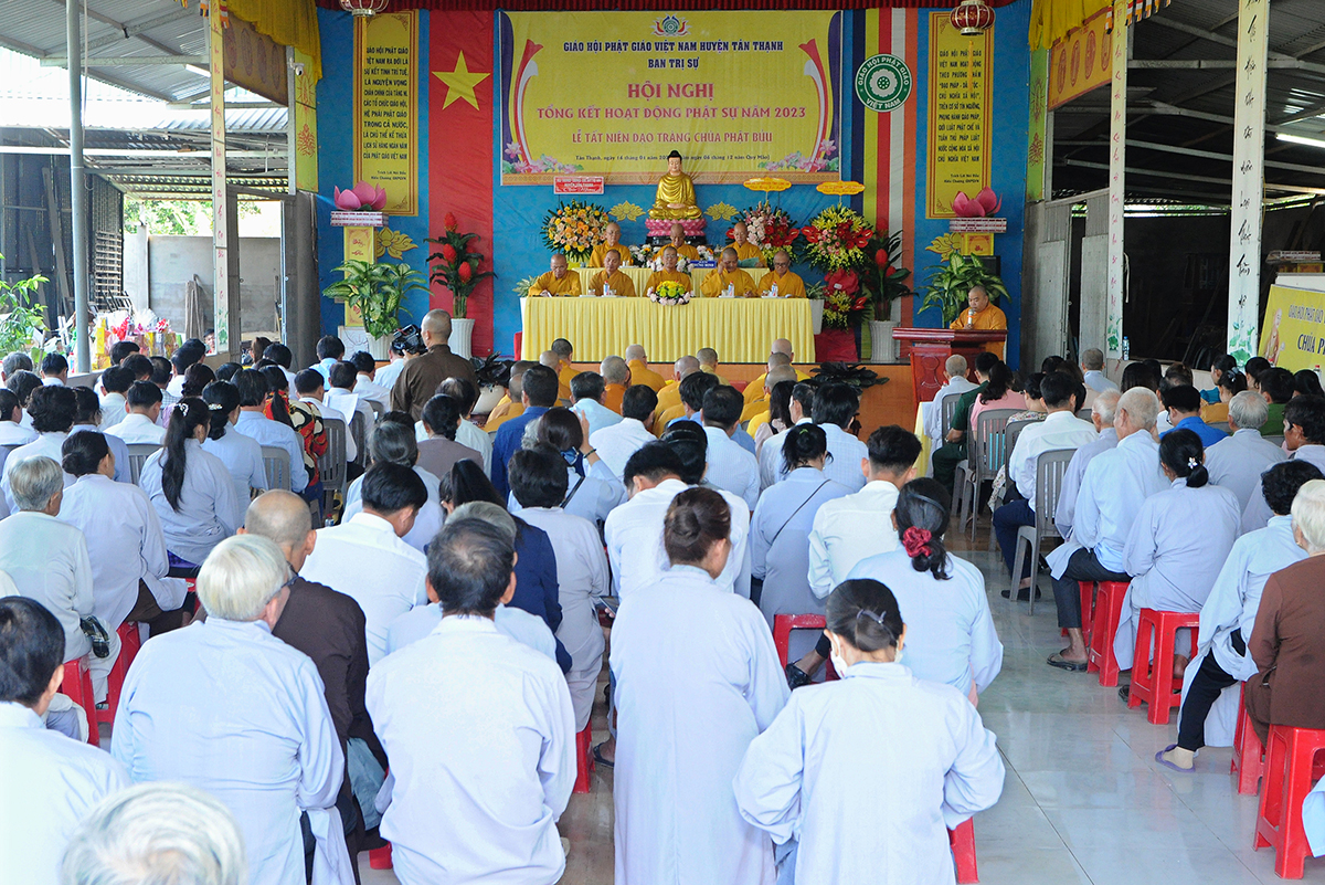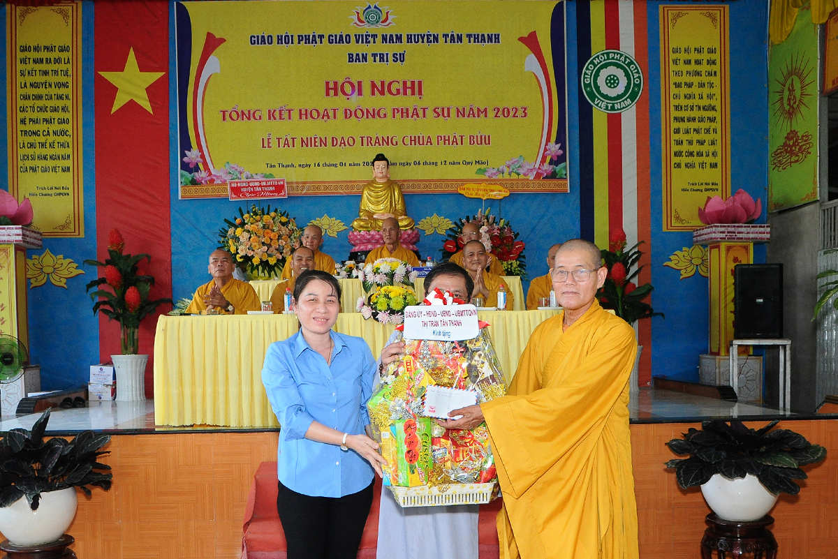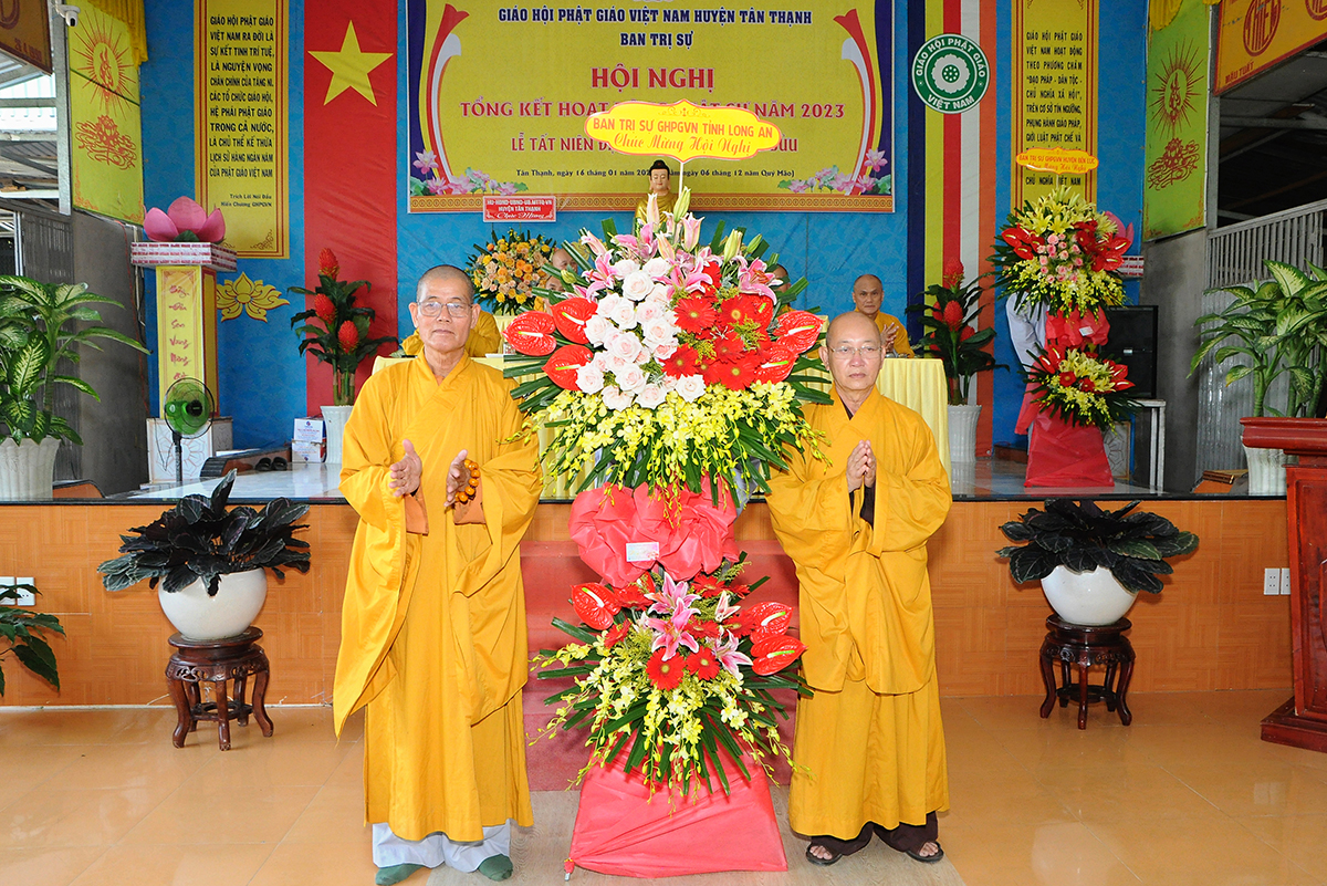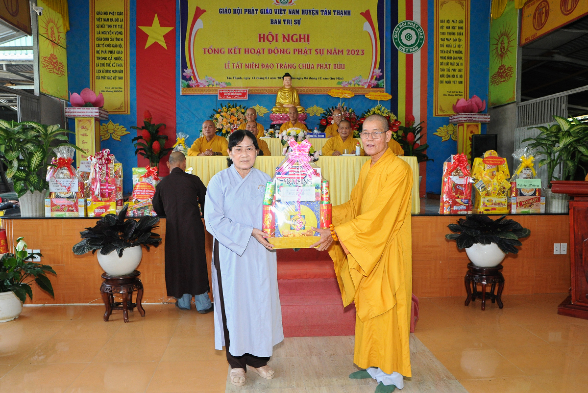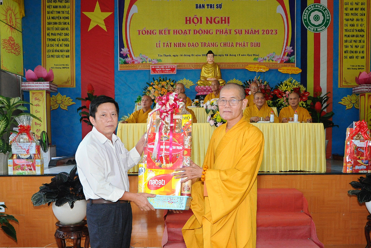 Đại diện Văn phòng, Đại đức Thích Nguyên Lộc – Chánh Thư ký BTS Phật giáo huyện trình bày báo cáo Tổng kết Phật sự năm 2023. Được sự chỉ đạo trực tiếp của chư Tôn đức giáo phẩm Ban Thường trực BTS GHPGVN tỉnh Long An, sự quan tâm giúp đỡ của các cấp Chính quyền, sự nhiệt tình ủng hộ của Tăng Ni, Phật tử, sự hỗ trợ của các mạnh thường quân trong huyện, tỉnh cũng như ngoài tỉnh nên công tác hoạt động Phật sự năm 2023 ổn định, đạt nhiều thành tựu quan trọng nỗi bật là công tác từ thiện xã hội. Theo đó, toàn huyện có 12 ngôi chùa, có 24 vị Tăng Ni. Ban Trị Sự GHPGVN huyện Tân Thạnh cùng chư Tôn đức Tăng Ni và Phật tử các tự viện đã tích cực tham gia vào những công tác từ thiện, an sinh xã hội. Tổng giá trị hoạt động từ thiện, an sinh xã hội đạt gần 20 tỷ đồng.