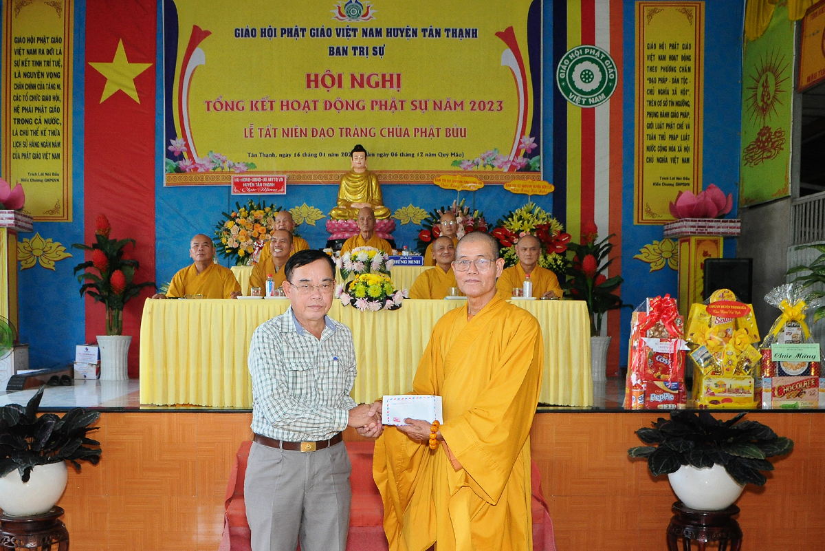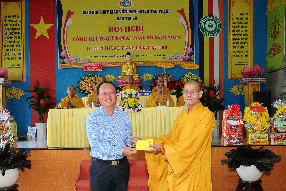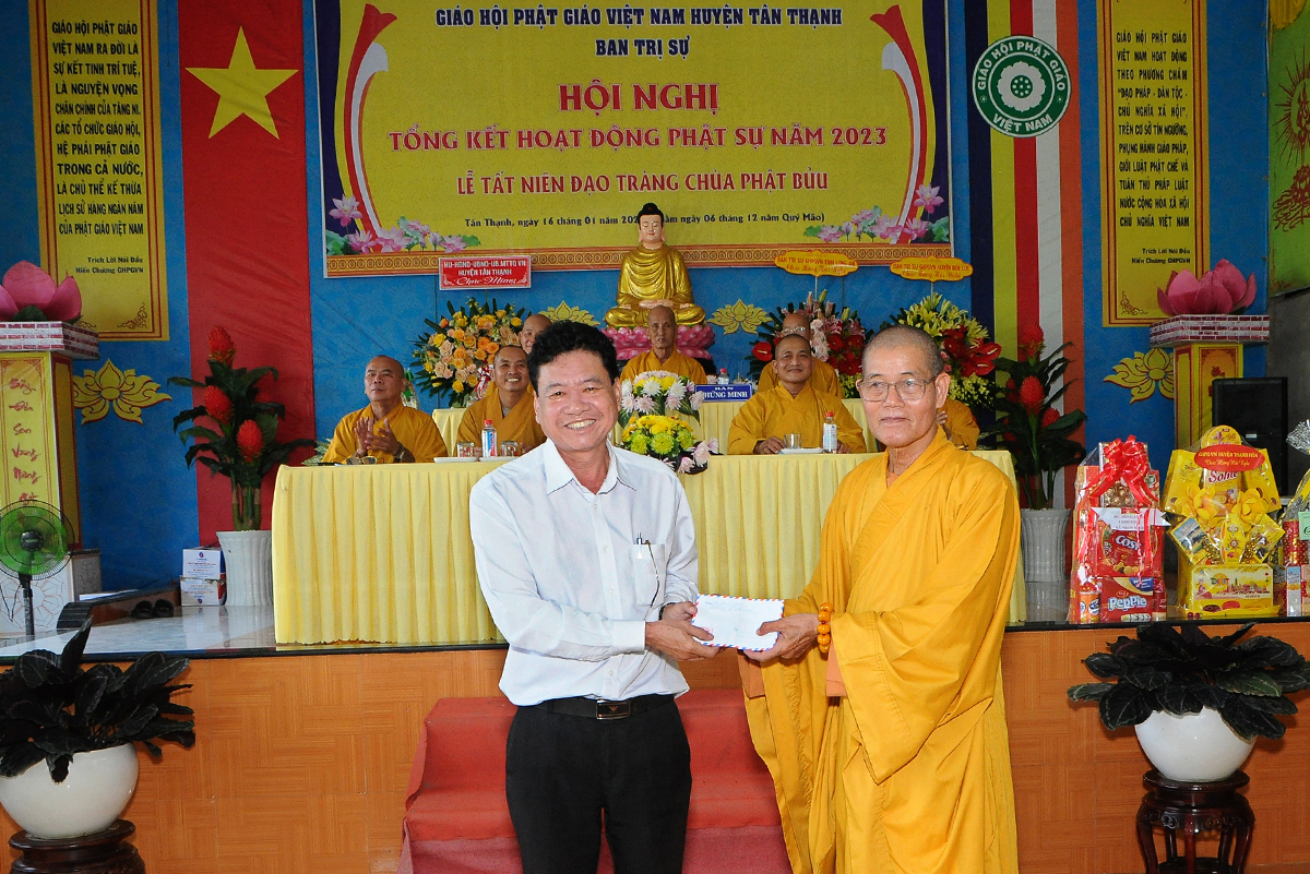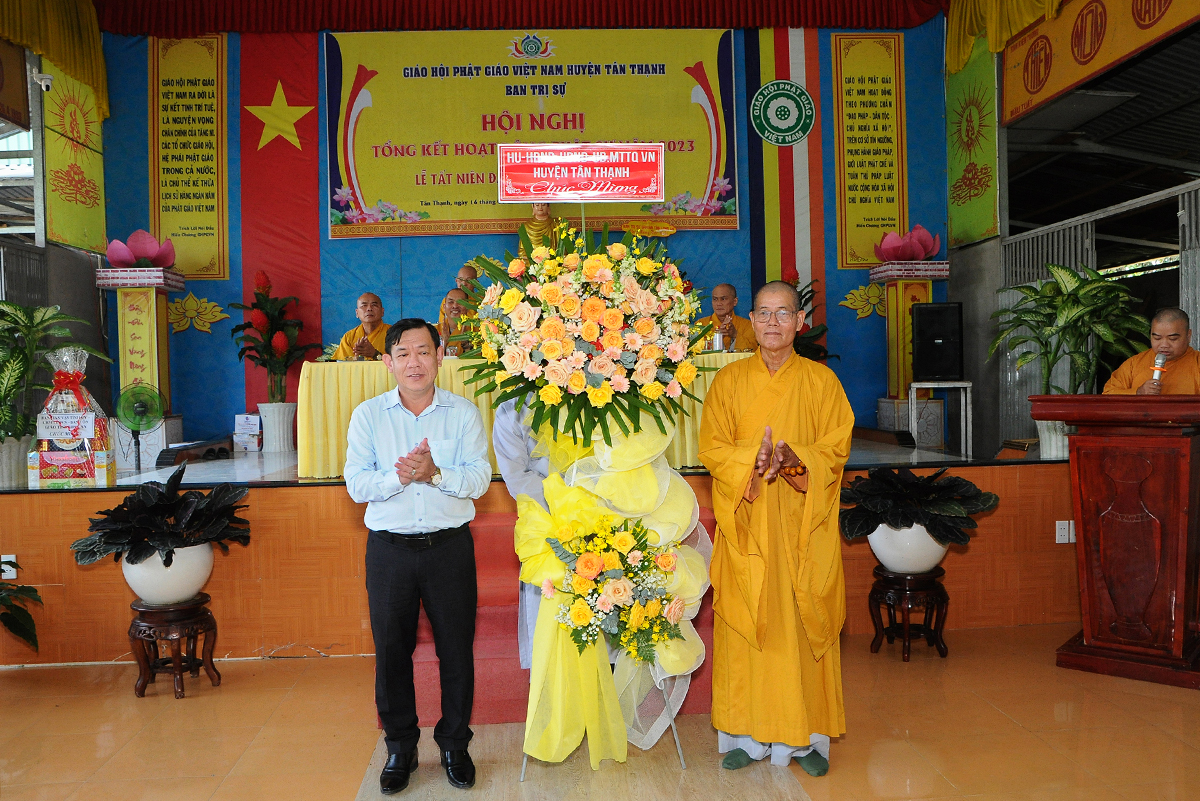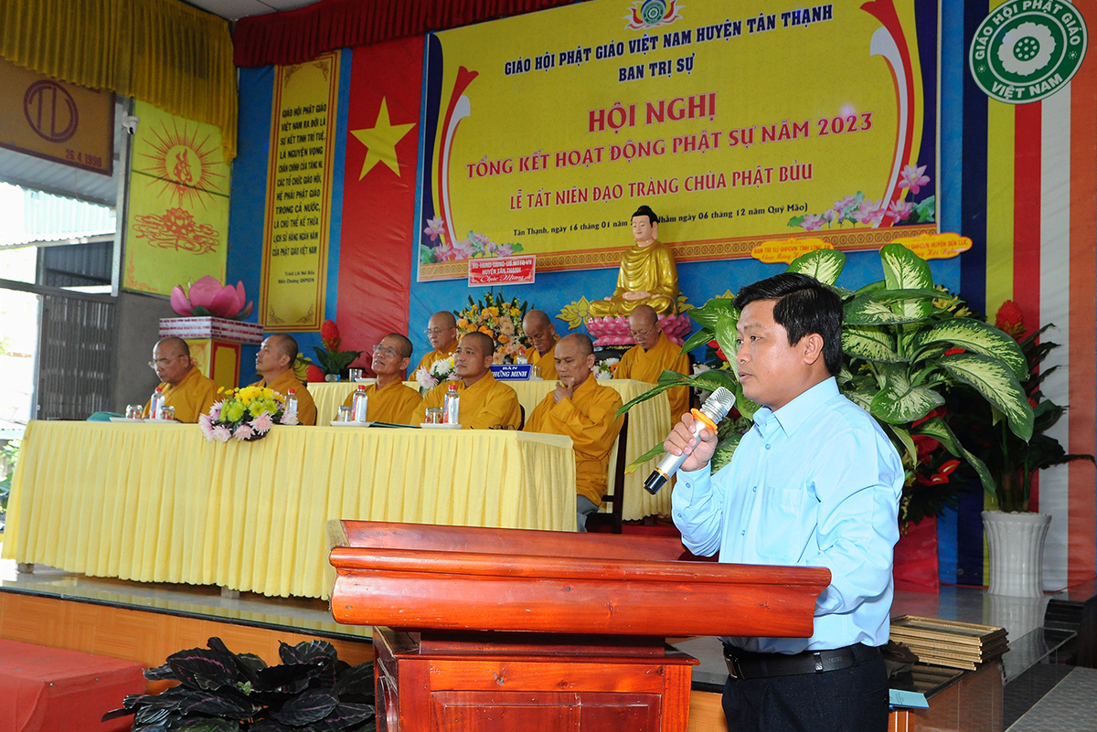 Phát biểu tại hội nghị, ông Võ Minh Dương – Phó Chủ tịch UBMTTQVN huyện Tân Thạnh đánh giá cao về tổ chức sinh hoạt Giáo hội Phật giáo huyện trong năm 2023 và chúc mừng các thành tựu tiêu biểu mà Phật giáo đạt được, đặc biệt là về công tác từ thiện, an sinh xã hội.