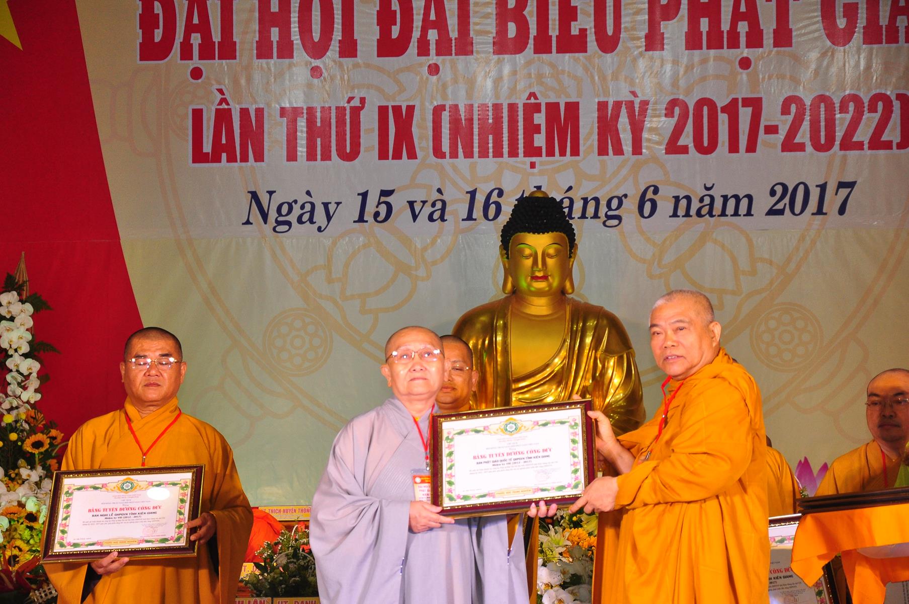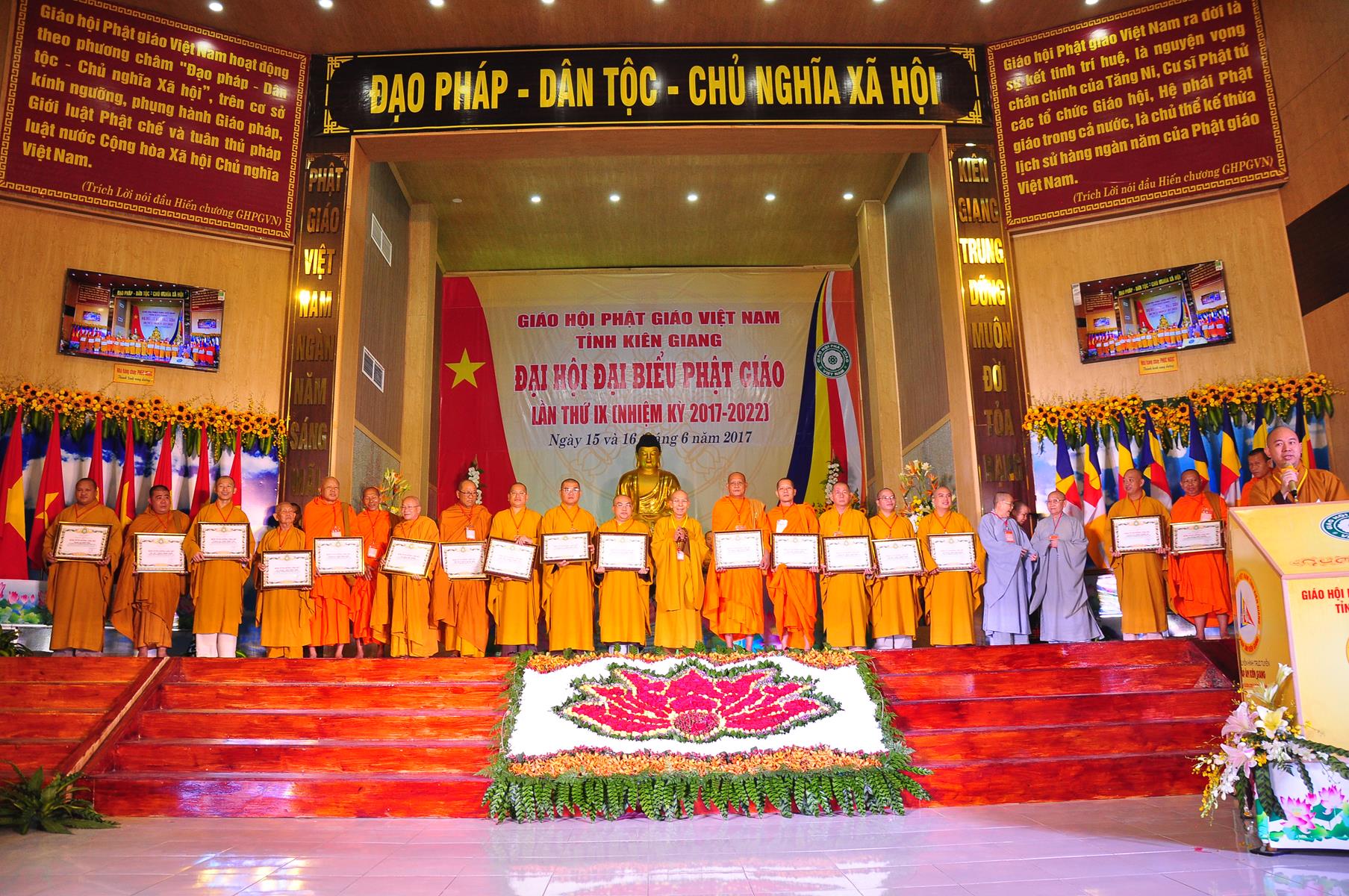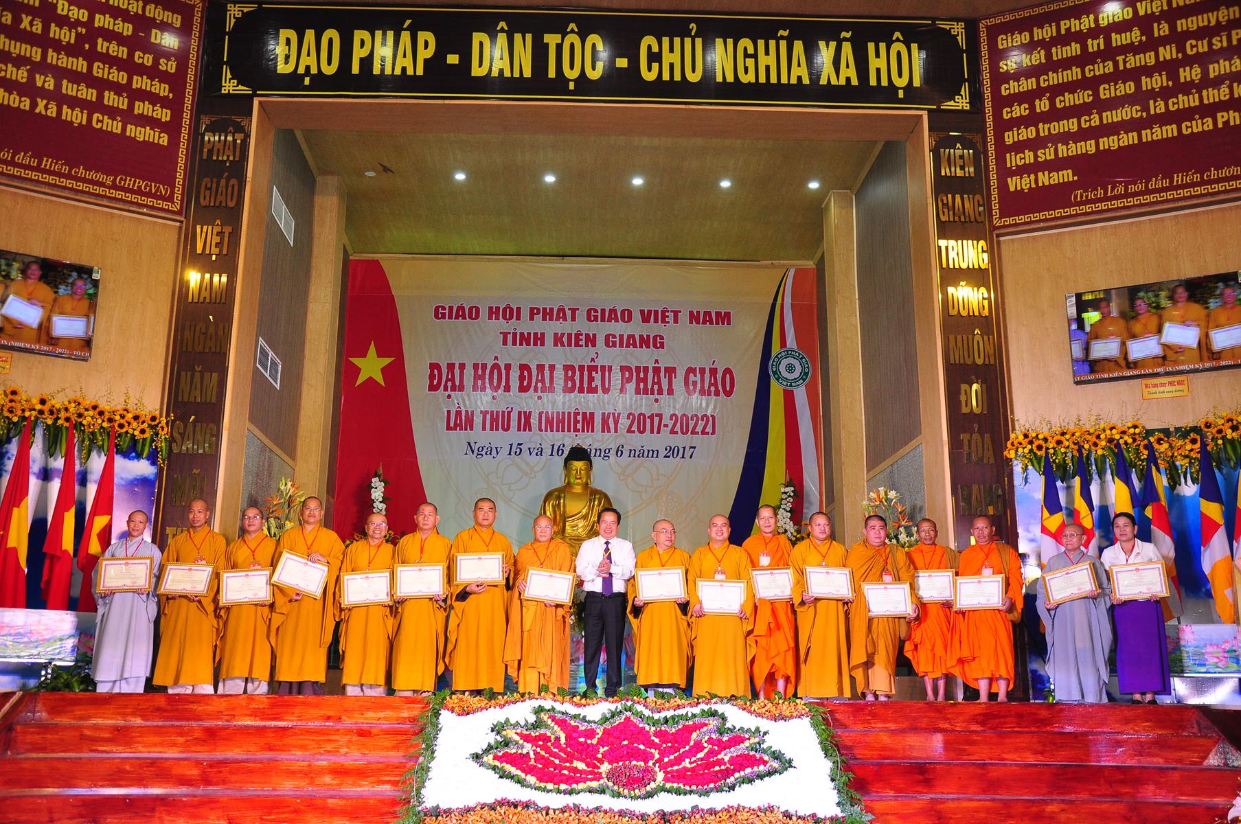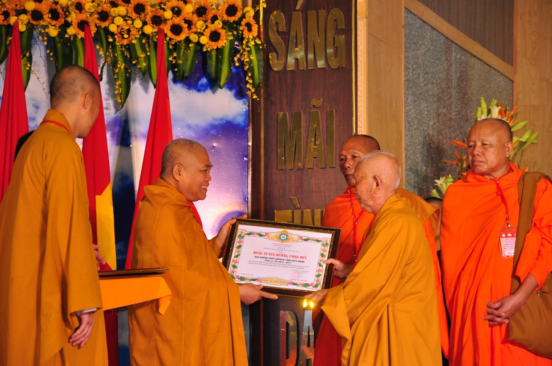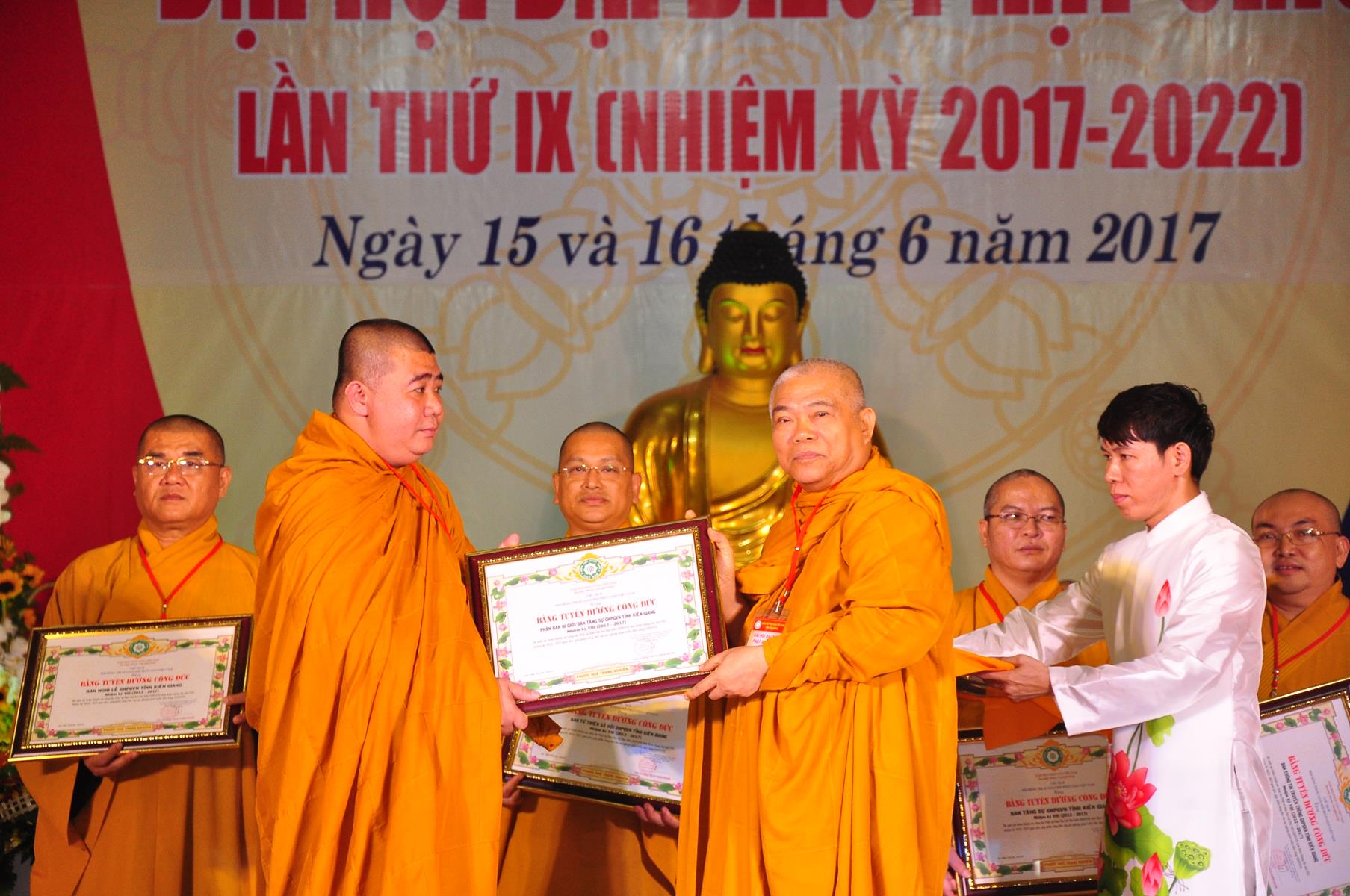 Tại Đại hội, Thường trực HĐTS quyết định tặng Bằng Tuyên Dương Công Đức cho 13 tập thể và 35 cá nhân xuất sắc trong hoạt động Phật sự nhiệm kỳ qua; Đồng thời, TT HĐTS tặng bằng Tuyên Dương Công Đức cho Ủy ban MTTQVN tỉnh Kiên Giang.